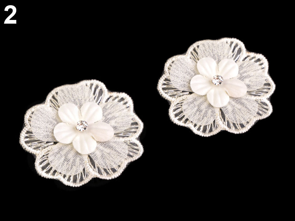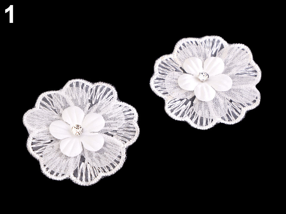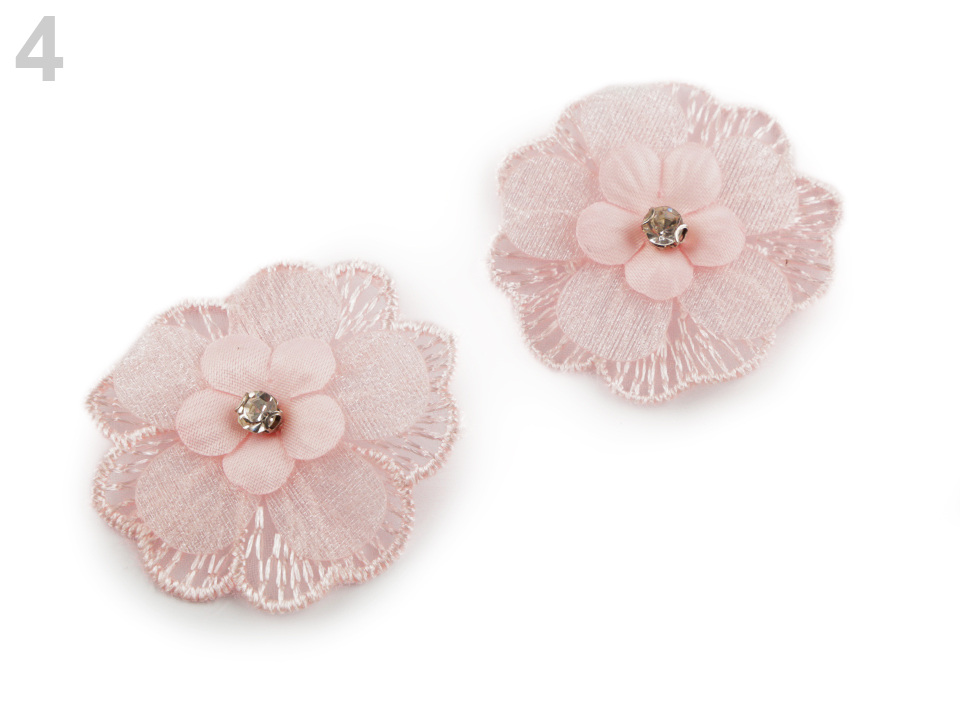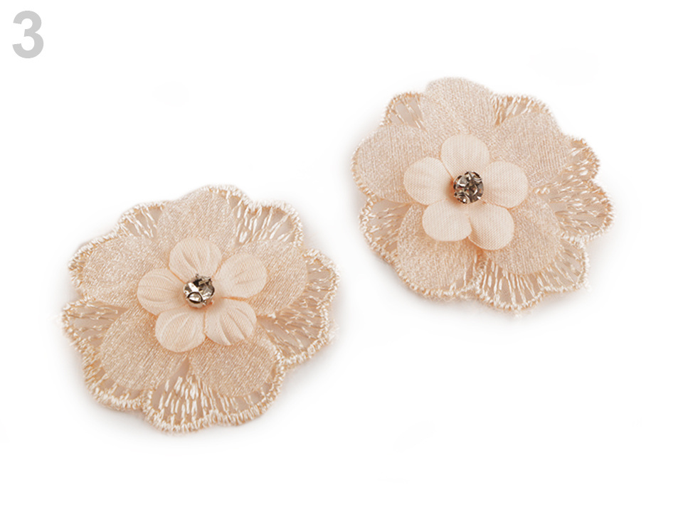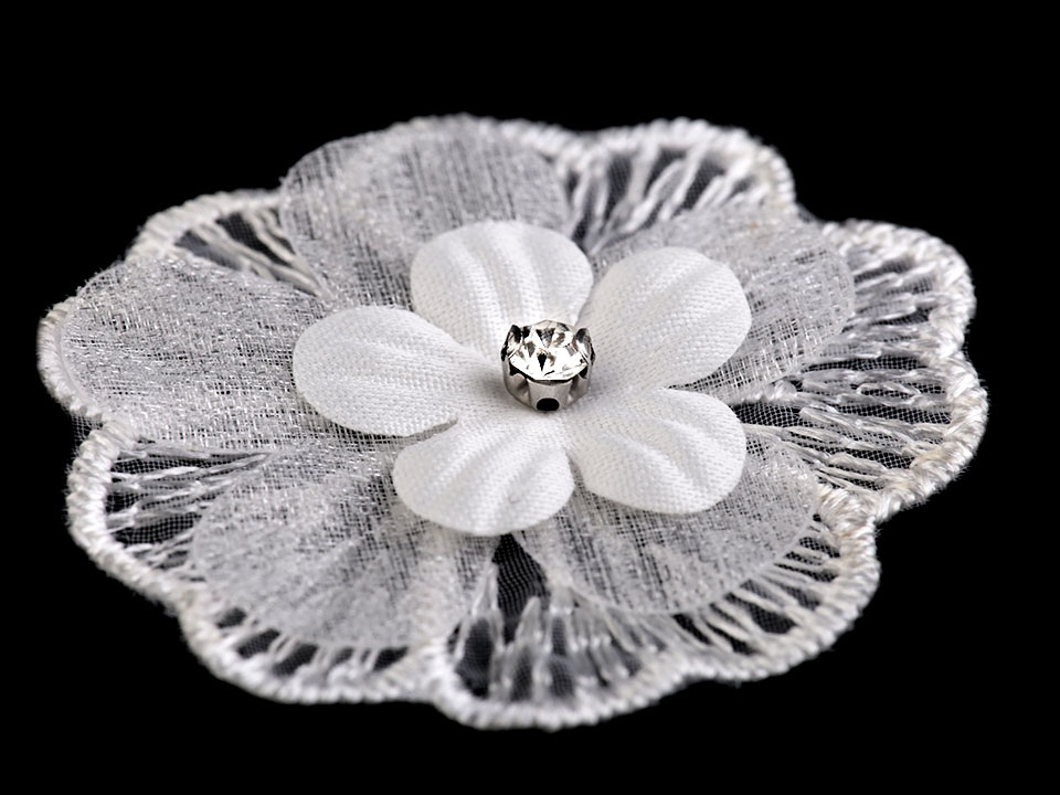 Textilní květ s broušeným kamínkem, přišitým uprostřed, vypadá jemně a romanticky. Díky kamínku se krásně třpytí. Květ je složený ze 3 designů různě velkých květů, působí bohatě a decentně zároveň.
