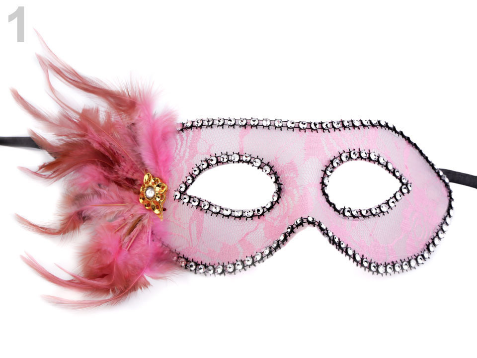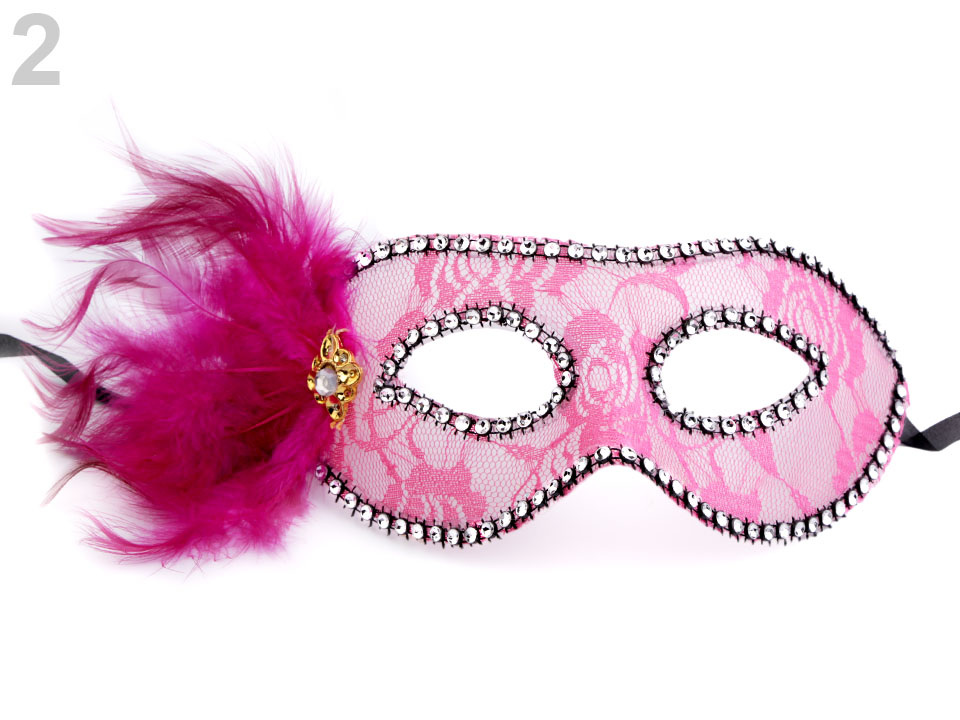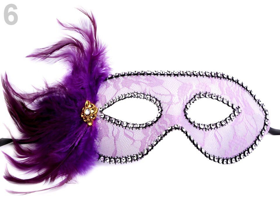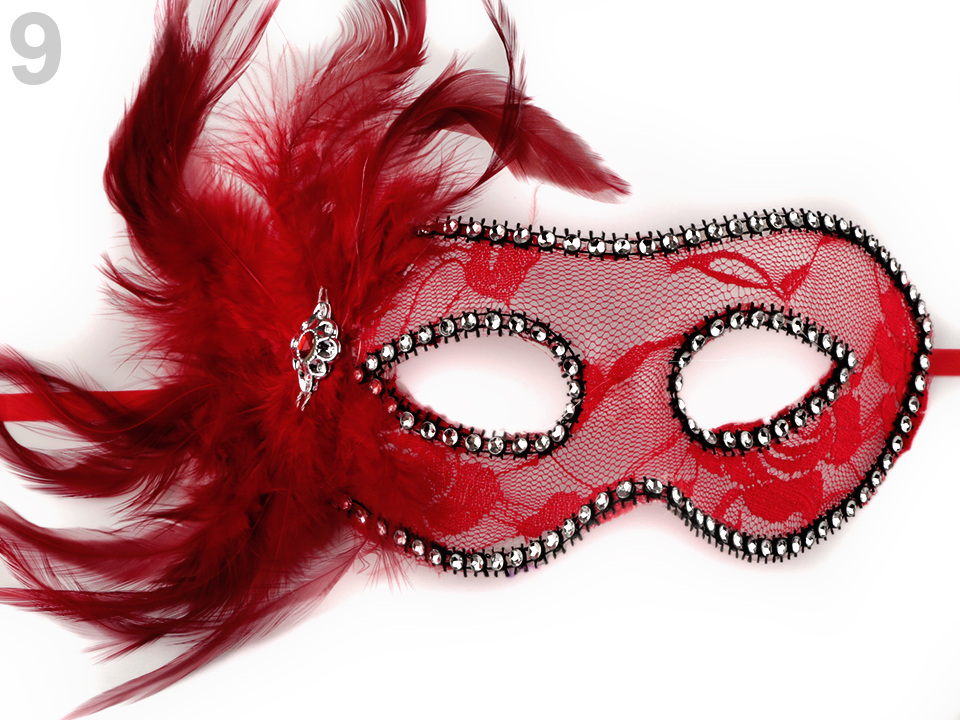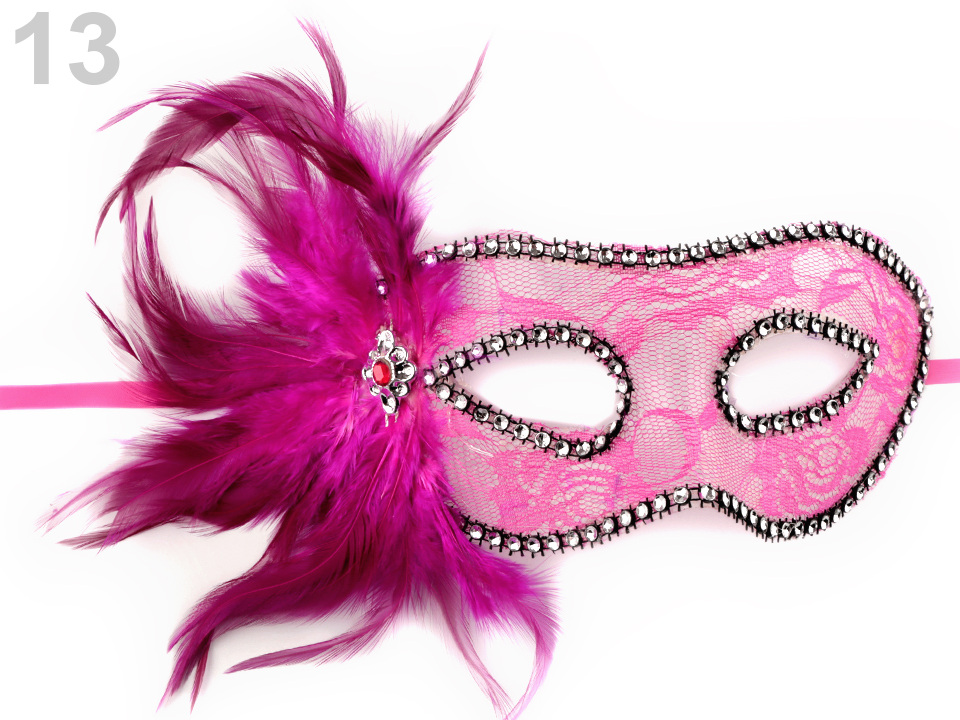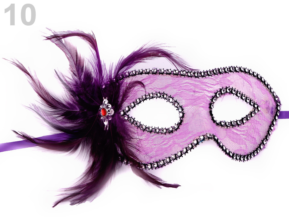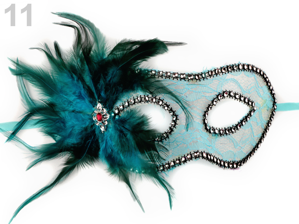 Karnevalová škraboška je vyrobena z pevného plastu, který dobře drží tvar. Peří, broušený kamínek a lemování se třpytivým prýmkem přidávají masce na eleganci. Ozdobná aplikace na masce je připevněna na pevno. Zazáříte s ní na karnevalech, večírcích nebo na párty. Maska se zavazuje pomocí saténové stuhy.