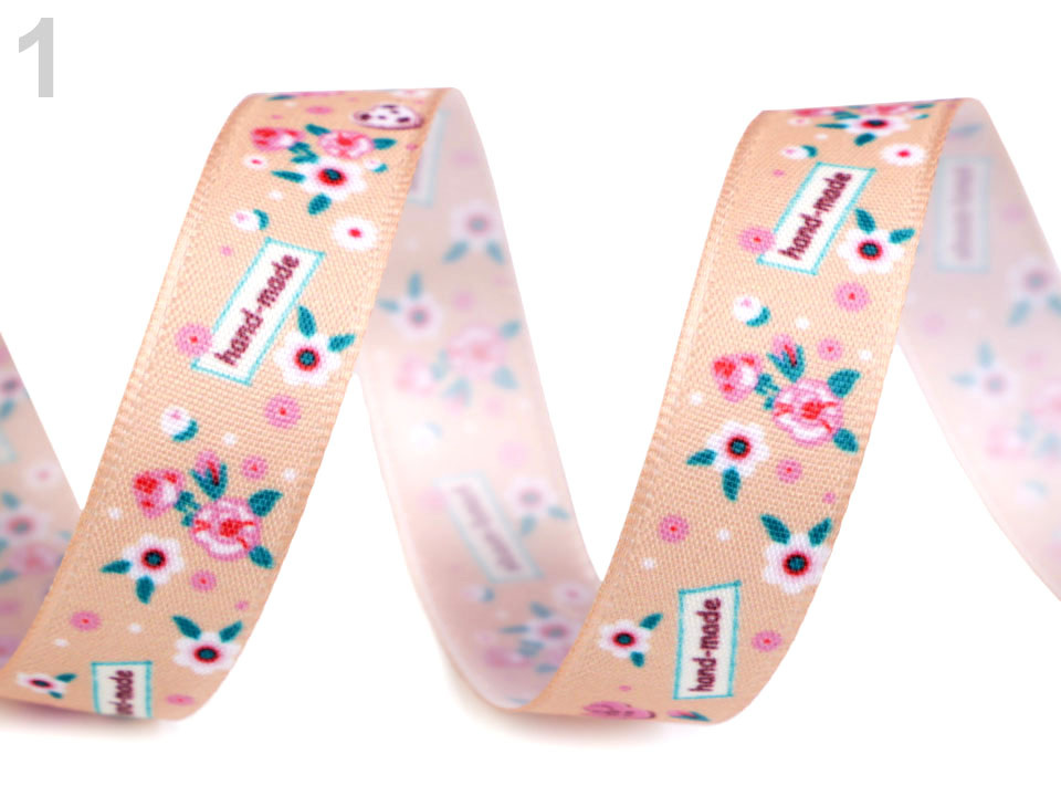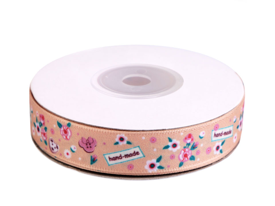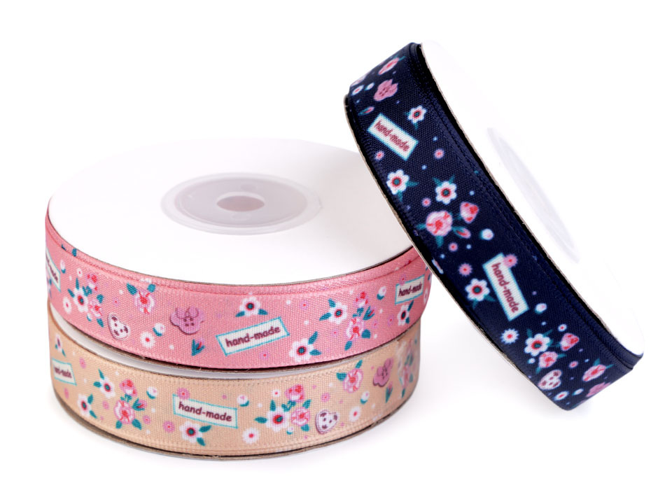 Saténovou stuhu zdobí motiv květů a nápis "hand-made". Využijete ji k dekoračním účelům. Její potisk je jednostranný.