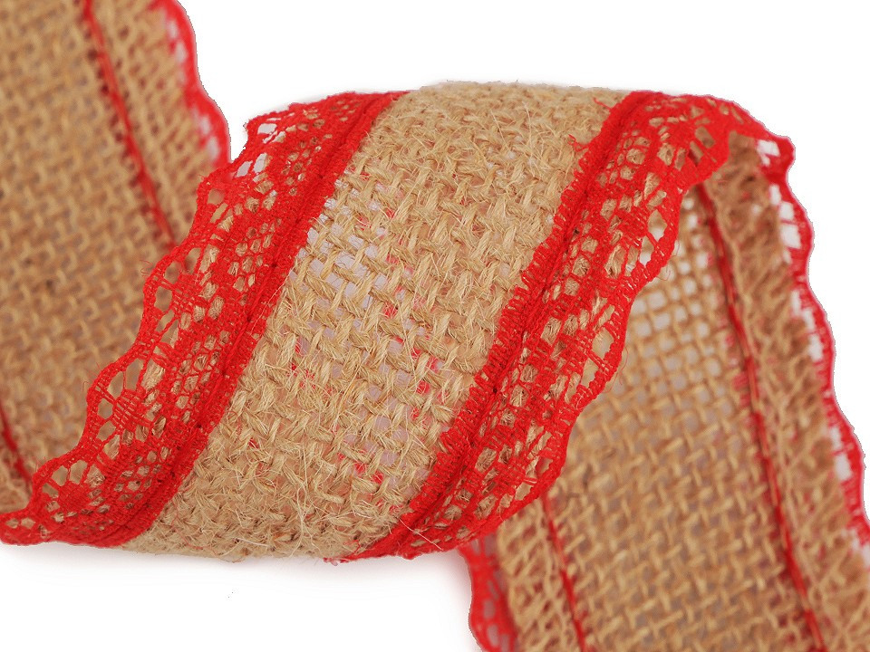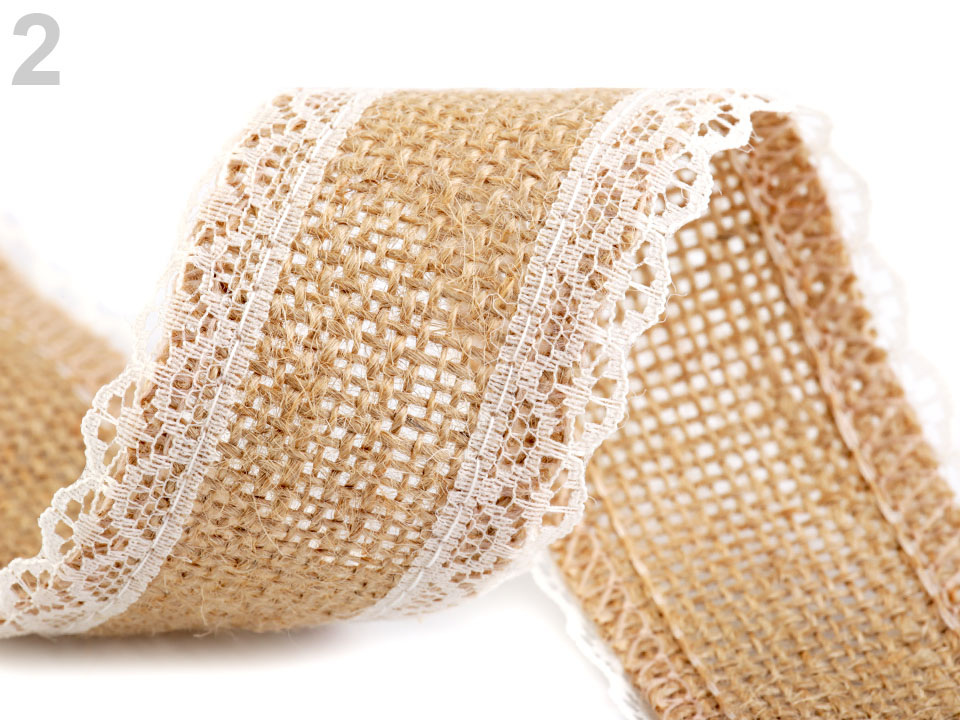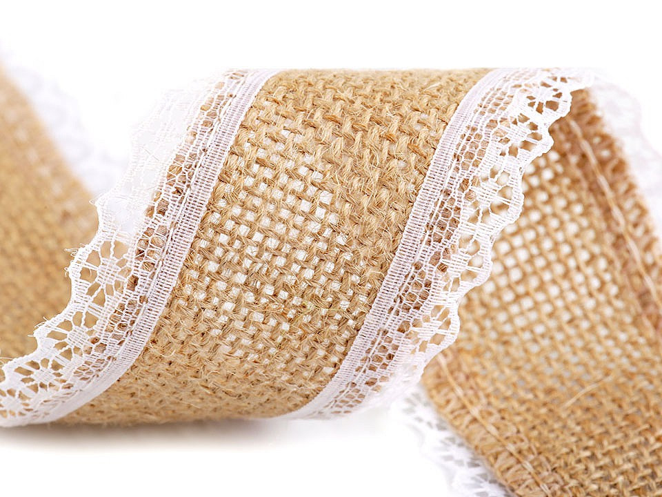 Jutová stuha je ozdobena po obou stranách jemnou krajkou, která jí propůjčuje starobylý vintage vzhled. Stuha je vyrobená z přírodních textilních vláken jutovníku.