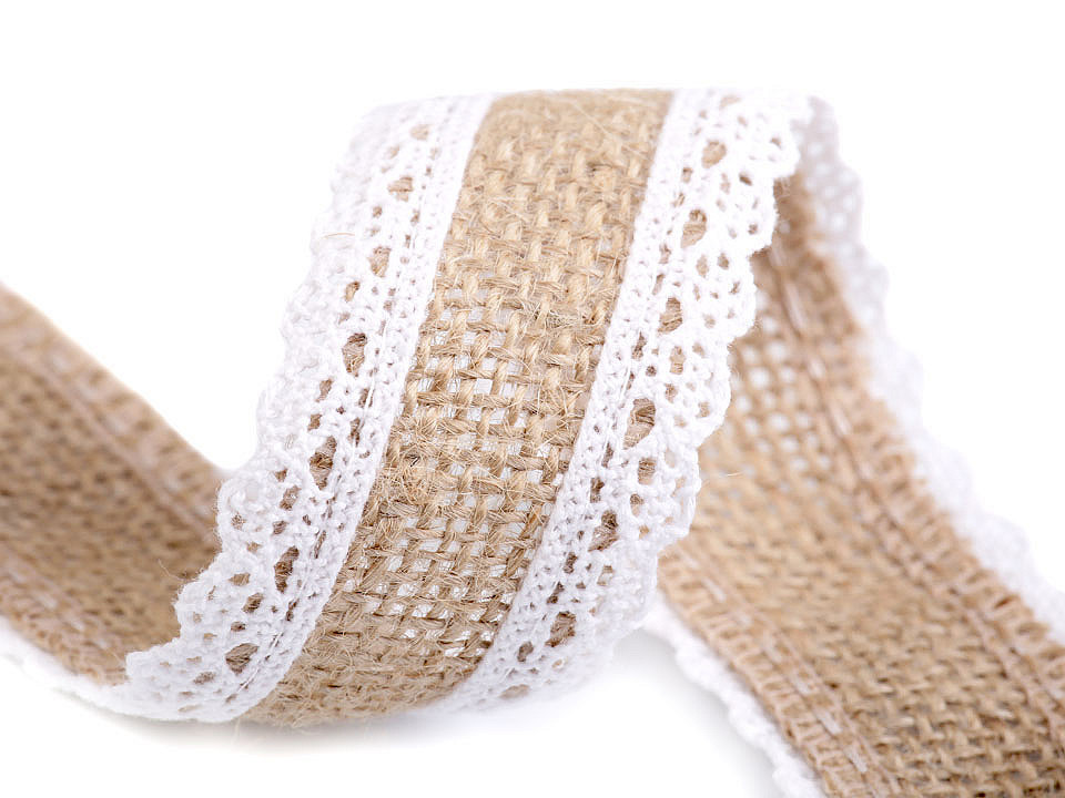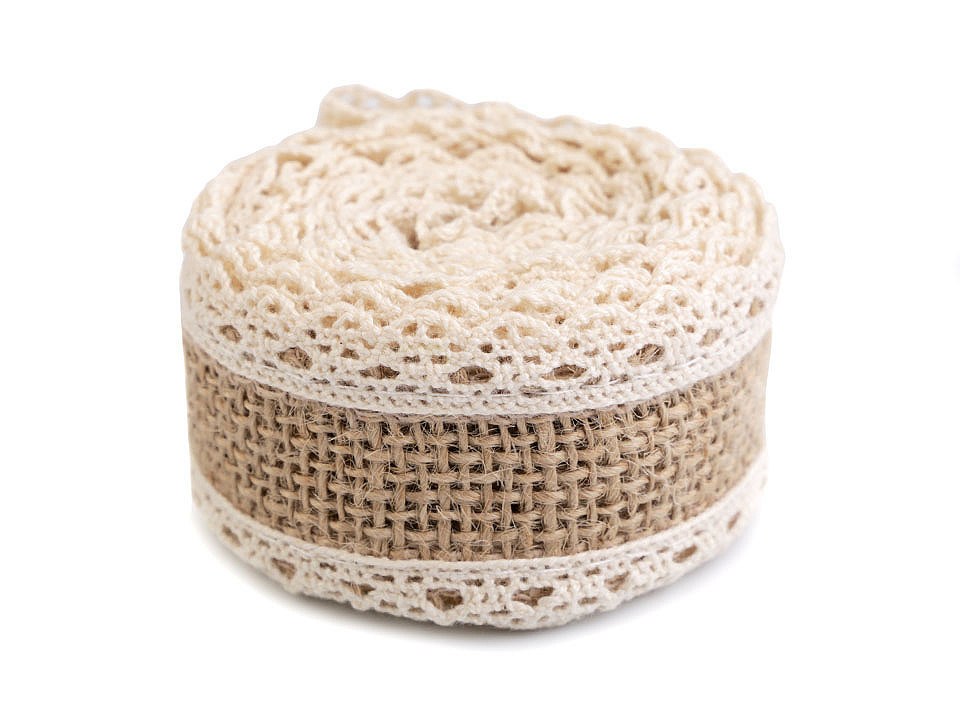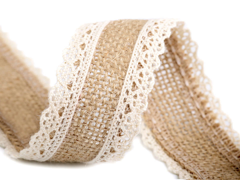 Jutová stuha má díky bavlněné krajce po stranách romantický vintage vzhled.