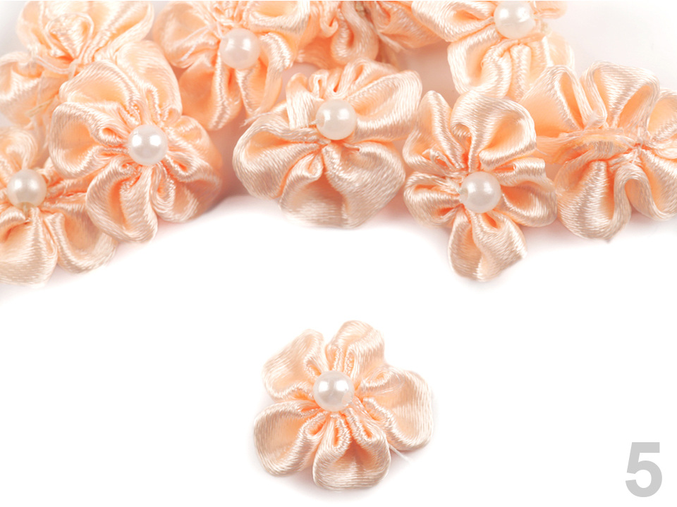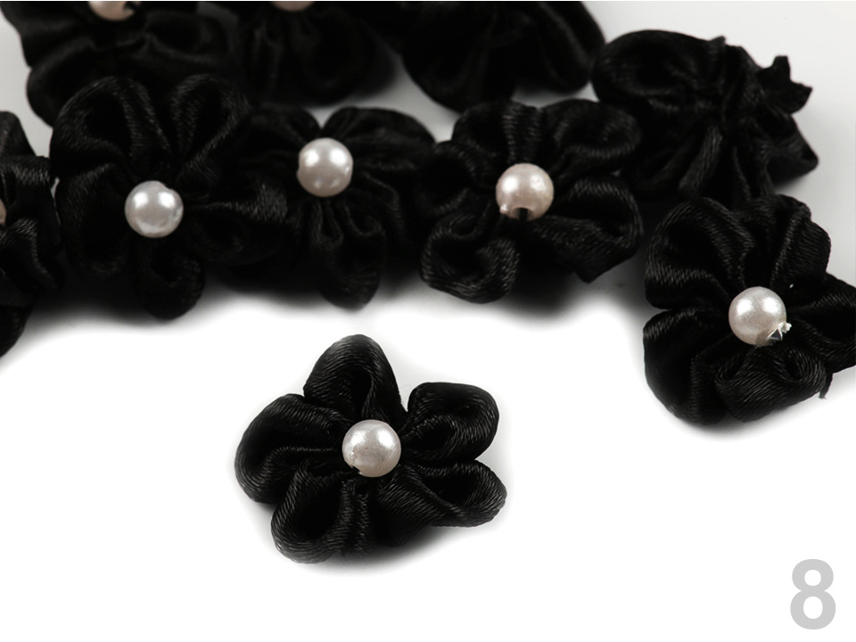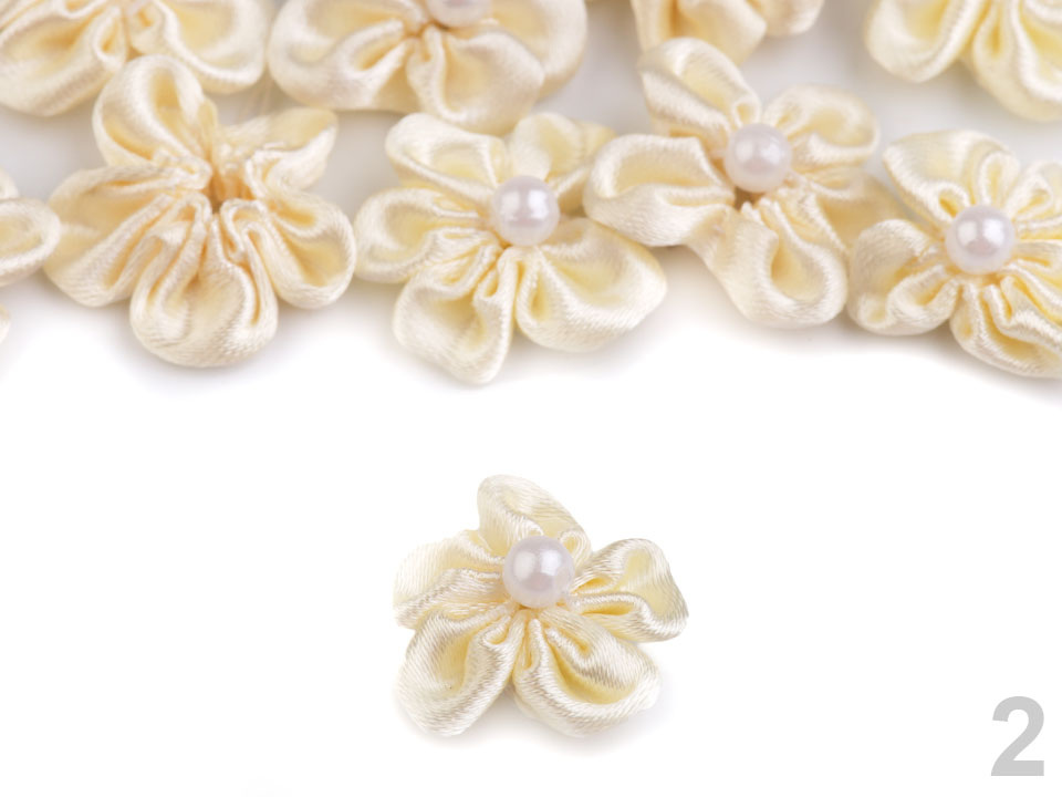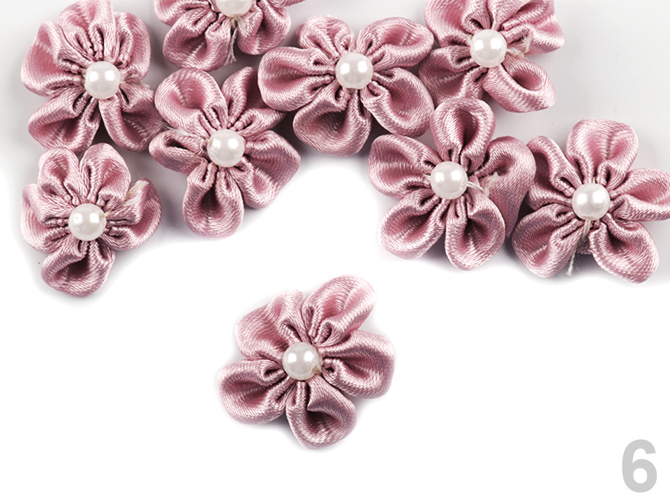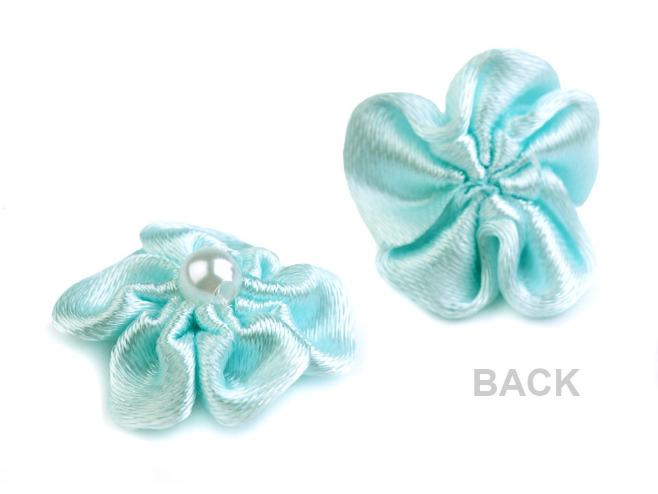 Saténový květ se krásně leskne. Uprostřed ho zdobí korálek s perlovým odleskem, který je ke květu přišitý.