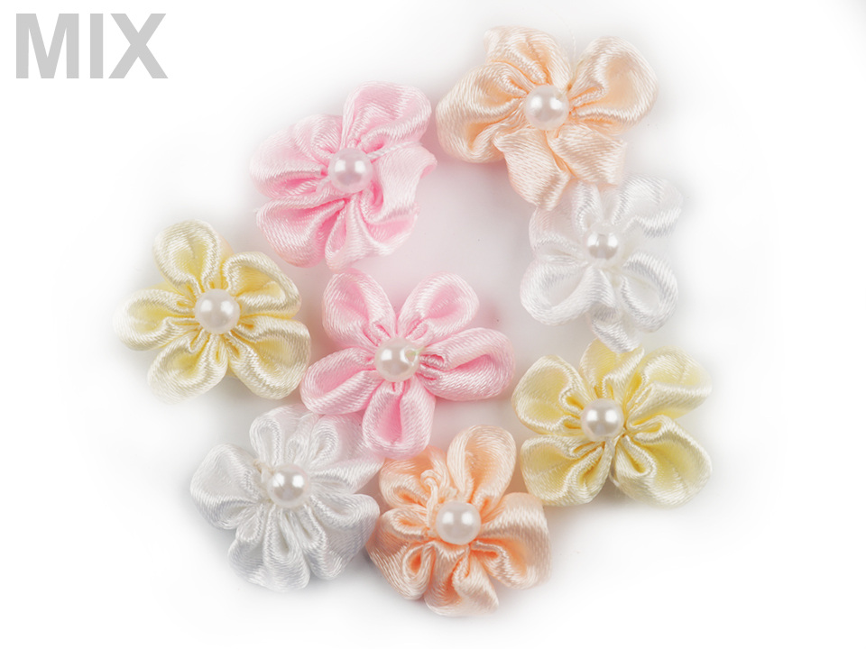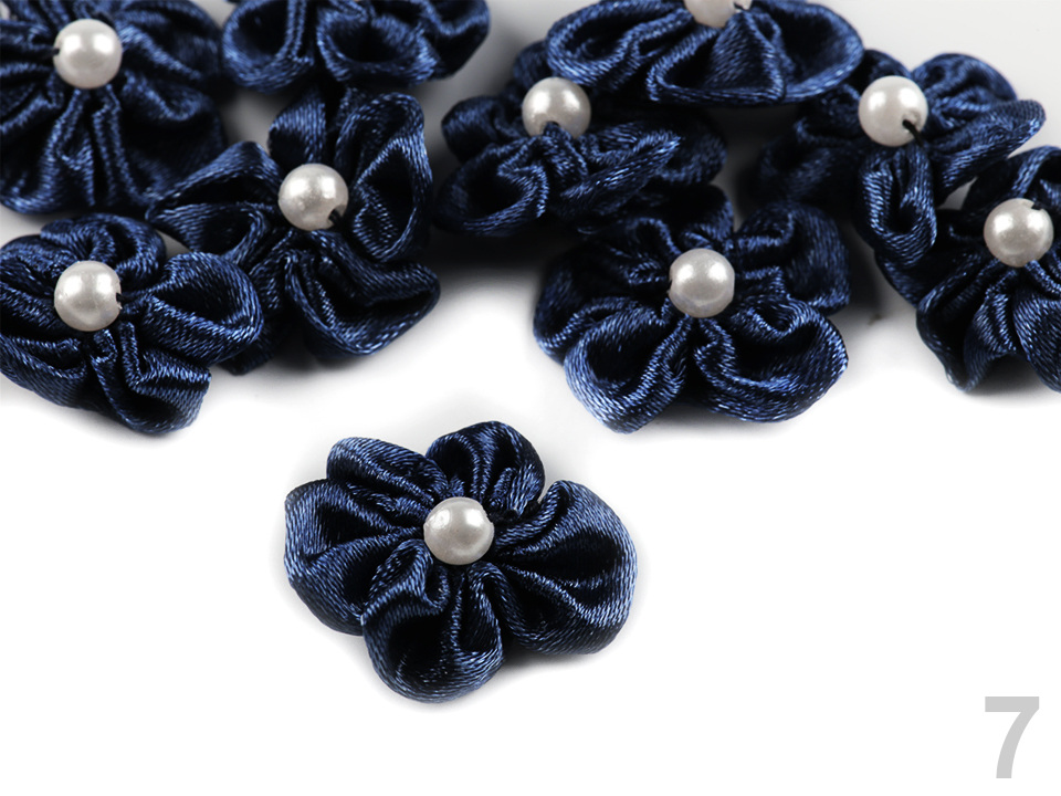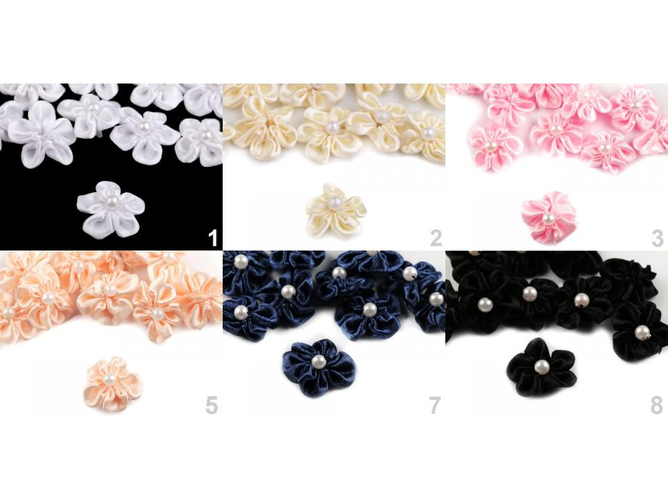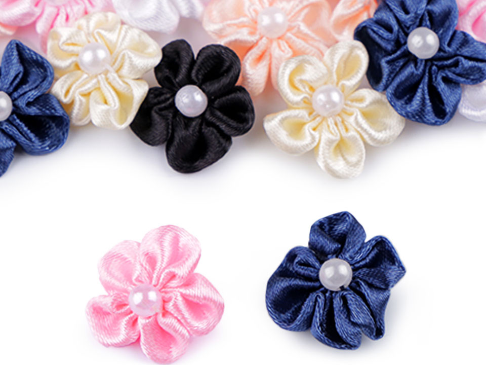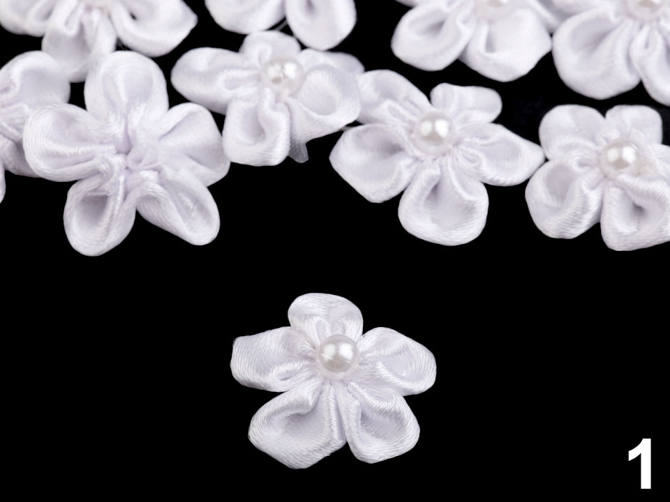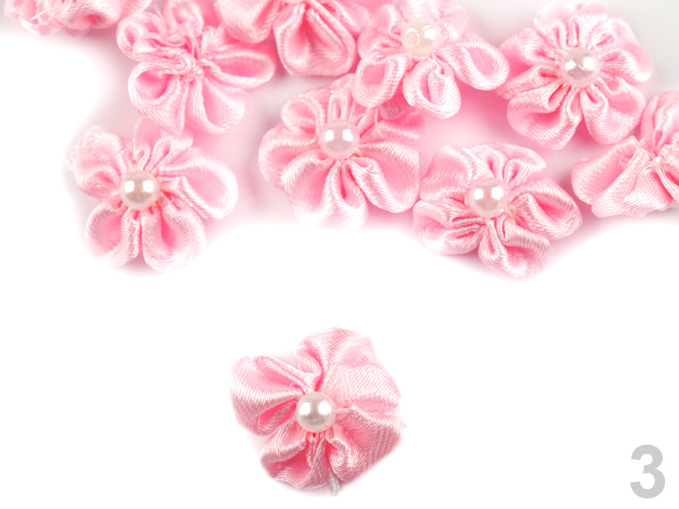 Saténový květ se krásně leskne. Uprostřed ho zdobí korálek s perlovým odleskem, který je ke květu přišitý.