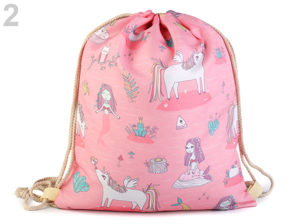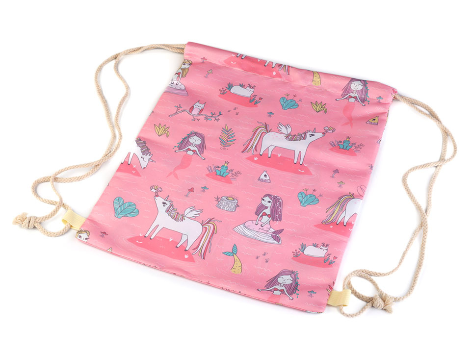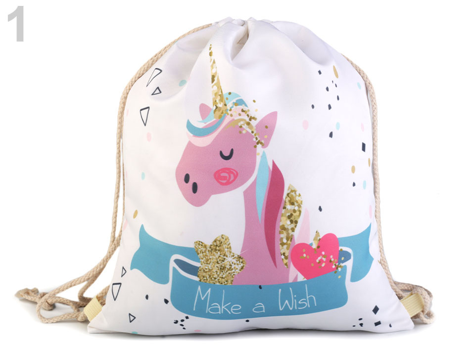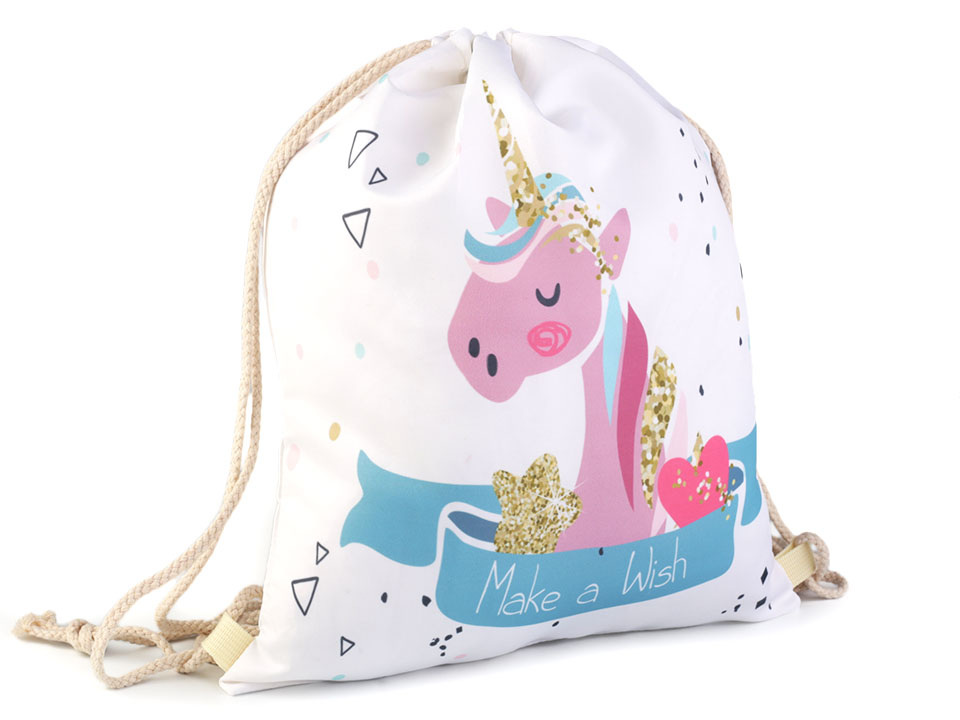 Vak na záda s potiskem jednorožců nadchne všechny malé slečny. Stahuje se jednoduše pomocí šňůrek. Potisk je oboustranný. Do vaku můžete schovat boty, přezůvky i oblečení. Využijí ho nejen sportovci, ale také děti do školy.
