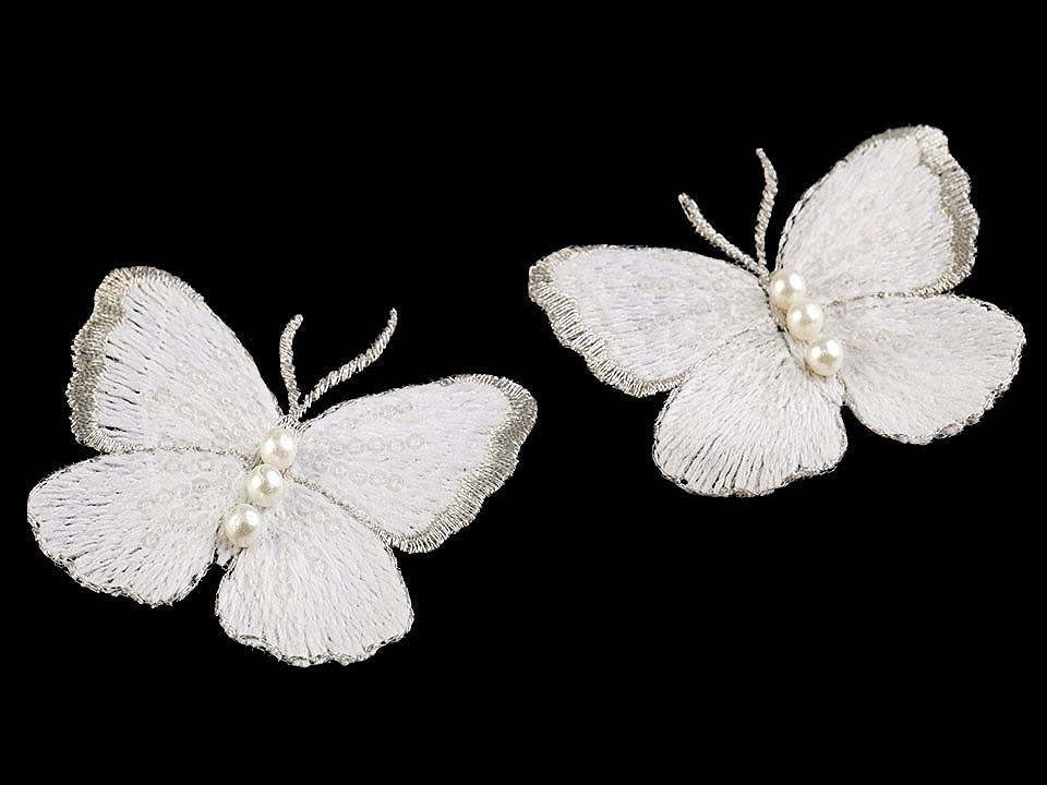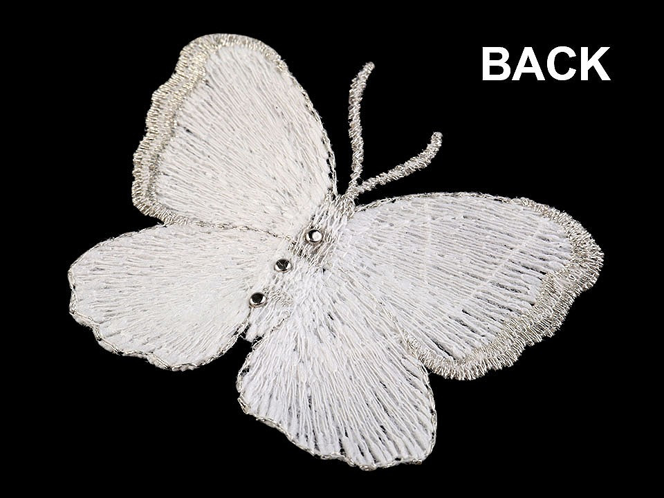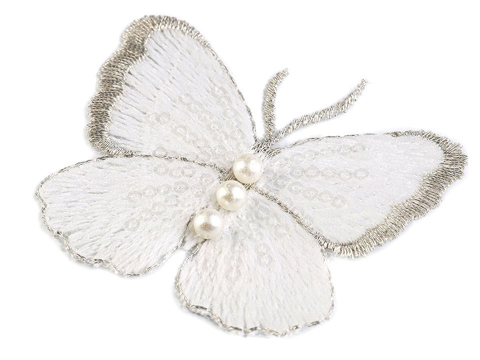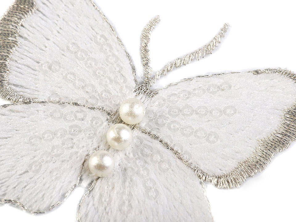 Vyšívaný motýl má křídla zdobené kovovým vláknem a transparentními flitry. Uprostřed motýla jsou perly, které jsou pevně přichyceny nýtem.