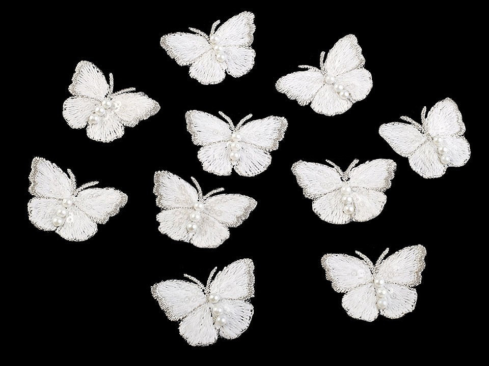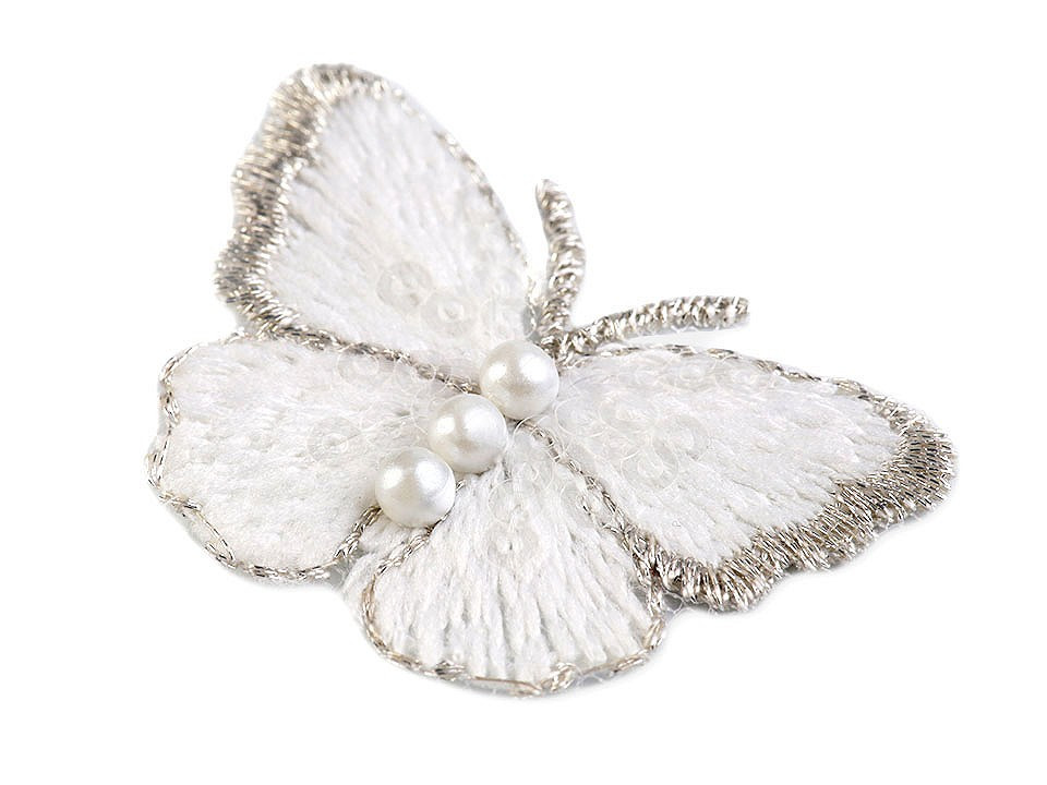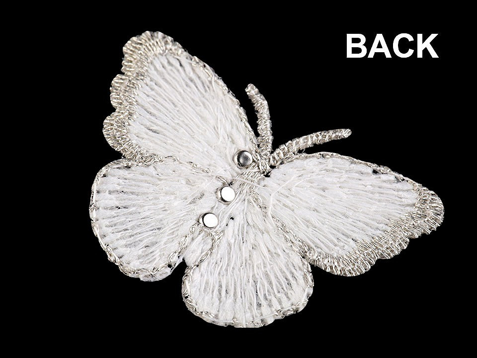 Vyšívaný motýl je po obvodu křídel zdobený kovovým vláknem. Uprostřed motýla jsou perly, které jsou přichyceny nýtem. Křídla se lesknou díky našitým transparentním flitrům.