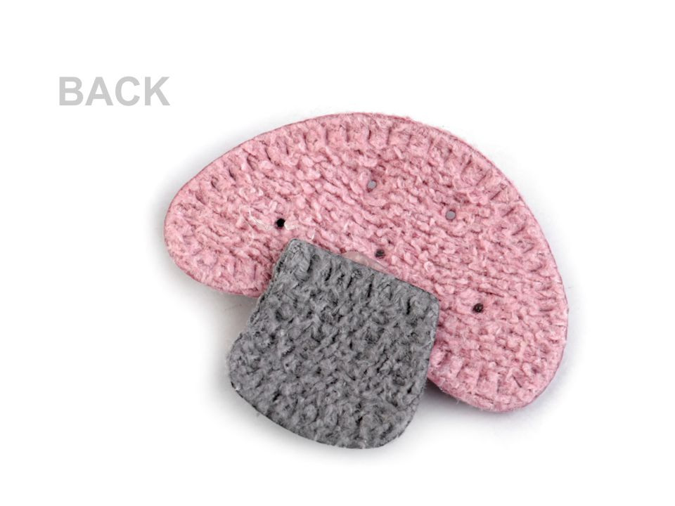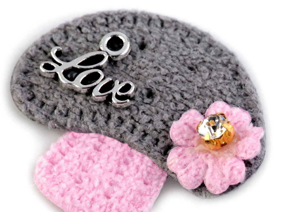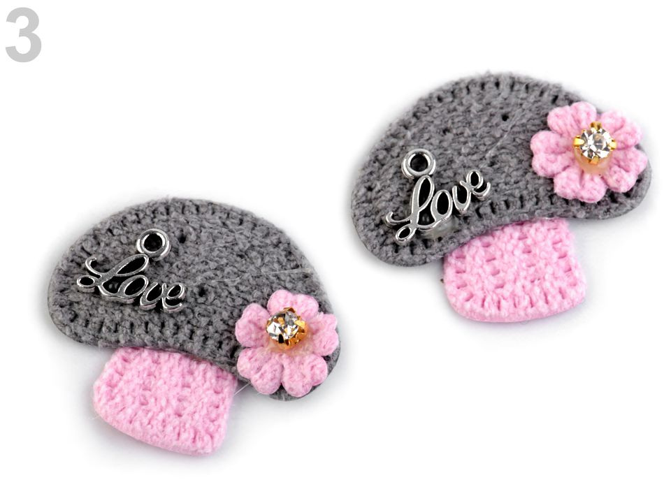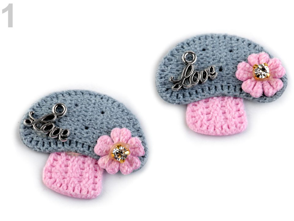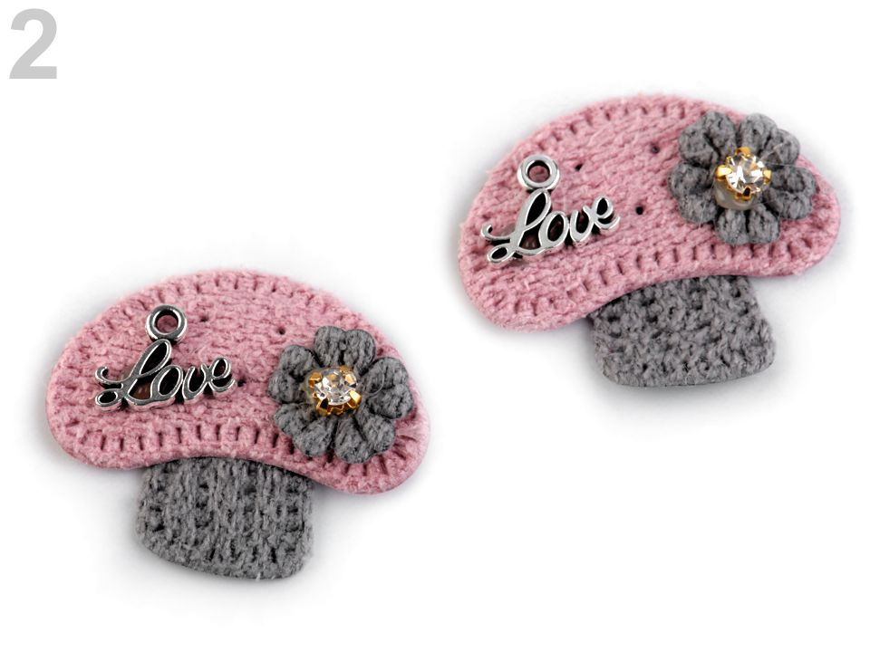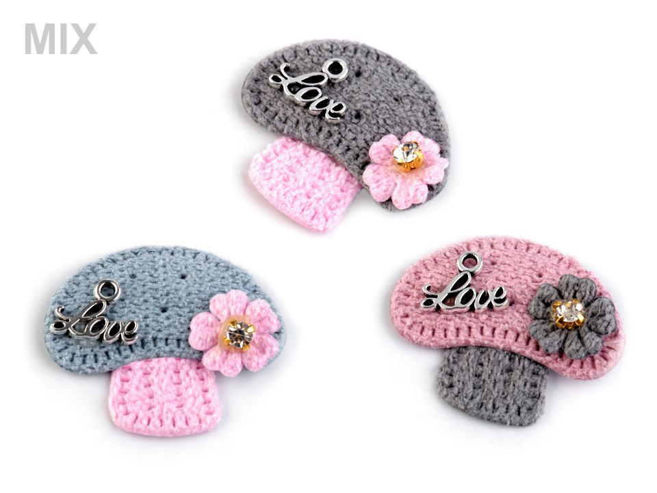 Textilní aplikace v podobě hříbku je originální a slušivou ozdobou oděvu. Aplikace je ozdobena květem, který je doplněný kamínkem, a nápisem "Love".