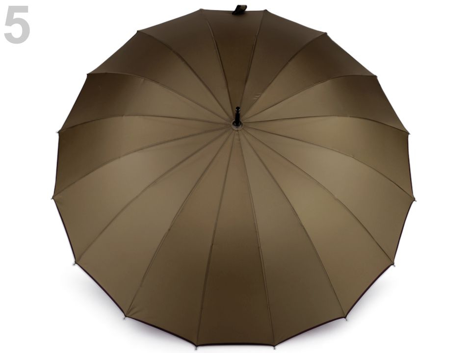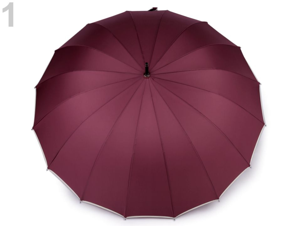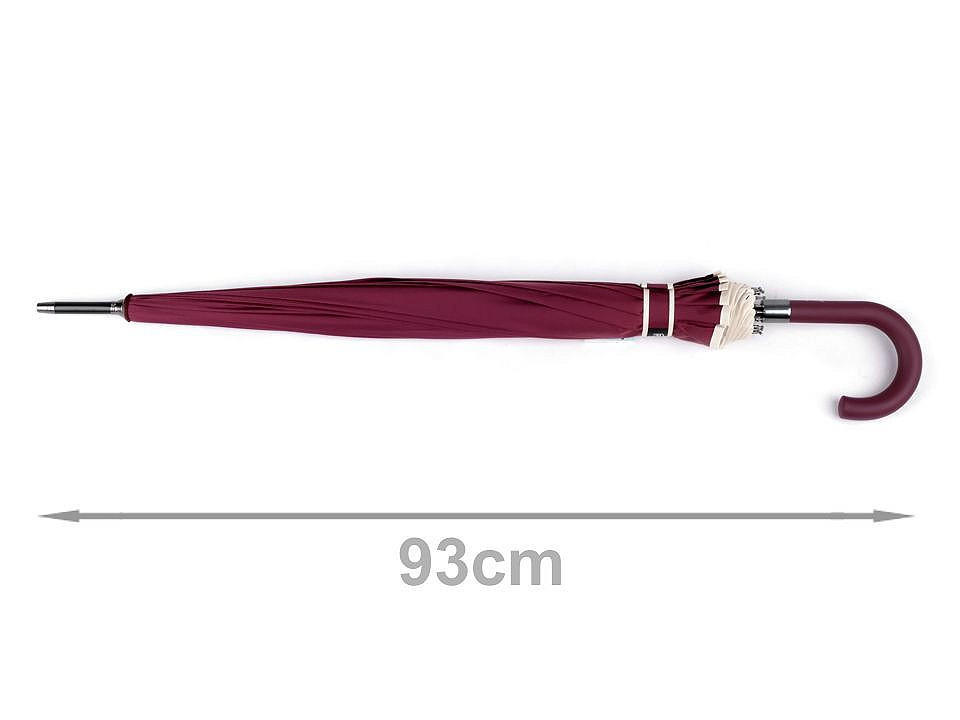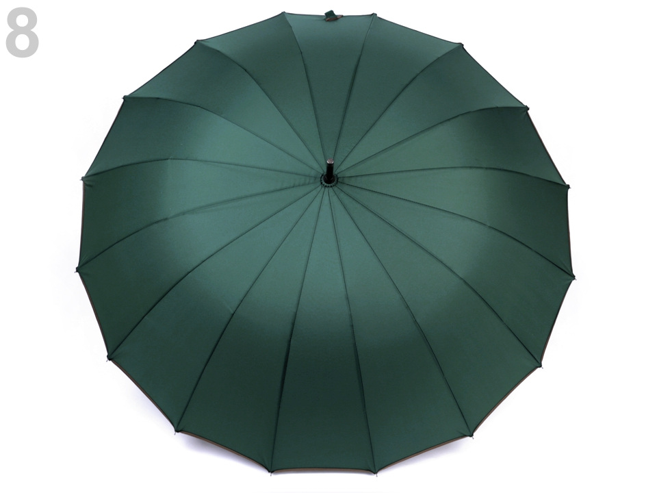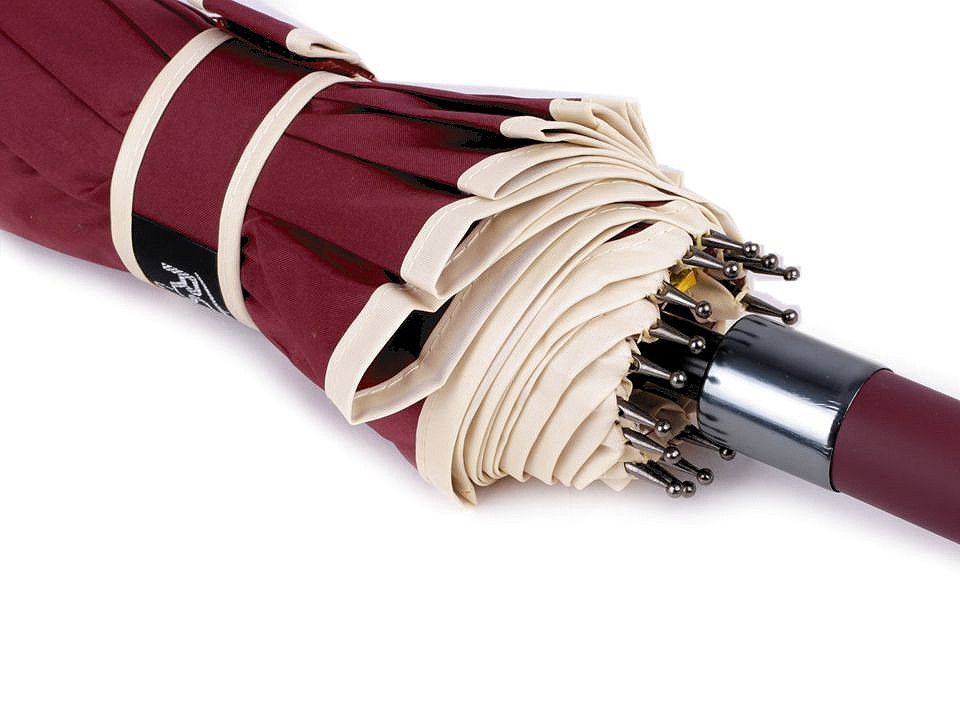 Okraje má olemované decentním barevným proužkem. Má klasickou tyč zakončenou pevnou rukojetí. Konstrukce deštníku se skládá z 16 polí. V kombinaci s pružnými lamelami a také díky velké hloubce má deštník vysokou pevnost a stabilitu.