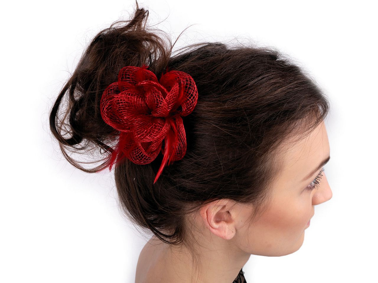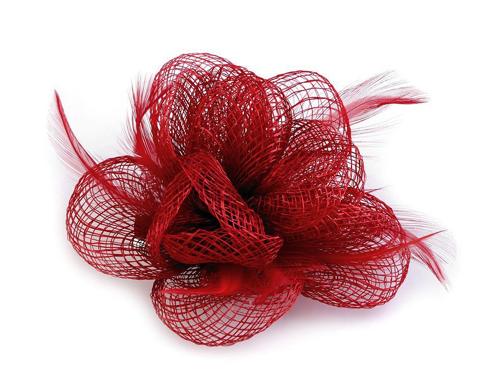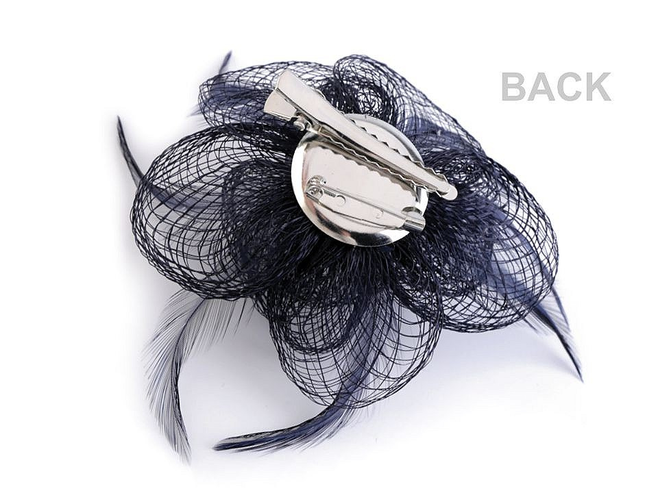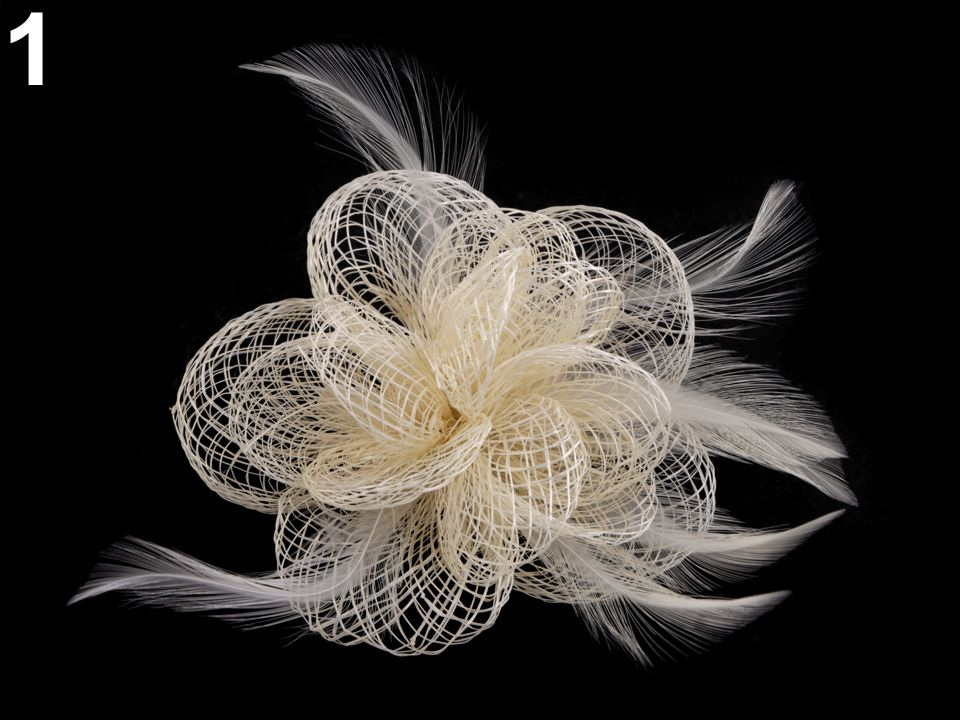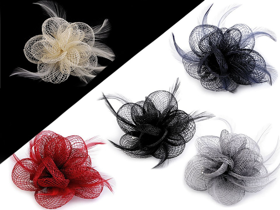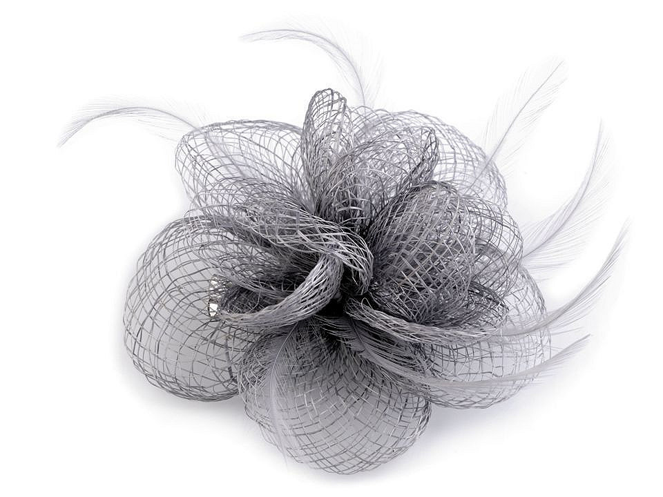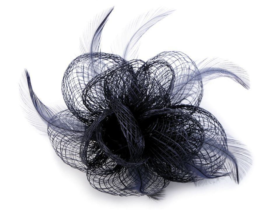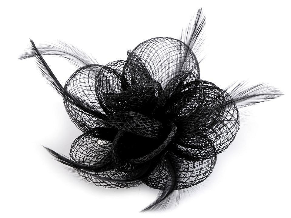Noblesní fascinátor ve tvaru květu využijete na společenské akce jako jsou plesy, svatby či návštěvy divadla. Dá se připnout i jako zajímavá brož. Květ je vyrobený z modistické síťky, dokola je zkrášlený pírky.