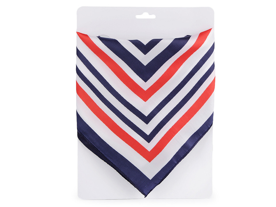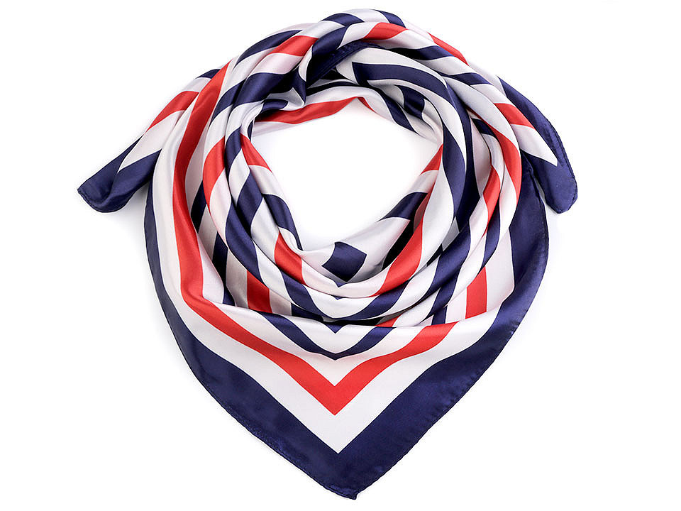 Saténový šátek s pruhy v námořnickém stylu. Jeho příjemný materiál vás bude doslova hýčkat, je nenáročný na údržbu. Šátek můžete vázat různými způsoby. Oživíte s ním jednobarevné sáčko, halenku i tričko. Skvěle vypadá jen tak uvázaný na kabelce. Je vhodný do zaměstnání i pro volný čas.