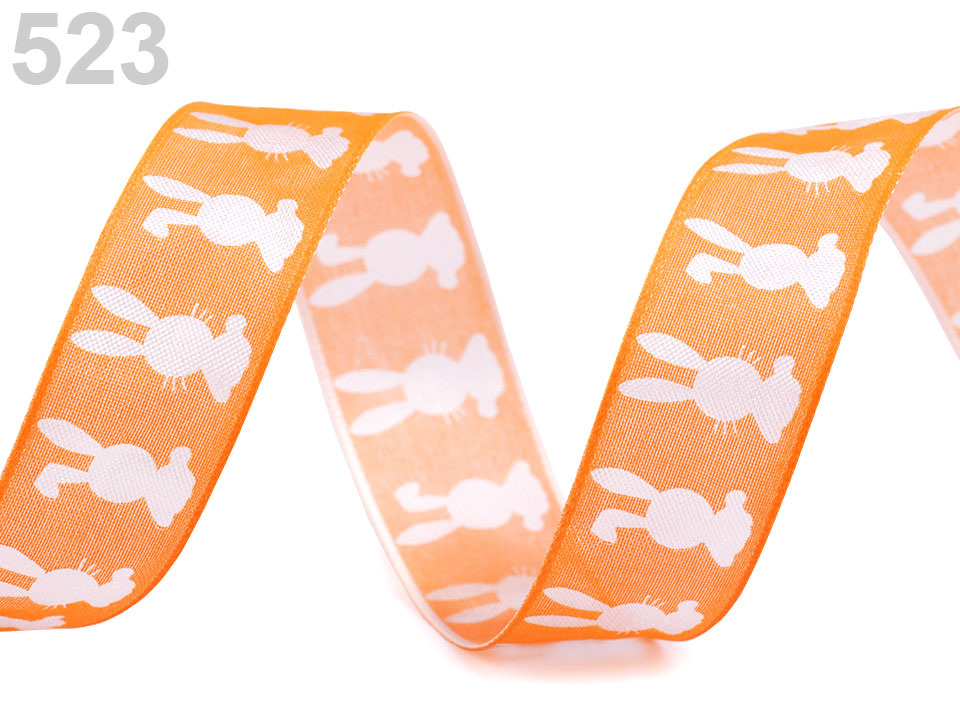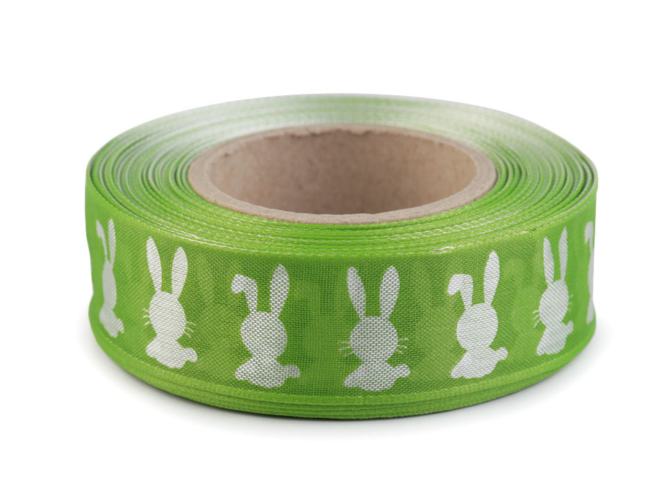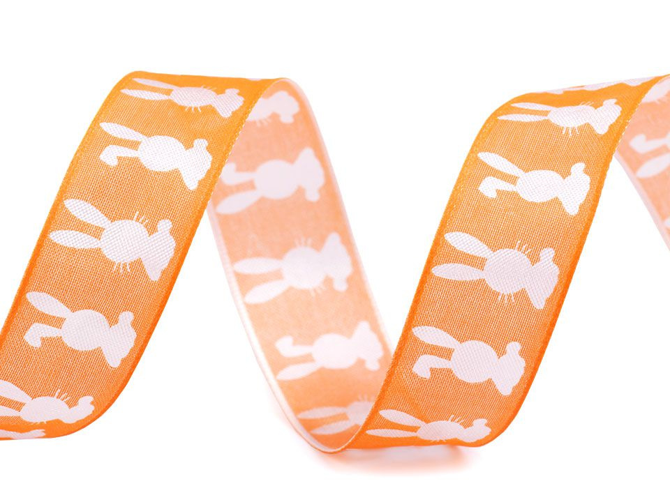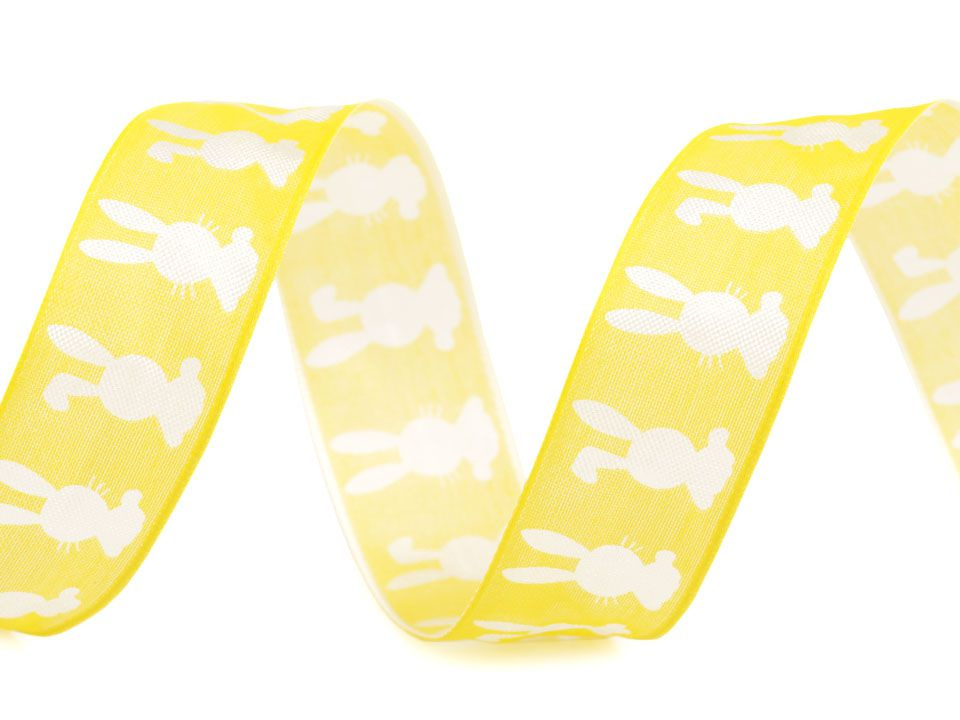Plátnovou stuhu zdobí design se zajíci. Okraje jsou zpevněny drátem, proto dobře drží tvar.