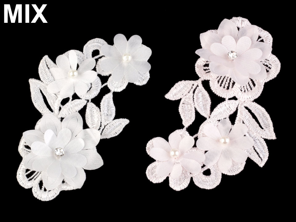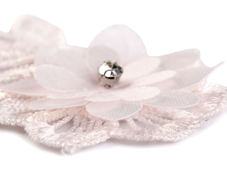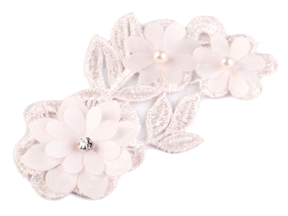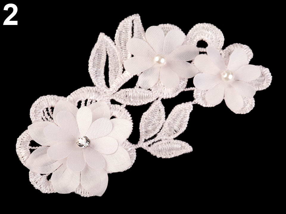 Květinová krajková ozdoba působí elegantně. Květy jsou vrstvené, mají tzv. 3D rozměr, působí bohatě a nevšedně. Uprostřed jsou zdobené perlou nebo kamínkem vsazeným do lůžka.