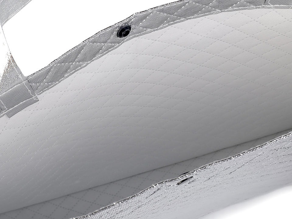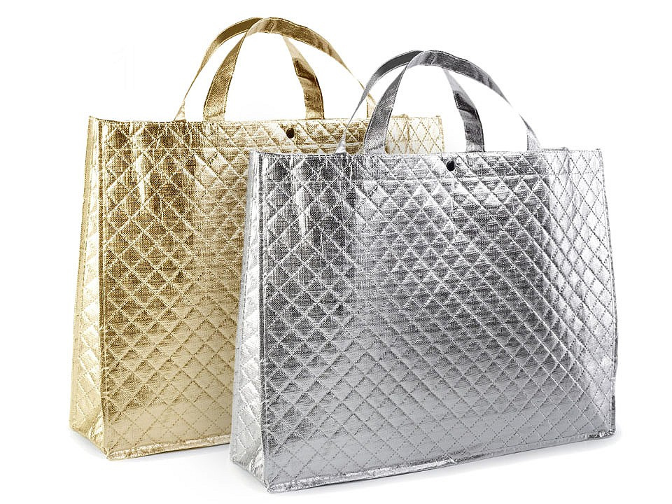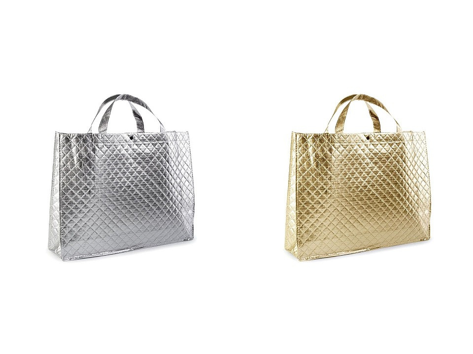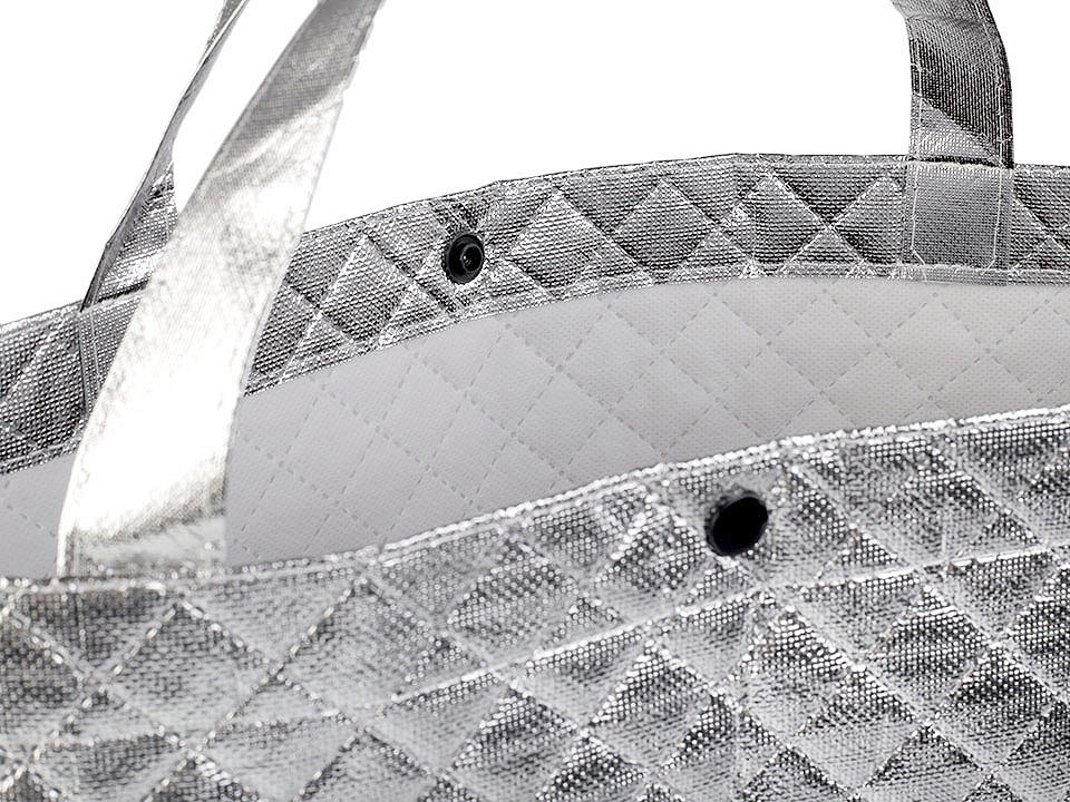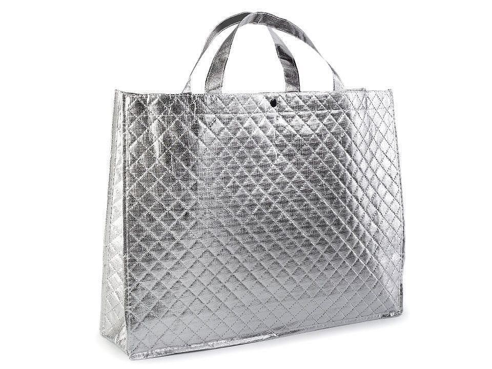 Metalická taška je určena pro ženy, které mají rády lesk a jednoduchost. Je dostatečně prostorná, vejde se do ní vše potřebné. Textilní taška je po celém povrchu zdobena prošíváním a uzavírá se na patent. Má dvě napevno přišitá ucha. Lze ji použít jako plážovou tašku.