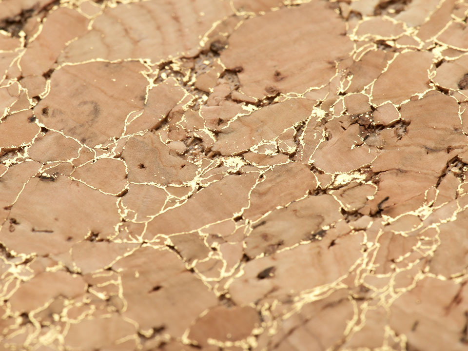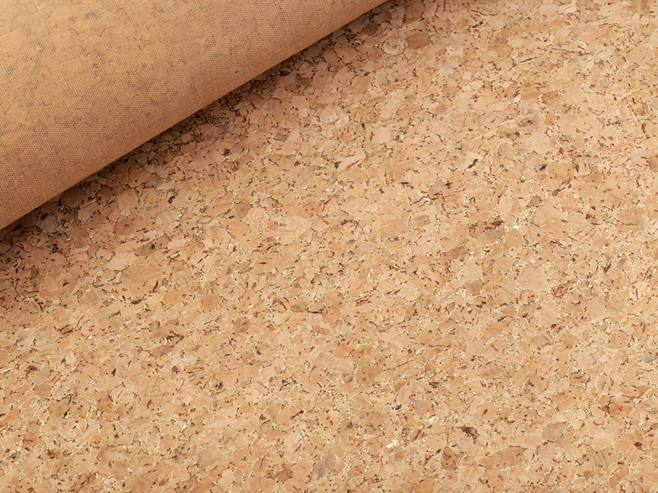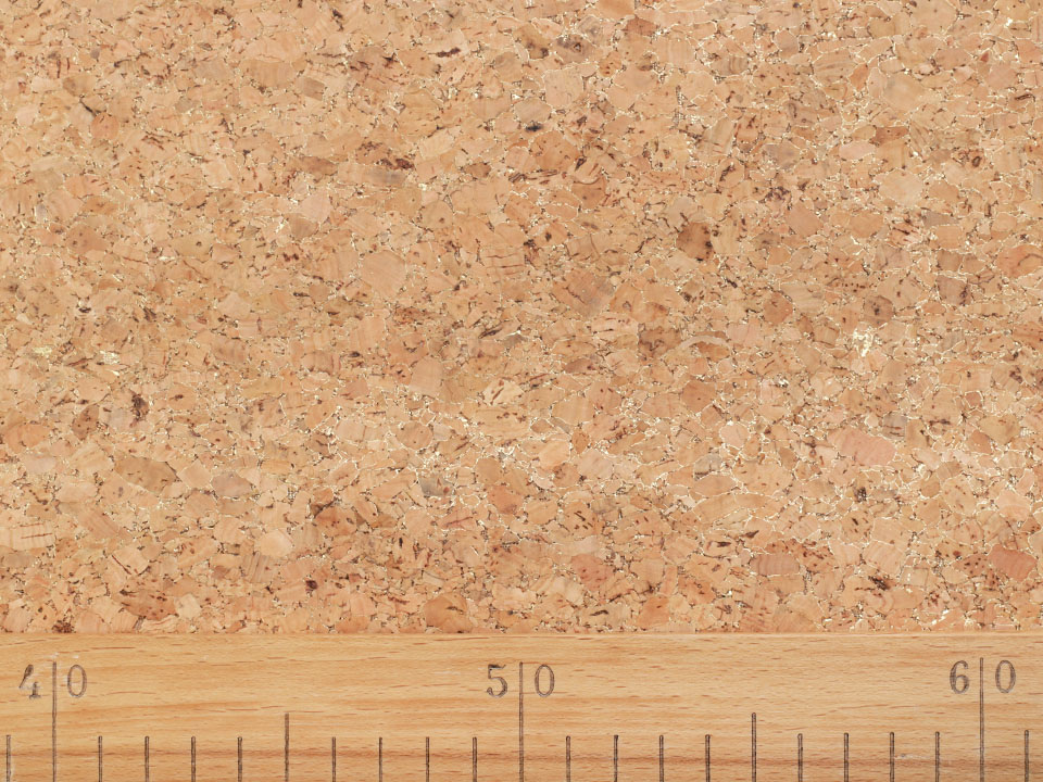 Korková látka je přírodní, lehká a příjemná na dotek. Díky zlatému efektu se jemně třpytí a působí zajímavě. Snadno ji vyčistíte pomocí vlhkého hadříku. Korek je pro lepší manipulaci podšitý látkou.