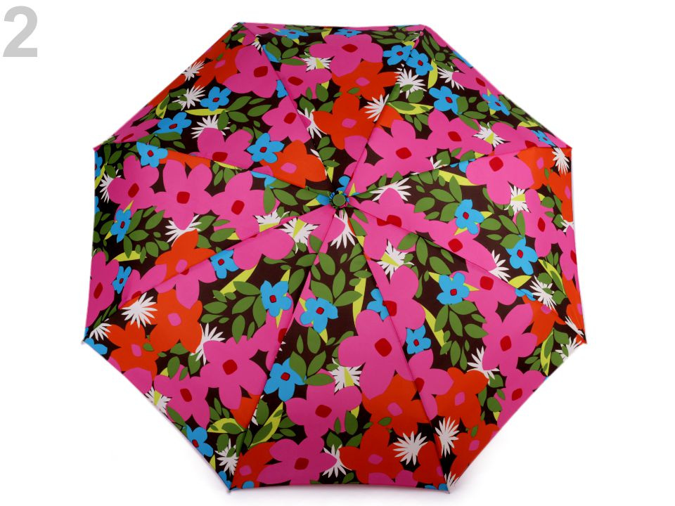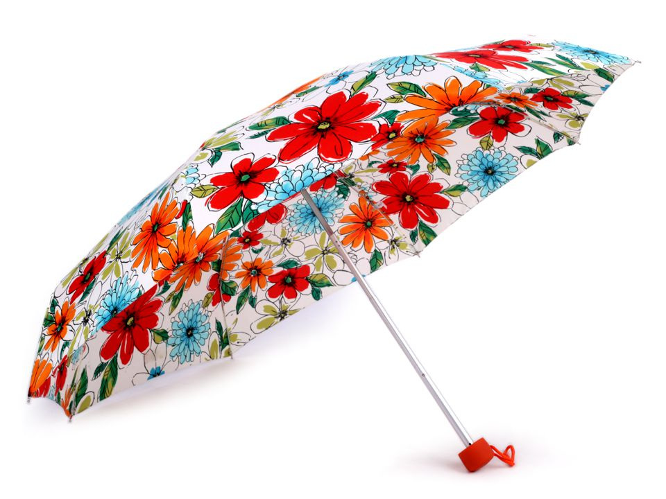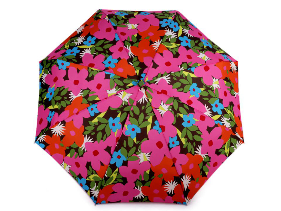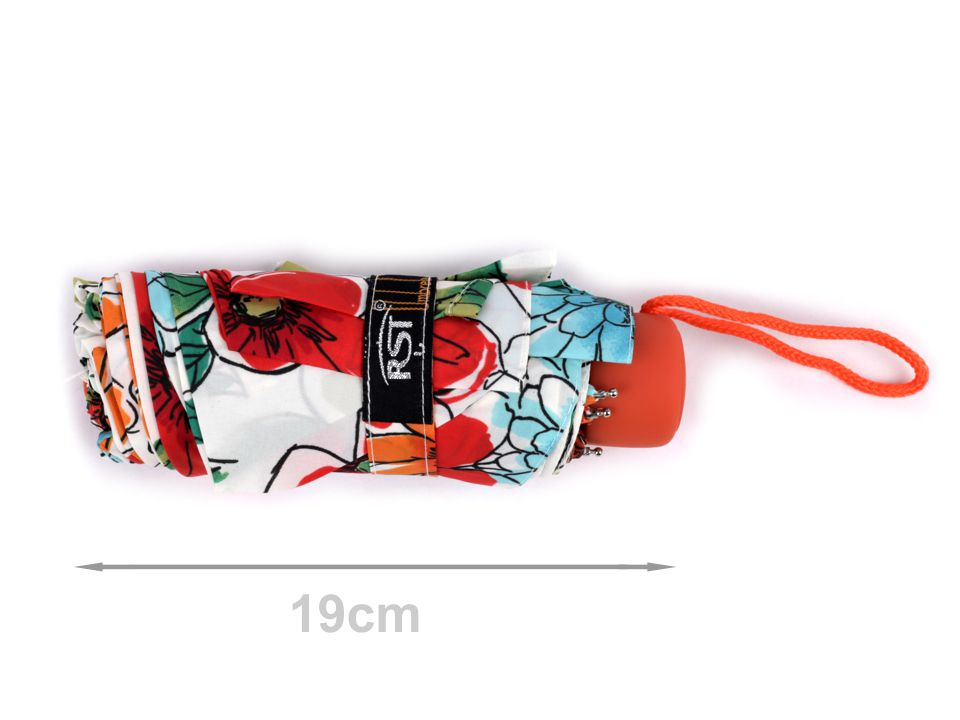 Dámský skládací deštník s barevným potahem. Díky hliníkové konstrukci a malé velikosti je lehký a skladný, pohodlně se vám vejde do kabelky. I když má deštník mini velikost, je velice pevný, obstojí i v silném větru. Rukojeť deštníku je plastová, opatřená poutkem. Konstrukce deštníku se skládá z osmi polí. Součástí deštníku je ochranný obal.