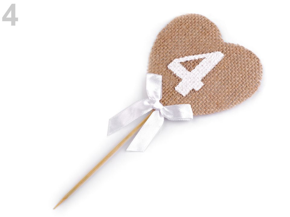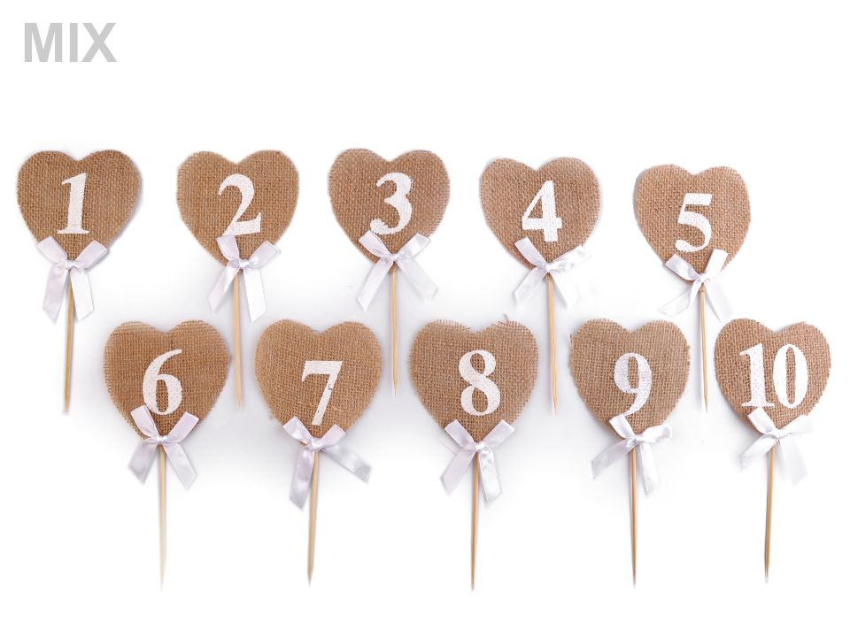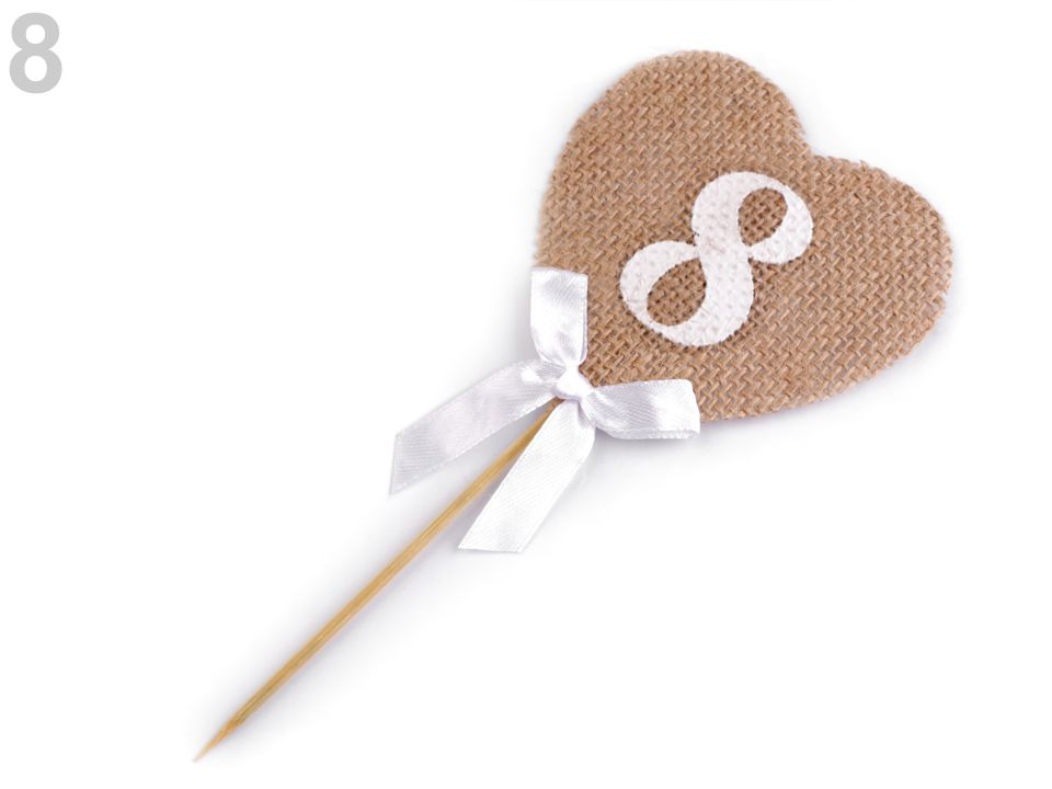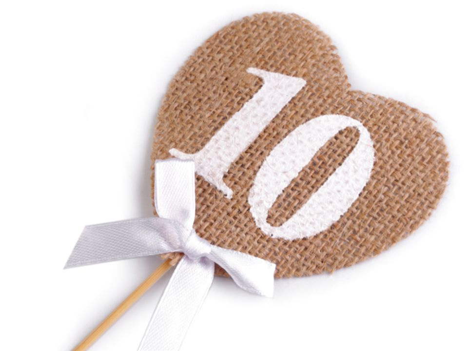Zápich s jutovým srdcem využijete jako originální dekoraci na oslavu narozenin nebo výročí. V každém srdíčku je natištěna číslice. Zápich je vhodný k očíslovaní stolů. Vynikne také v květinových vazbách, jako ozdoba dárku nebo na dortu.