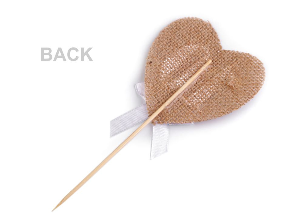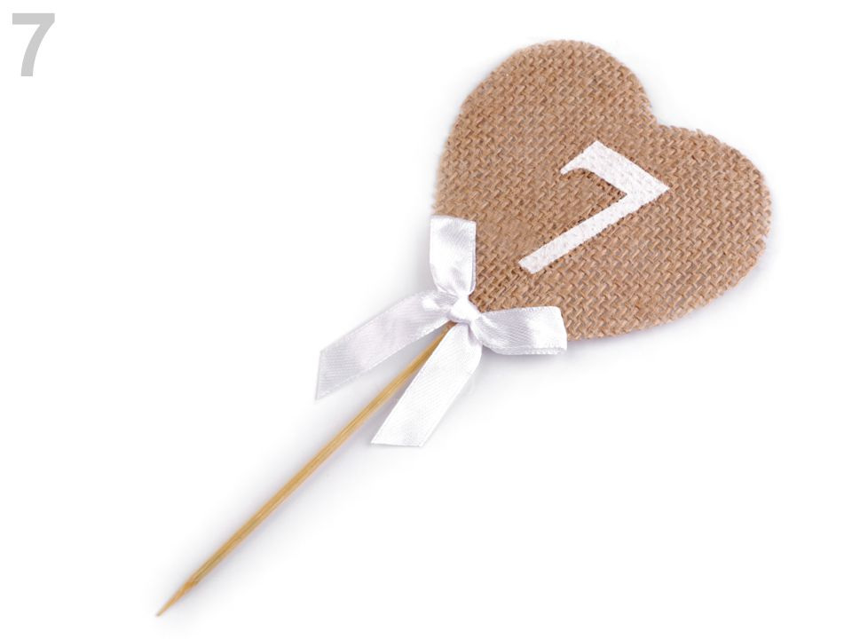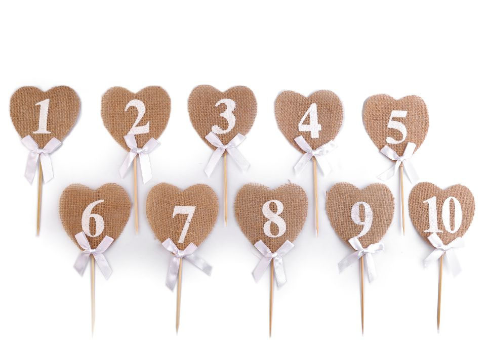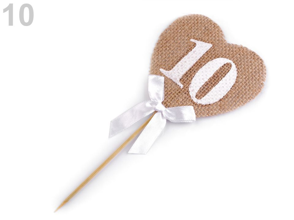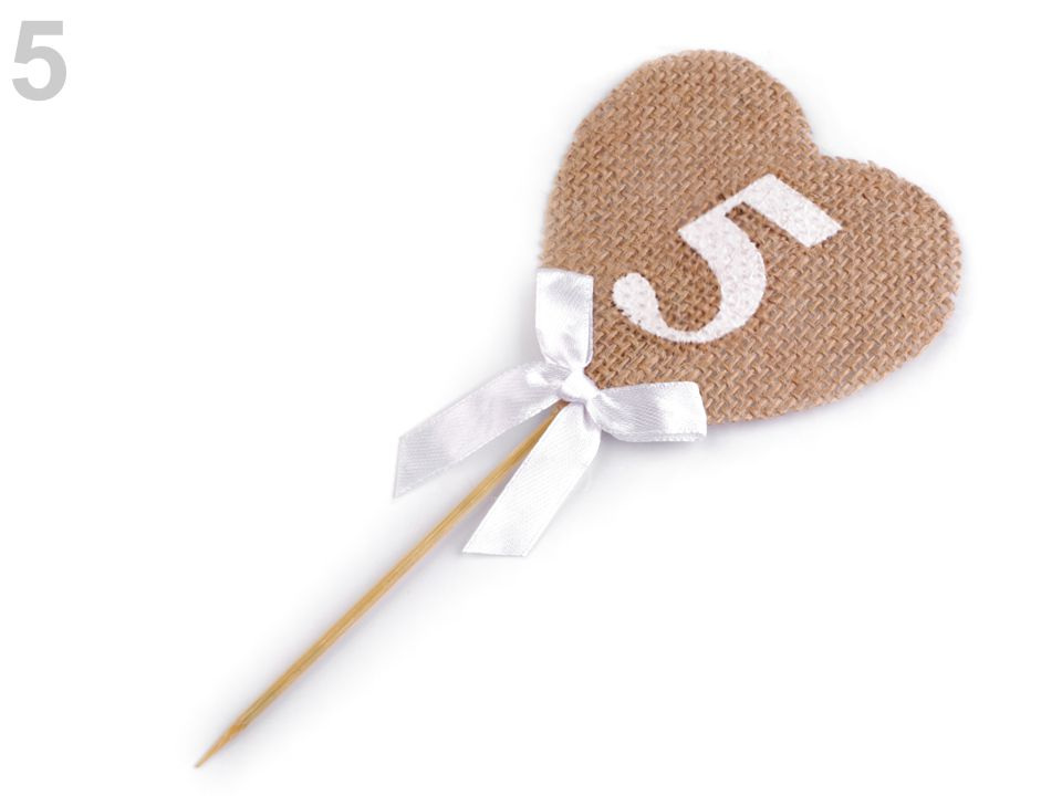 Zápich s jutovým srdcem využijete jako originální dekoraci na oslavu narozenin nebo výročí. V každém srdíčku je natištěna číslice. Zápich je vhodný k očíslovaní stolů. Vynikne také v květinových vazbách, jako ozdoba dárku nebo na dortu.