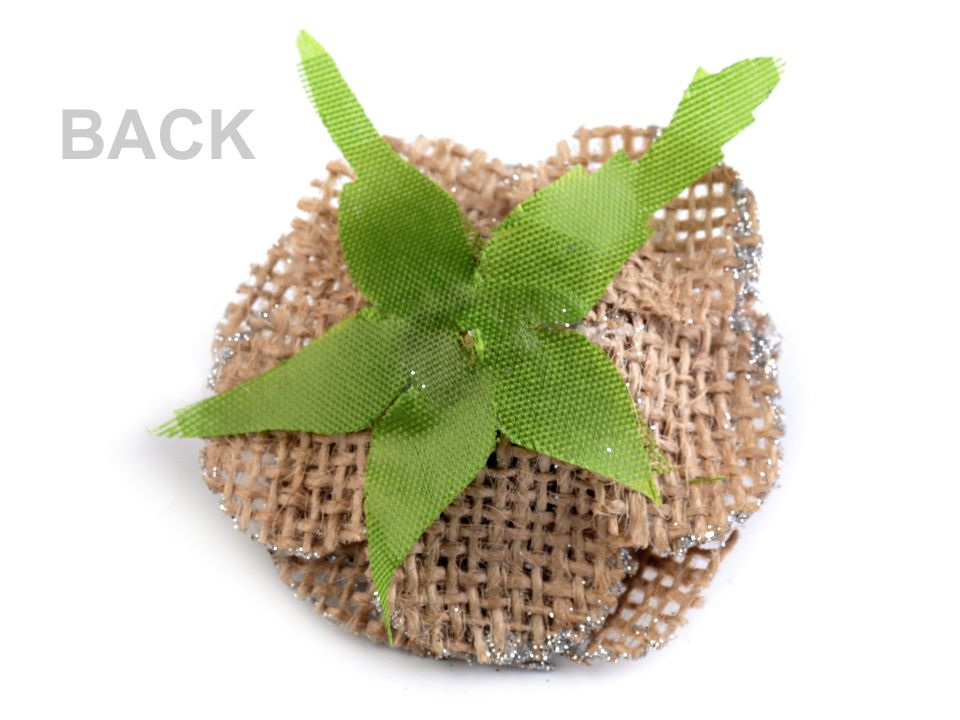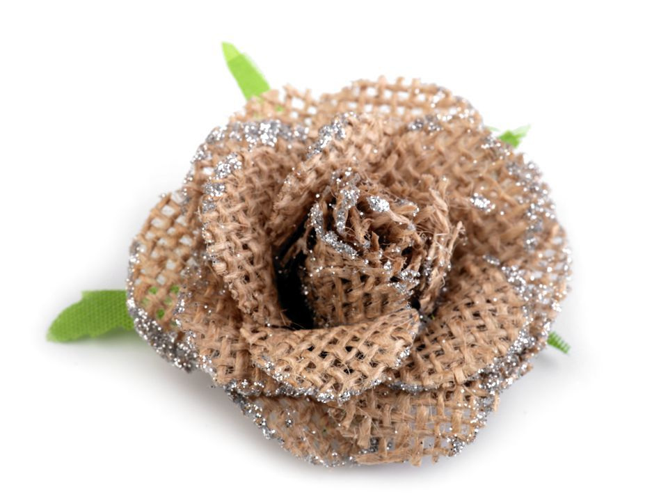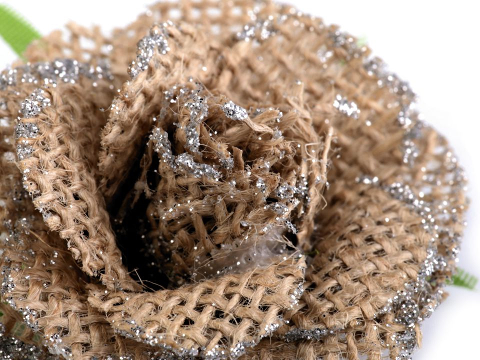 Jutový květ v podobě růže si zamilují všichni milovníci přírodních barev a rustikálního stylu. Okraje okvětních lístků zdobí glitry, které se krásně třpytí.