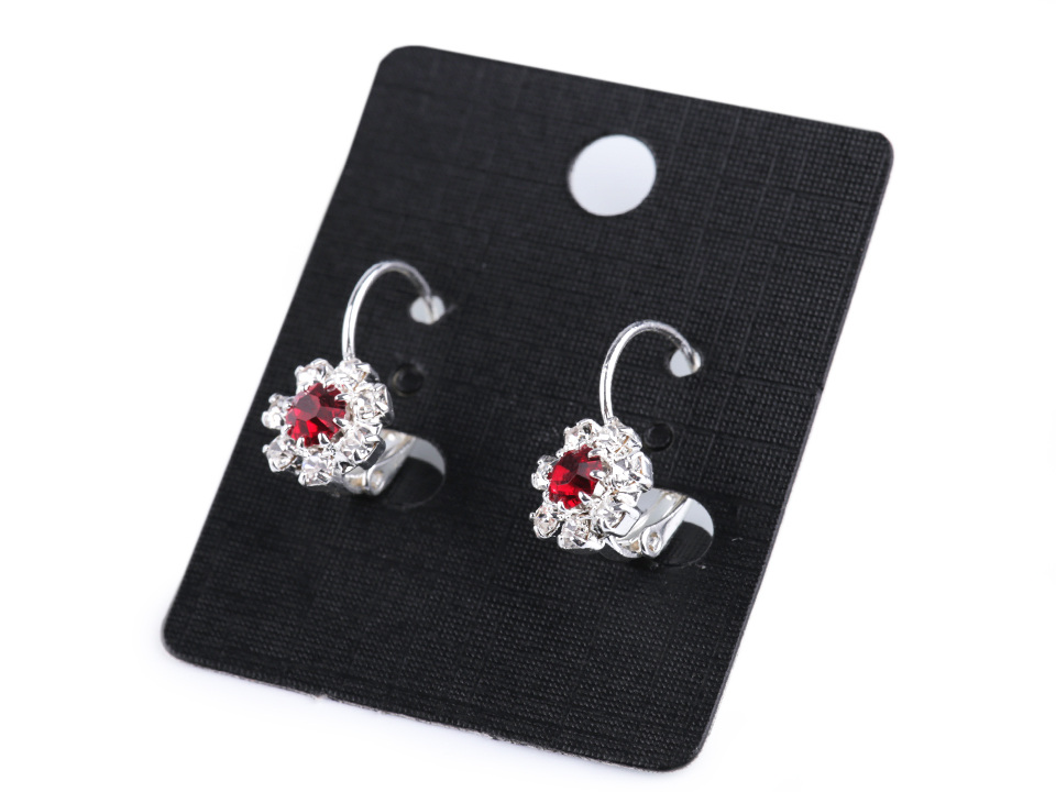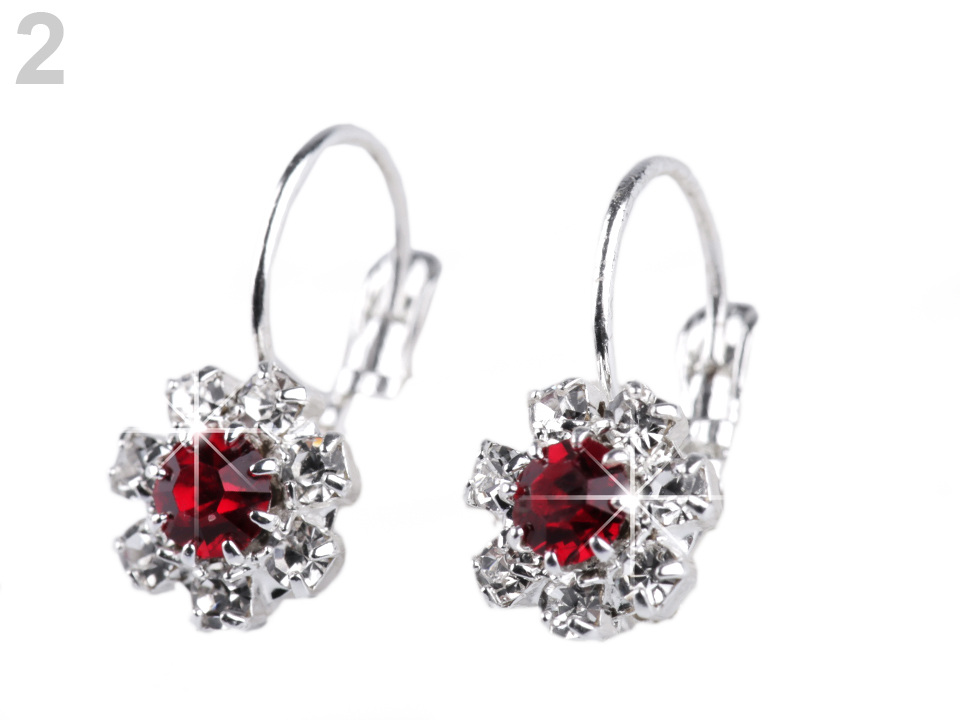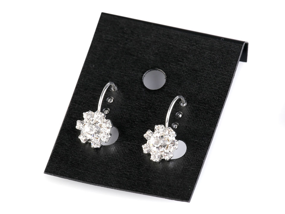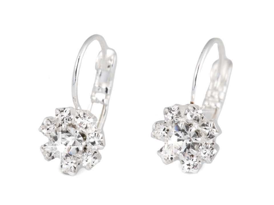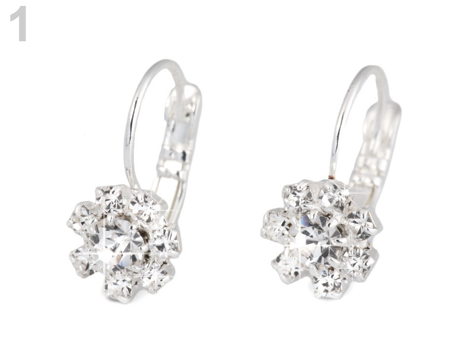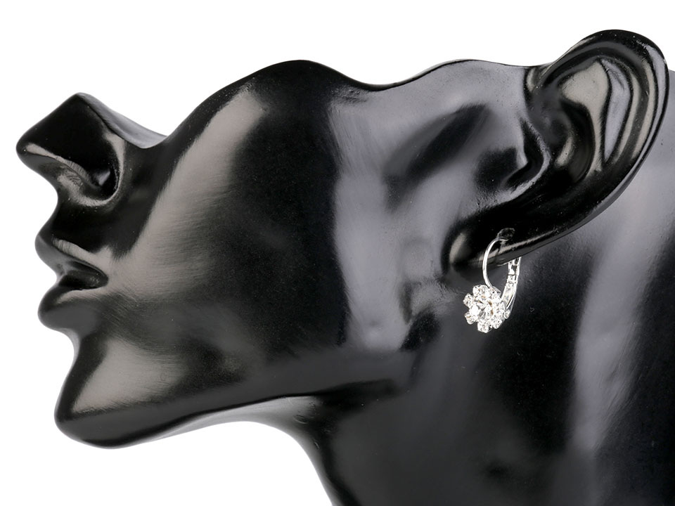 Štrasové květinky mají uprostřed vsazený broušený kamínek. Náušnice jsou vyrobeny z tzv. křišťálového skla, které se vyznačuje vysokým leskem, především při dopadu světla. Skleněné kamínky jsou zasazené do kovového lůžka a při každém pohybu hlavy se třpytí.