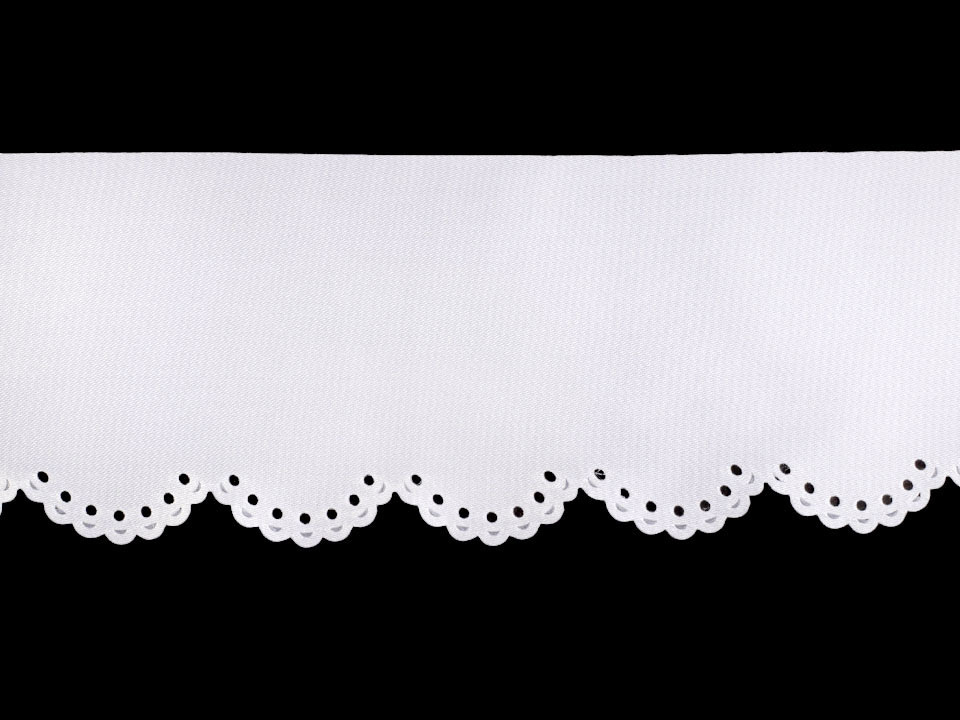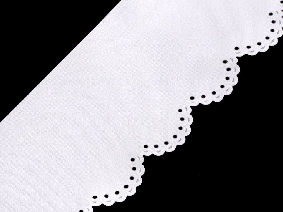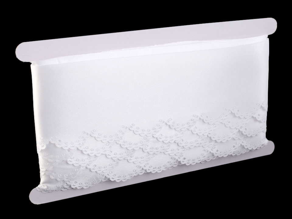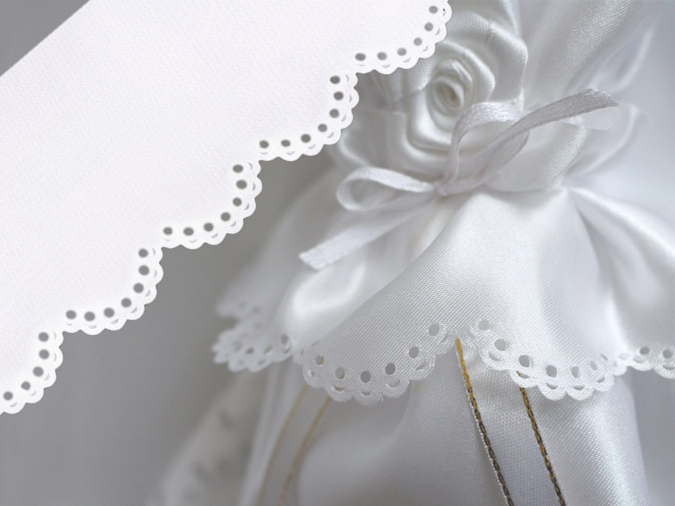 Saténovou krajku zdobí na jednom okraji obloučky s výseky. Svým vzhledem připomíná madeiru. Krajka je z jedné strany lesklá, z druhé matná.