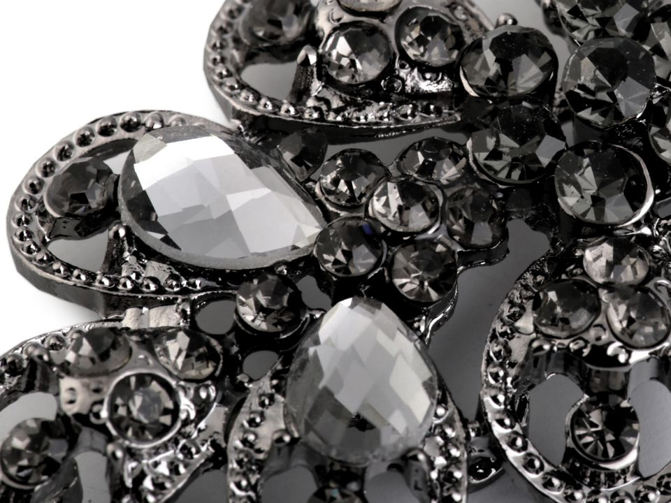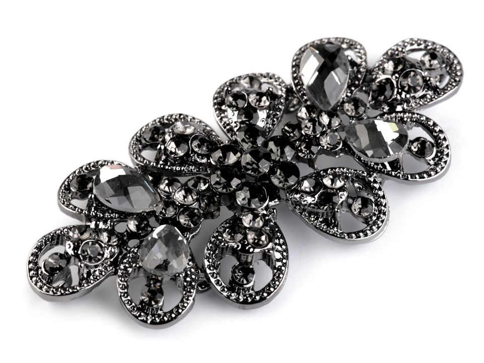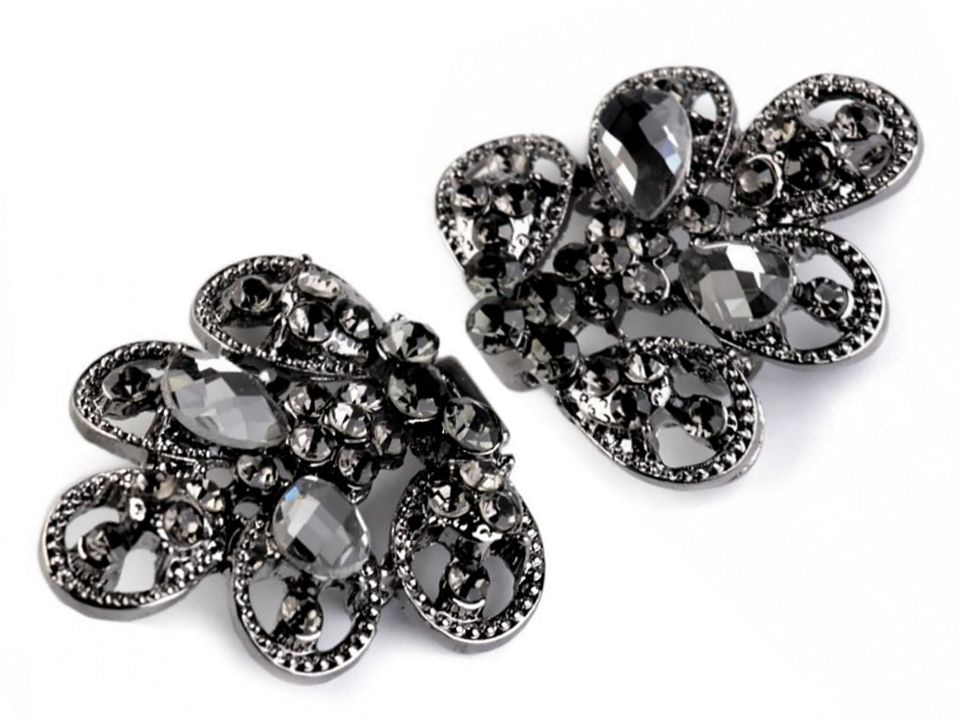 Elegantní štrasové zapínání udělá radost všem, který mají rádi třpytící se šperky. Zapínání se skládá ze dvou částí, které do sebe zaháknete háčkem. Každý díl má 3 očka, za která je jednoduše přišijete. Zapínání je ozdobeno většími broušenými kamínky ve tvaru kapky a doplněno drobnými kulatými broušenými kamínky.