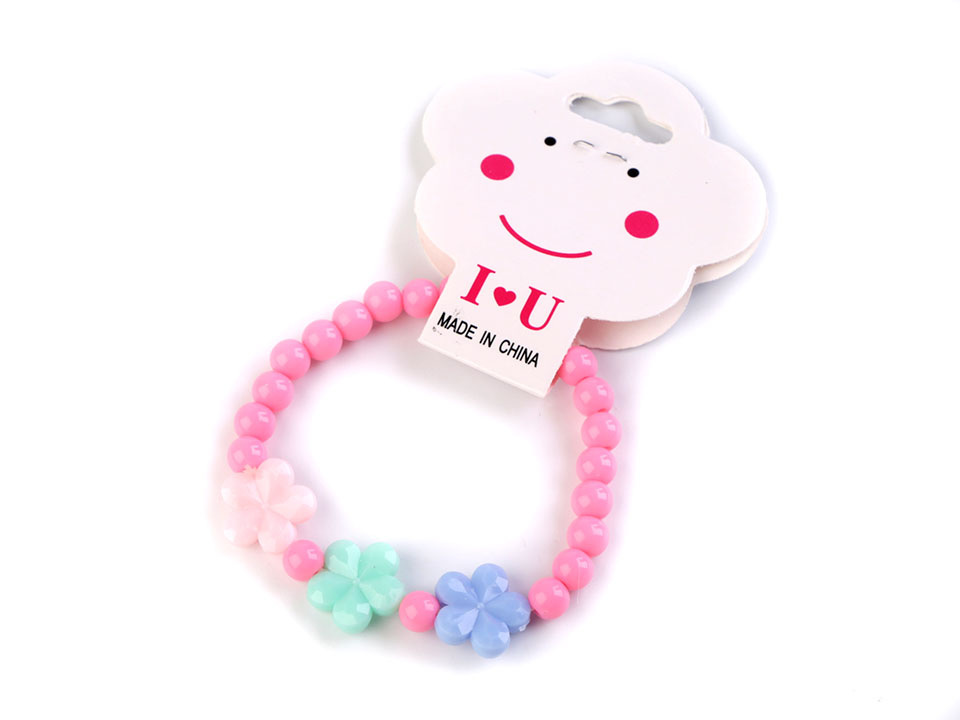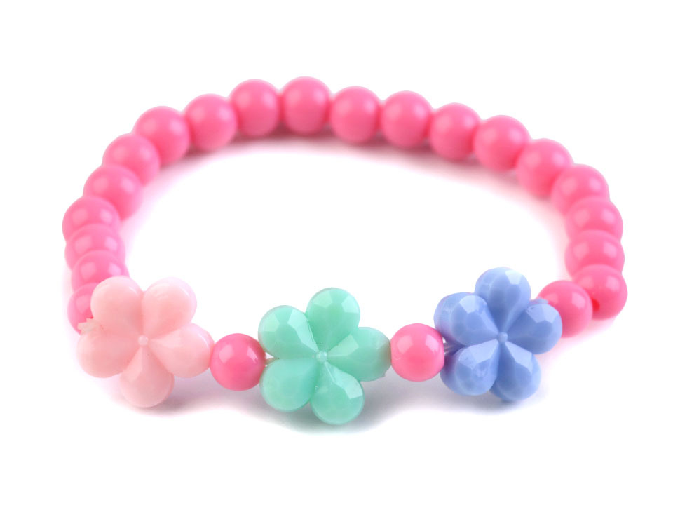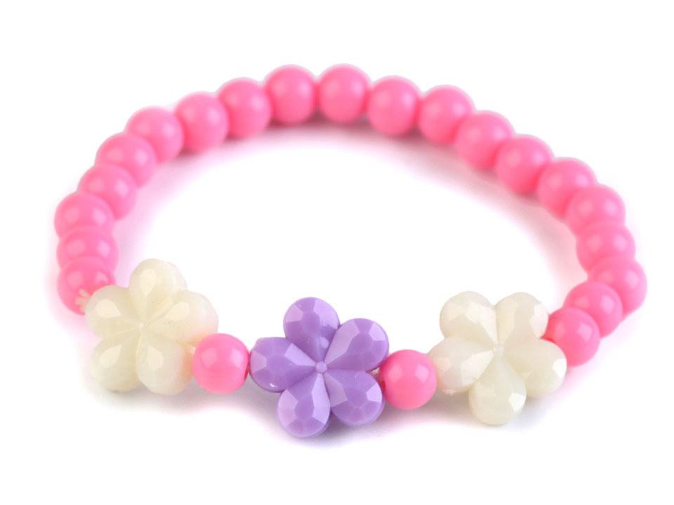 Náramek je vyrobený z plastových květin a korálků navlečených na pružné gumičce. Velice pohodlně se nasazuje na ruku.