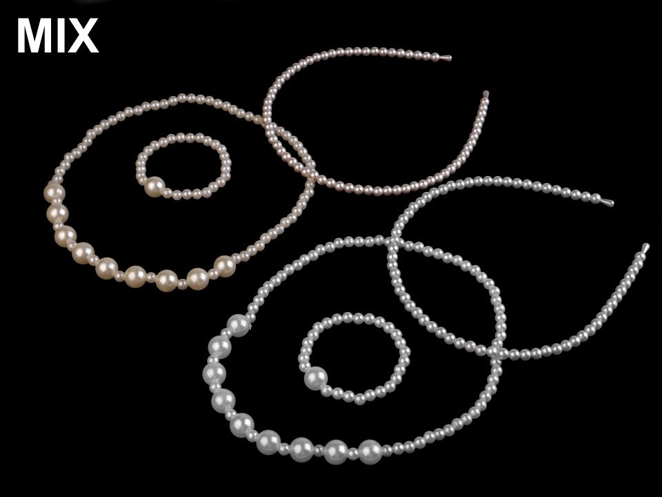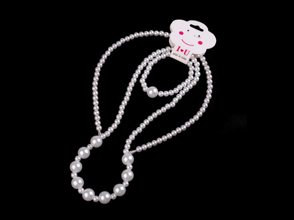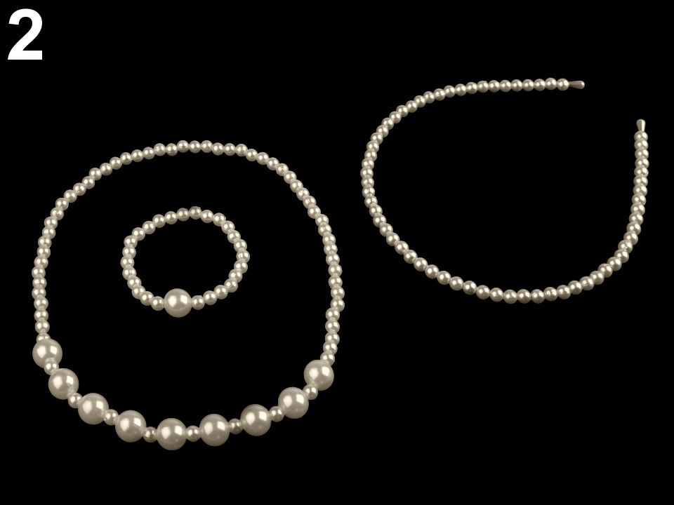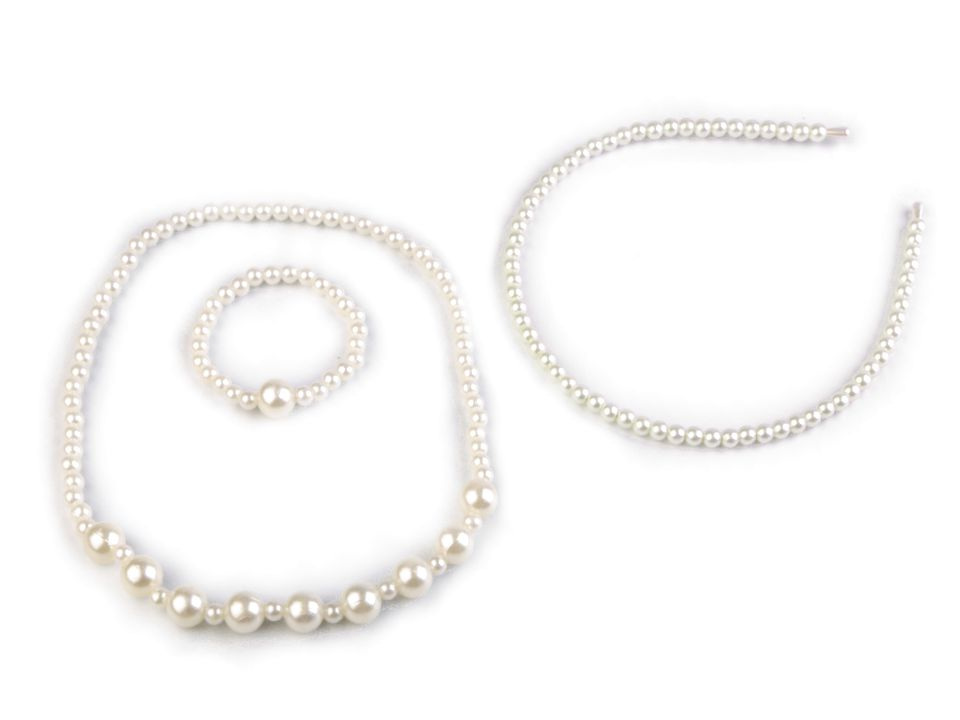 Sada náhrdelníku, čelenky a náramku nadchne děvčátka, které si rády hrají na princezny. Lze ji využít i jako slušivý doplněk ke slavnostním příležitostem. Sada je z plastových korálků, které mají perlový lesk. Náramek i náhrdelník je pružný, vše je navlečené na pružence. Čelenka má na koncích přilepené korálky ve tvaru kapek, děti nikde netlačí.