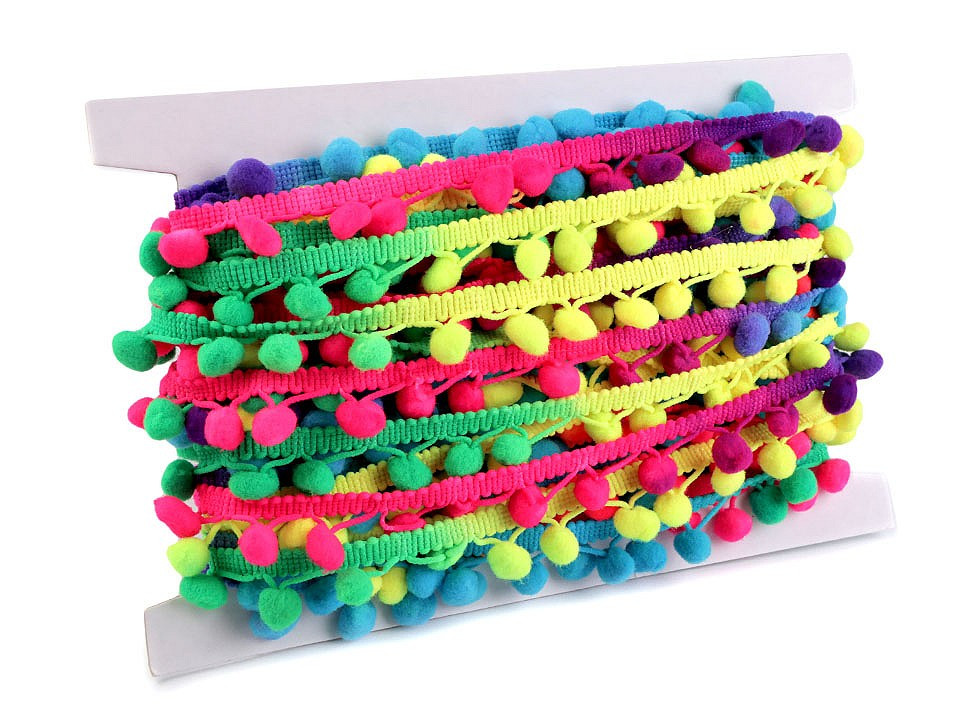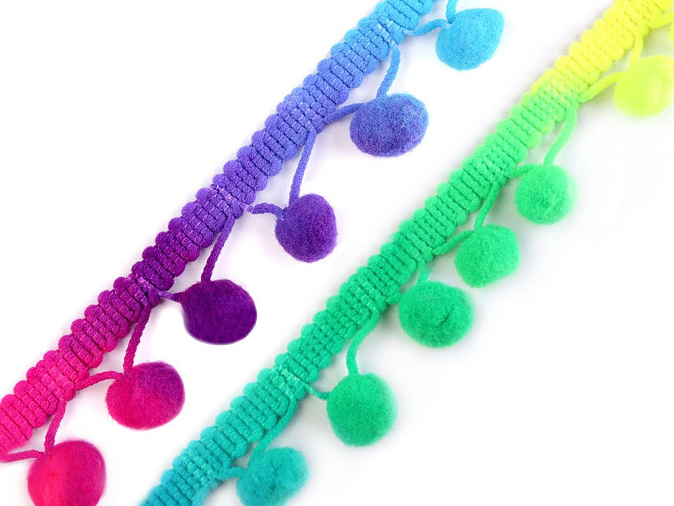Veselý duhový oděvní prýmek s bambulkami můžete použít na dětské oblečení.