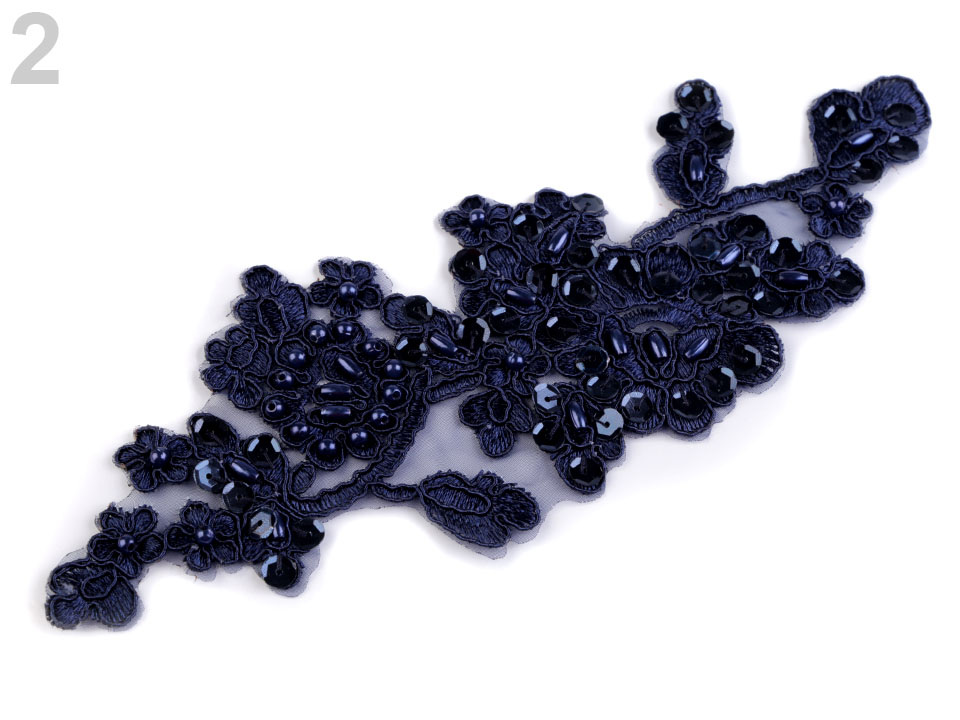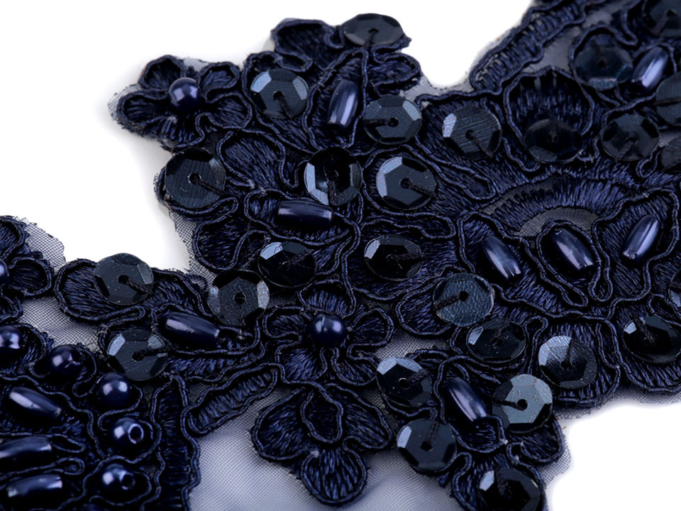 Monofilová vsadka s klasickým květinovým designem je zdobena flitry a perlami, které jsou ve stejné barvě jako vsadka.