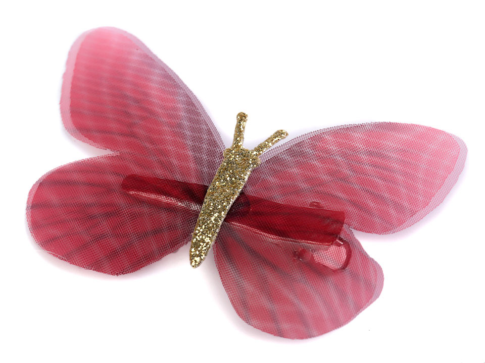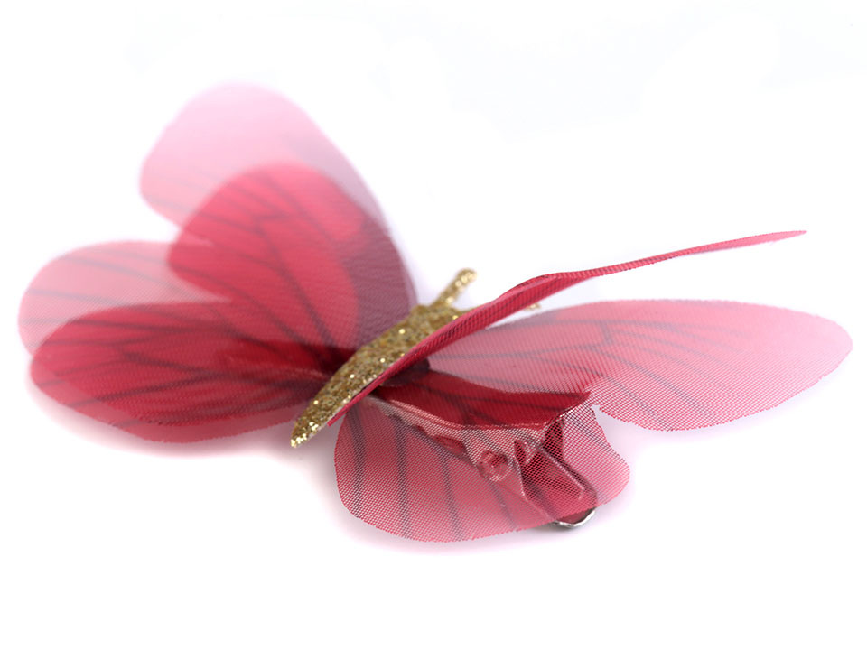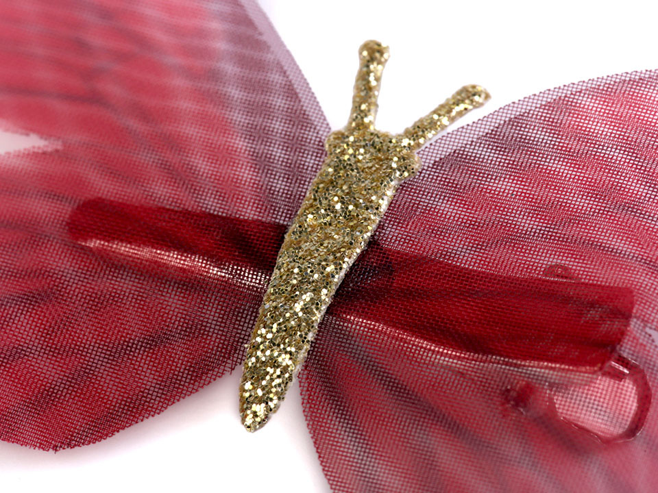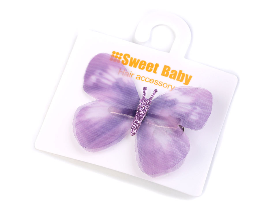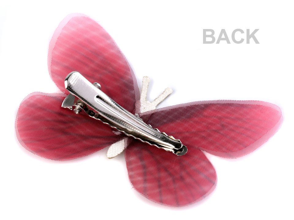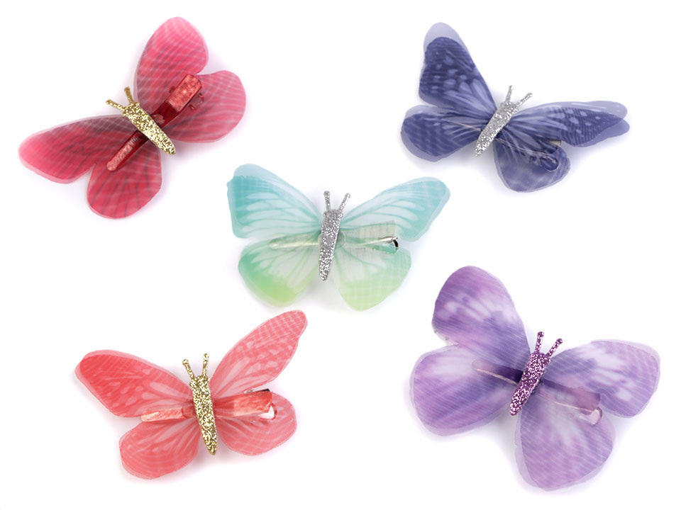Průsvitná křídla mají tónovaný barevný potisk. Tělo motýla je ozdobené třpytivými glitry. Ve spodní části je klips, který ve vlasech díky zoubkům perfektně drží.