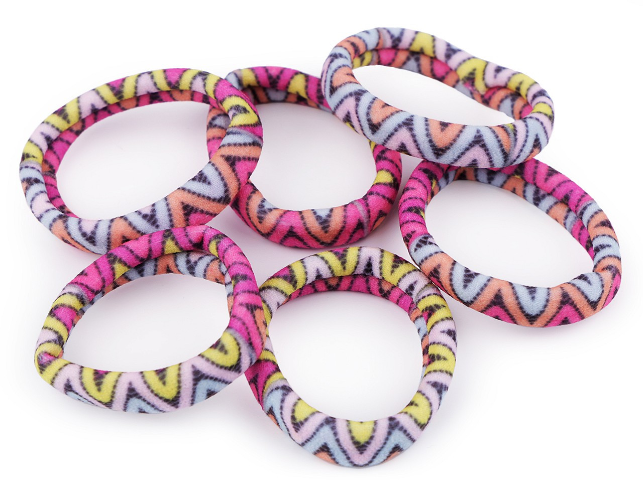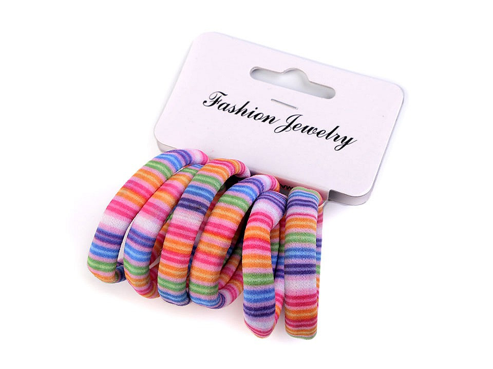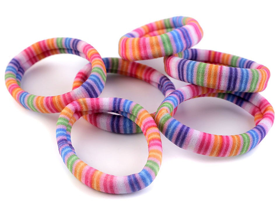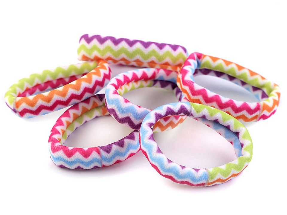Barevné gumičky do vlasů se vzory proužků nebo chevronu.