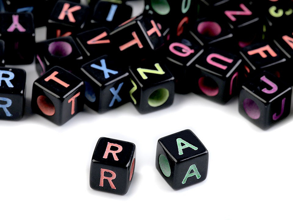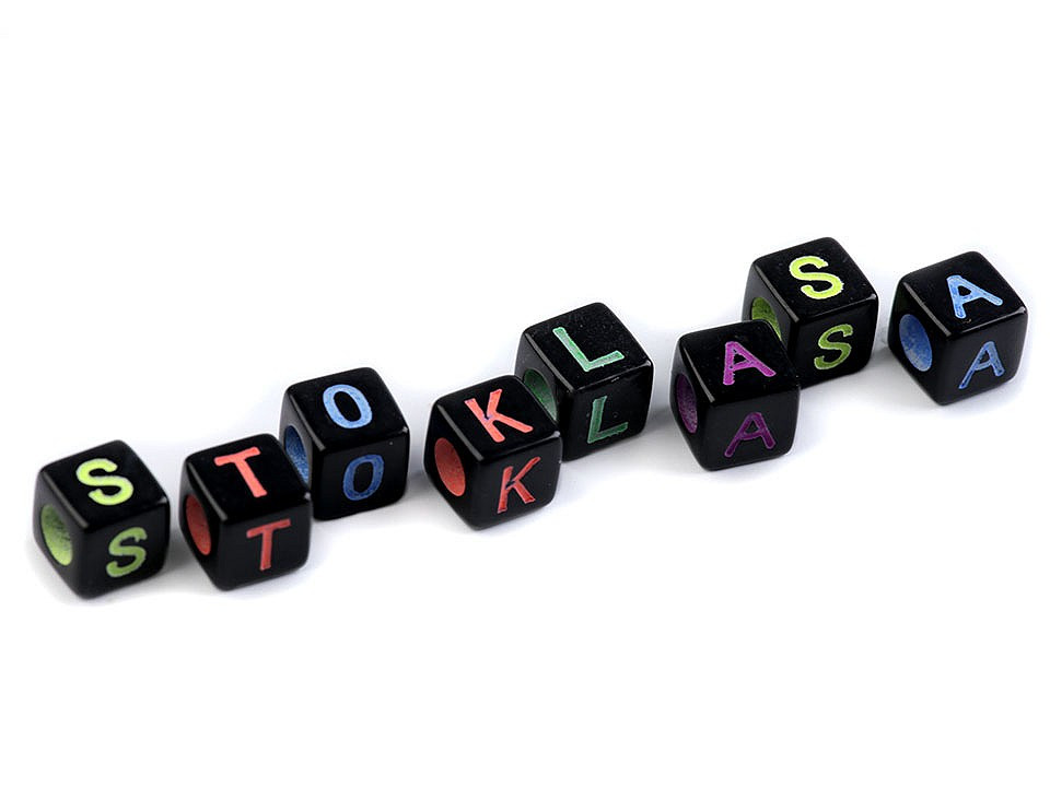 Tělo korálku má černou barvu, písmena a průvlek jsou barevné. Jako návlekový materiál můžete použít pruženky a silony, různé šňůrky, gumičky apod.