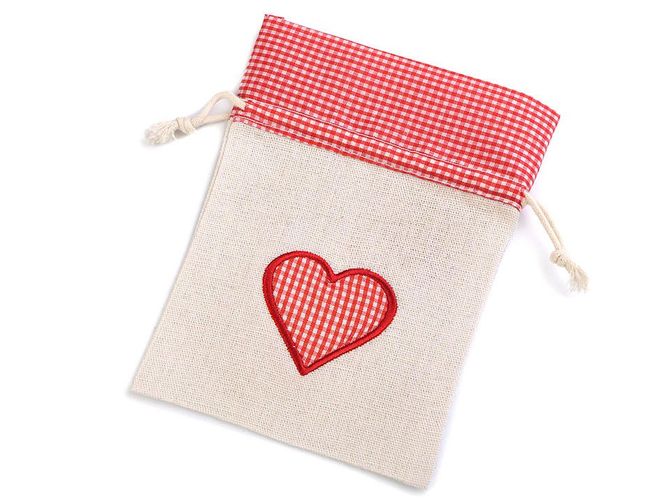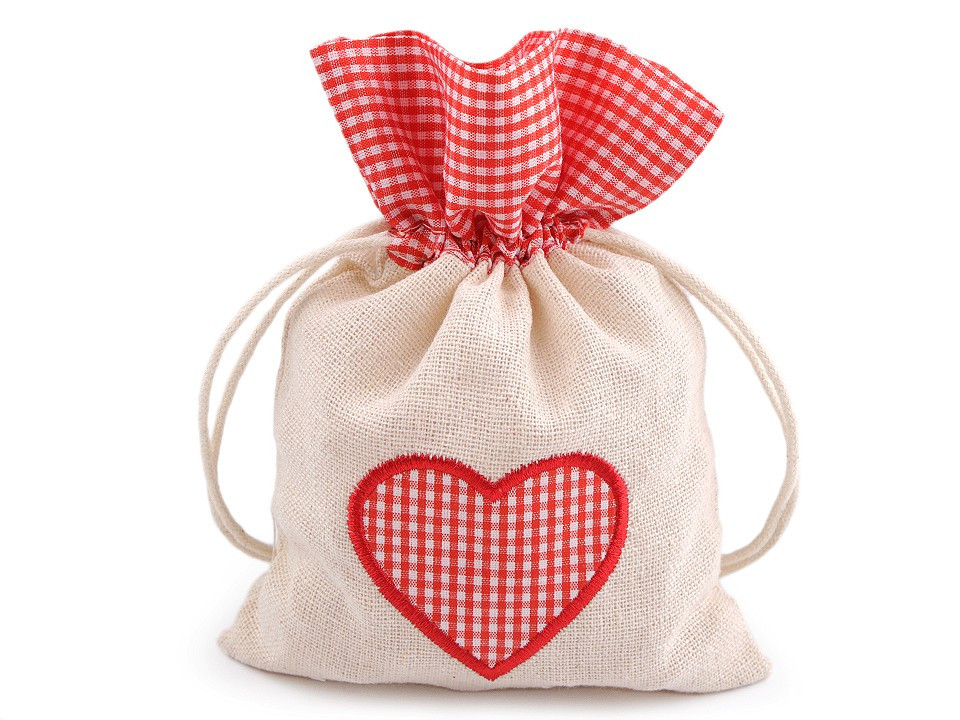 Dárkový pytlík zdobí z jedné strany našité srdce. Pytlík jednoduše uzavřete pomocí dvou stahovacích stuh.