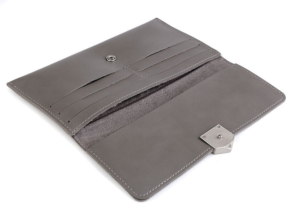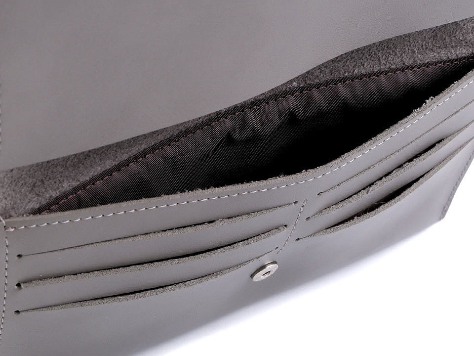 Zavírá se na klopu a patent. Zezadu má kapsičku na drobné mince na zip. Uvnitř je 6 přihrádek na karty a 1 velká na bankovky či mobil.