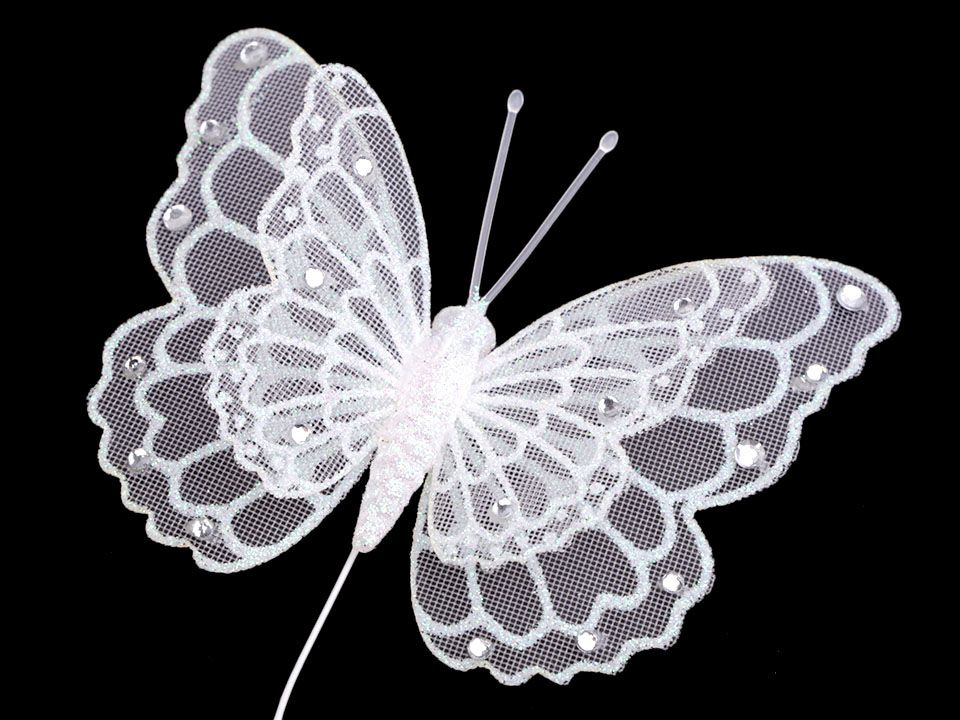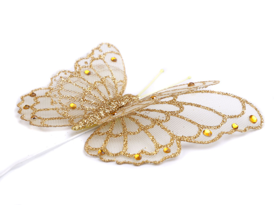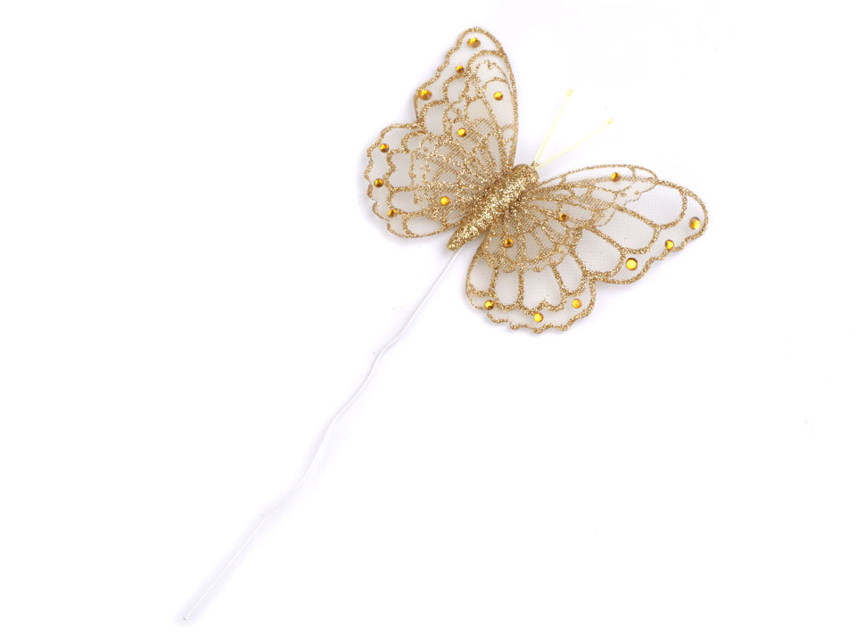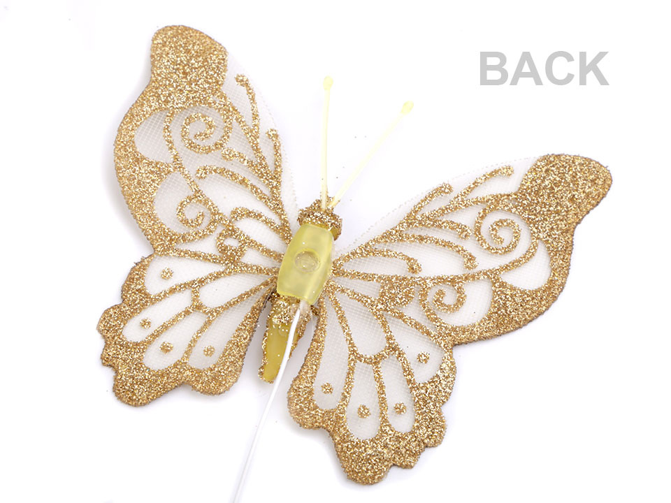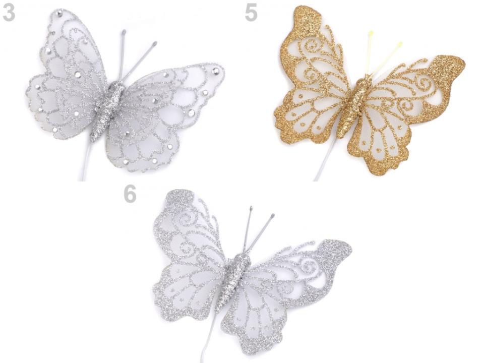 Elegance a půvab motýla vynikne na svatebních dekoracích nebo v květinových vazbách a ikebanách. Oceníte na něm hravost detailů v podobě třpytivých glitrů a broušených kamínků. Díky drátu ho můžete kamkoliv připevnit.