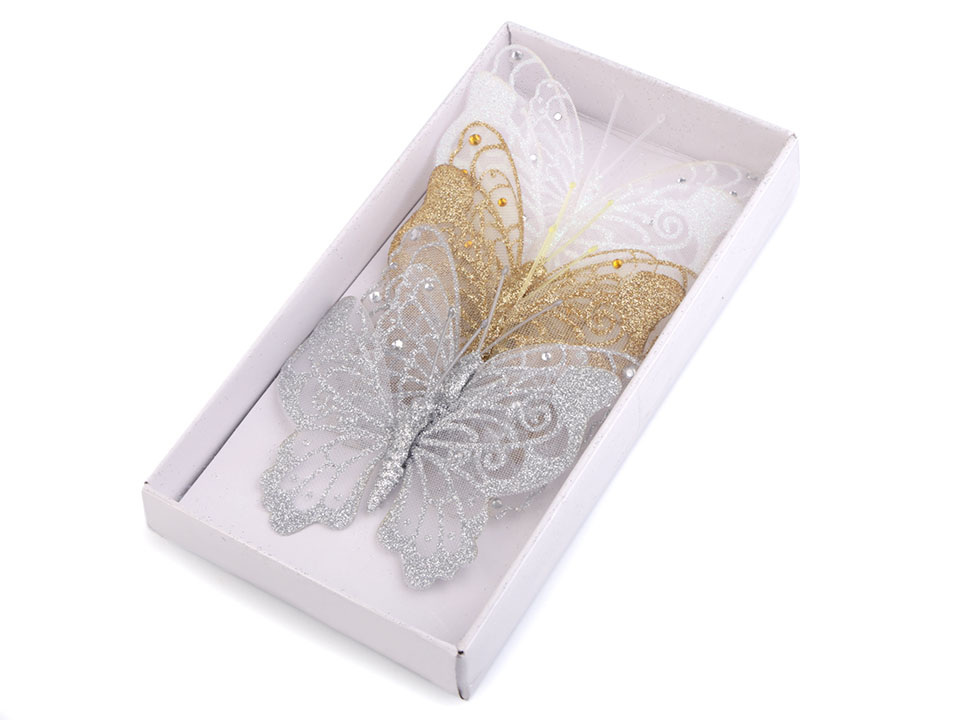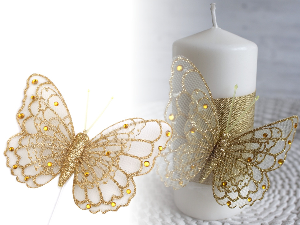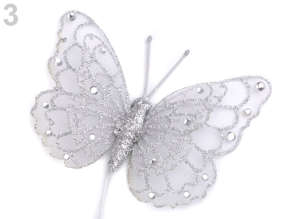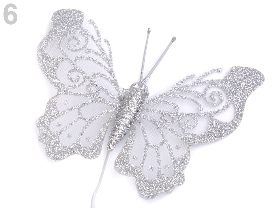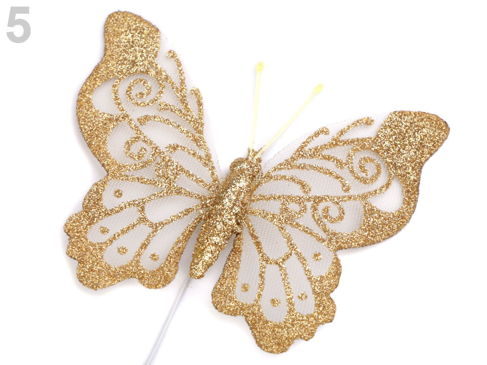 Elegance a půvab motýla vynikne na svatebních dekoracích nebo v květinových vazbách a ikebanách. Oceníte na něm hravost detailů v podobě třpytivých glitrů a broušených kamínků. Díky drátu ho můžete kamkoliv připevnit.