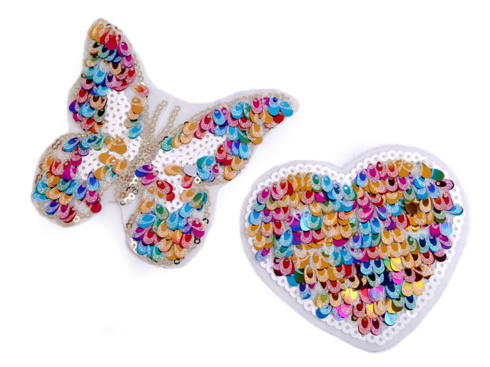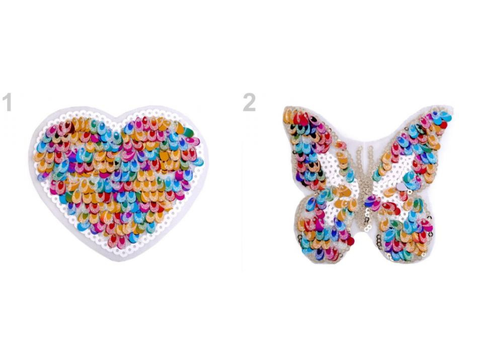 Flitrové nažehlovačky ve tvaru srdce a motýla jsou zajímavé svým designem.