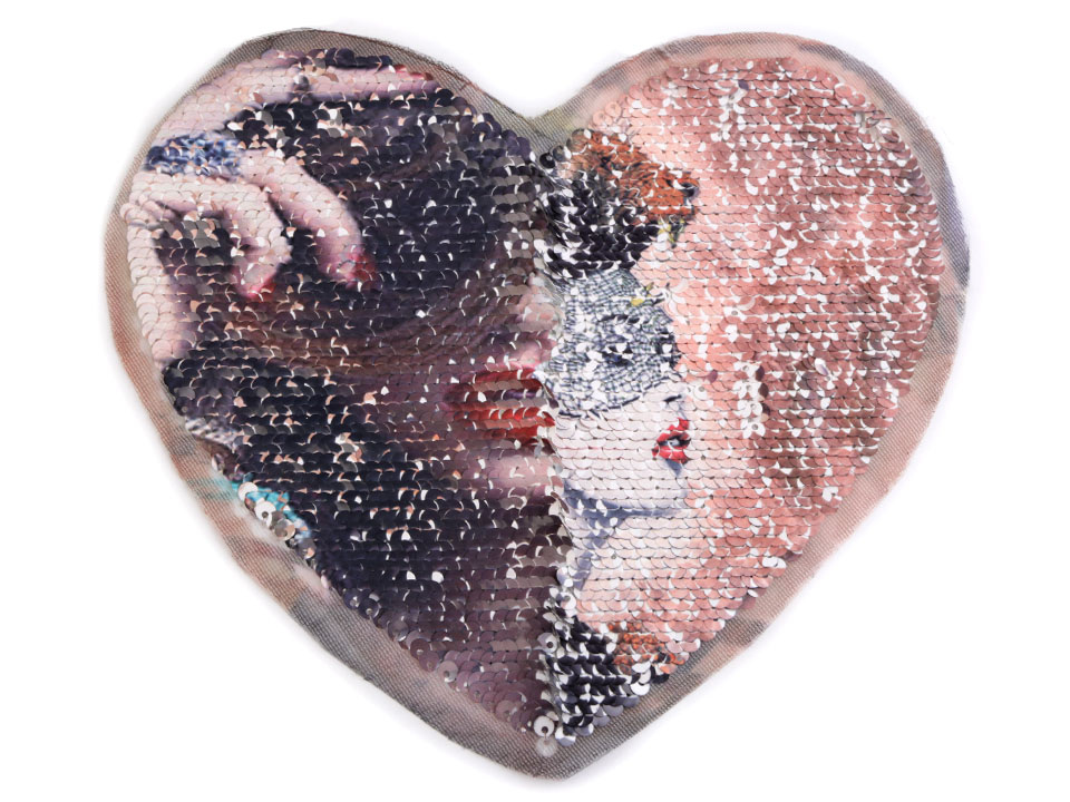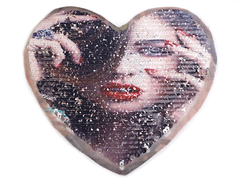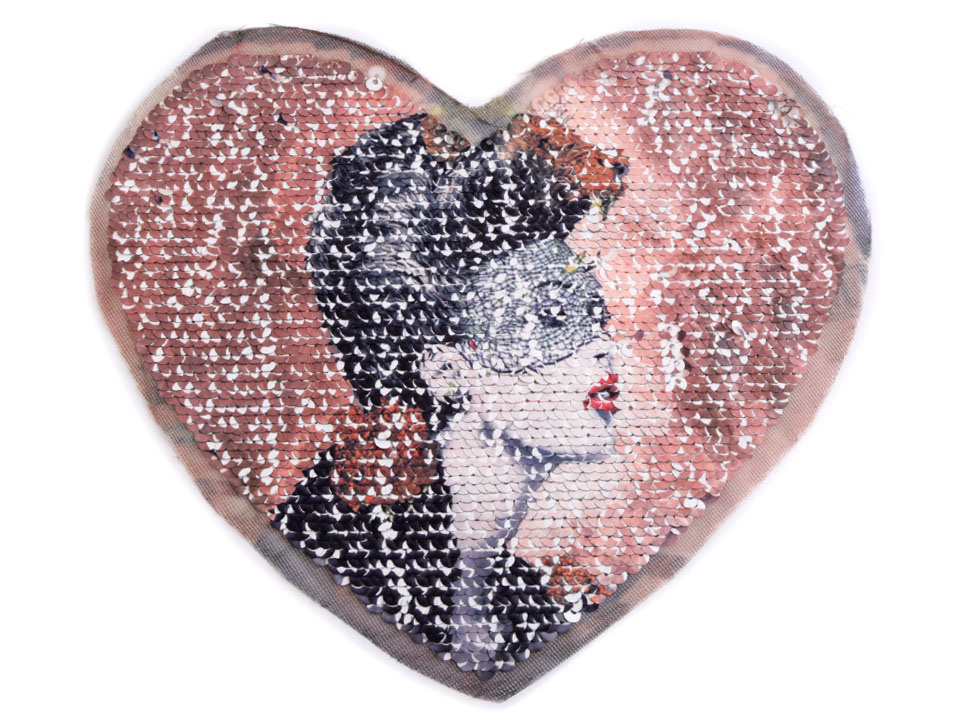 Design nažehlovačky ve tvaru srdce lze měnit dle nálady. Na nažehlovačce jsou totiž našité flitry, kterými po otočení vzniká jiný obrázek.