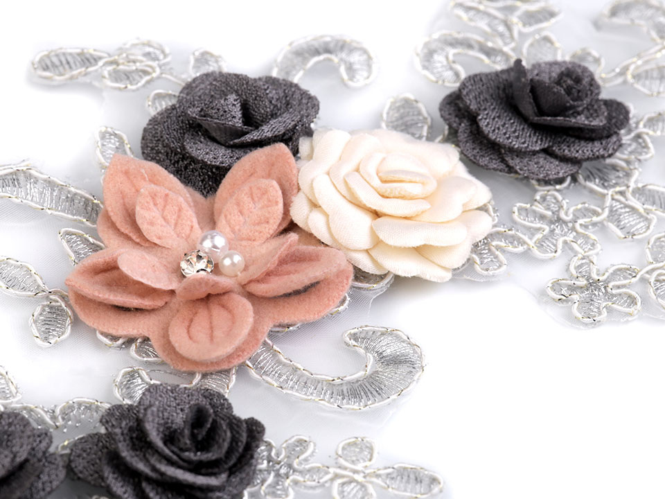 Monofilová vsadka s 3D efektem působí honosně, ale zároveň jemně a elegantně. Monofilový podklad je ozdobený kovovým vláknem, proto se krásně třpytí. Dominantou celé aplikace jsou skládané drobné růžičky a vícevrstvý květ, který je uprostřed ozdobený perličkami a broušeným kamínkem vsazeným v lůžku.