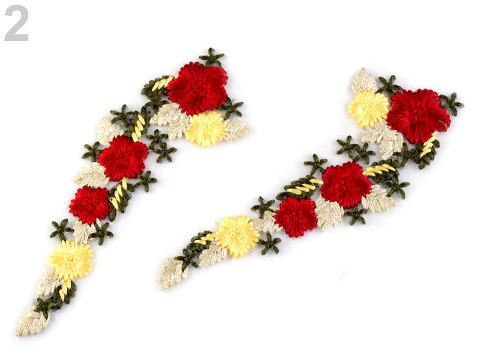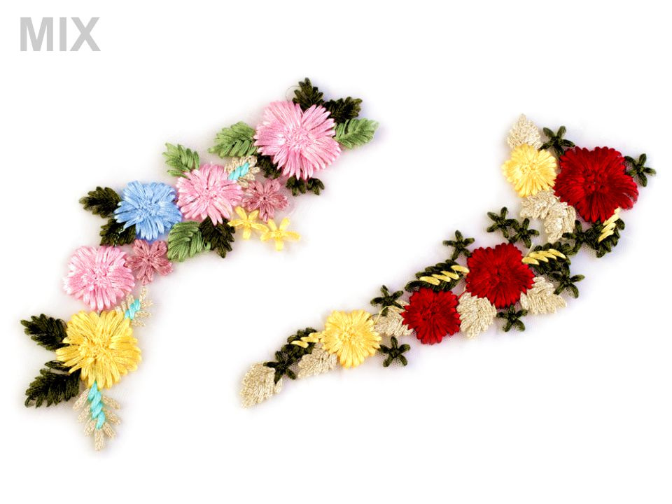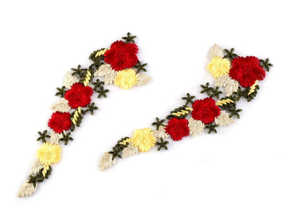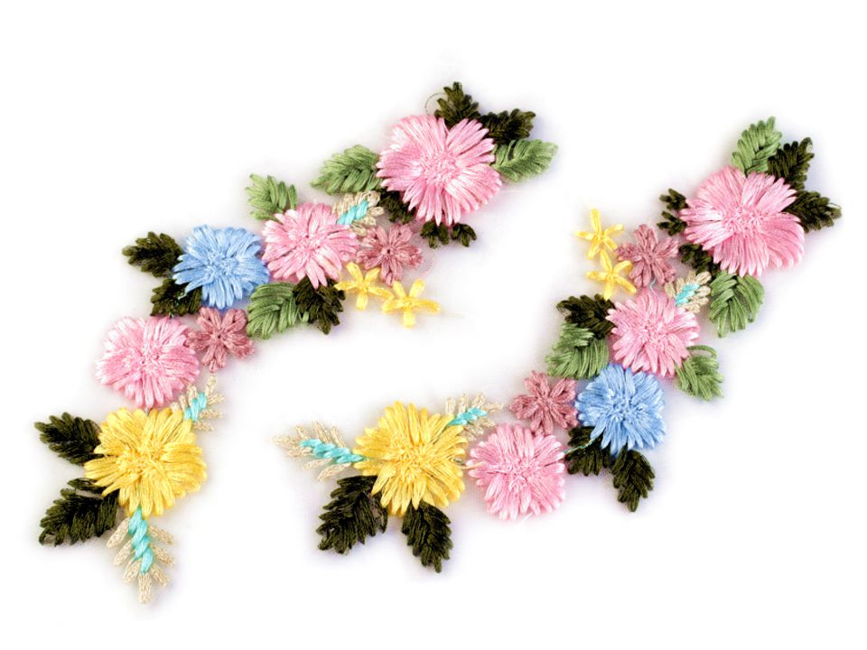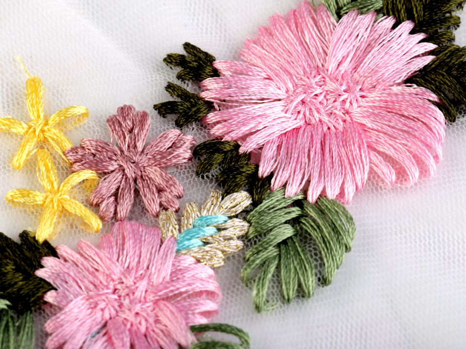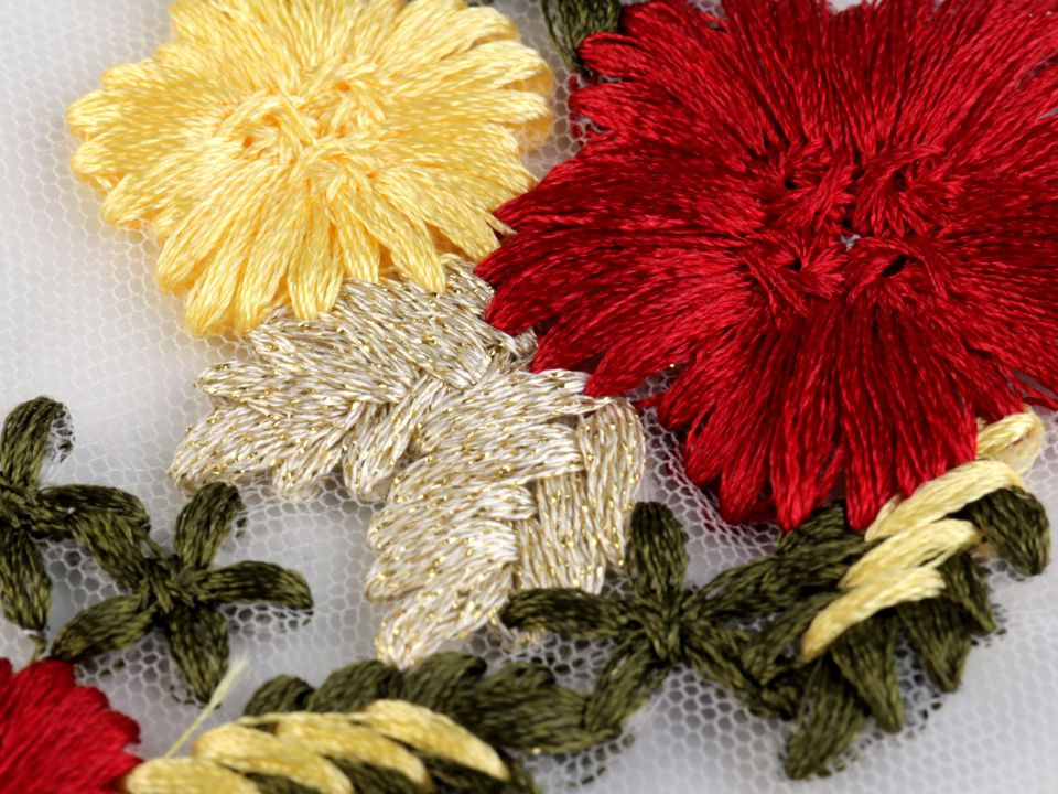 Vyšívaná květinová aplikace na měkkém průsvitném tylu, který se dobře tvaruje. Skládá se ze 2 dílů (pravý a levý díl).