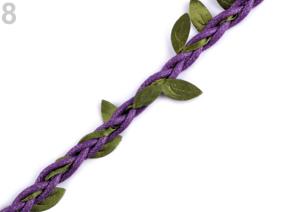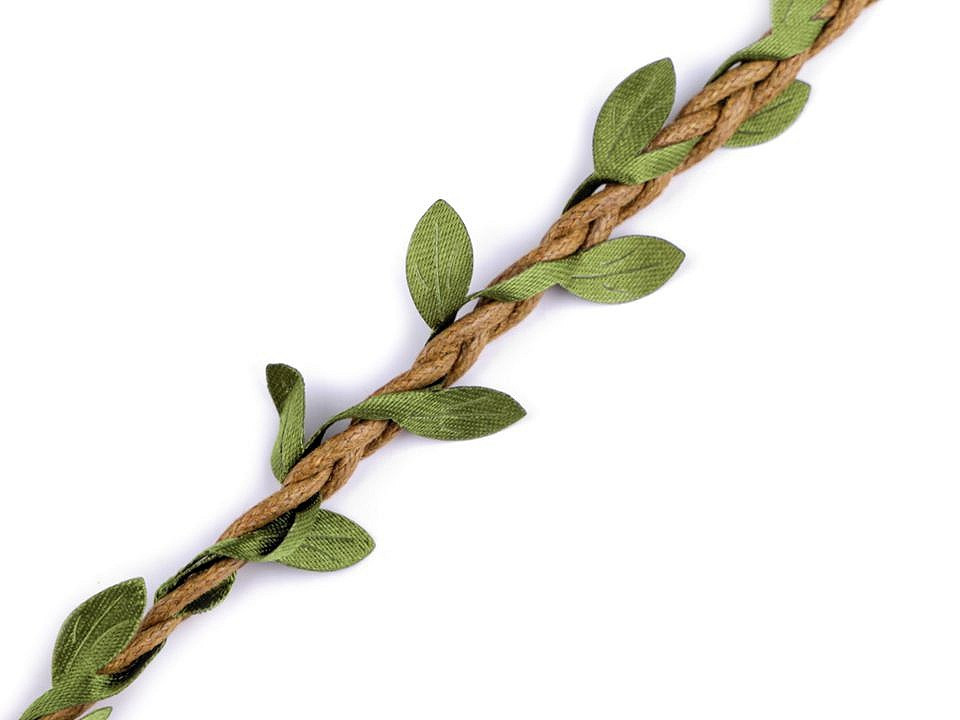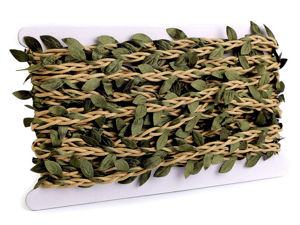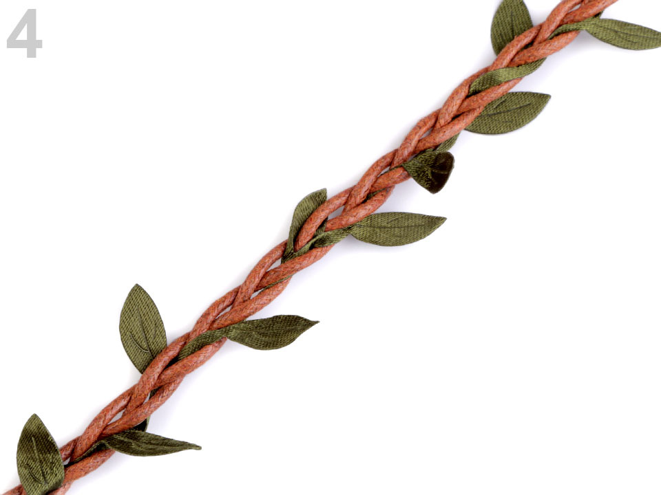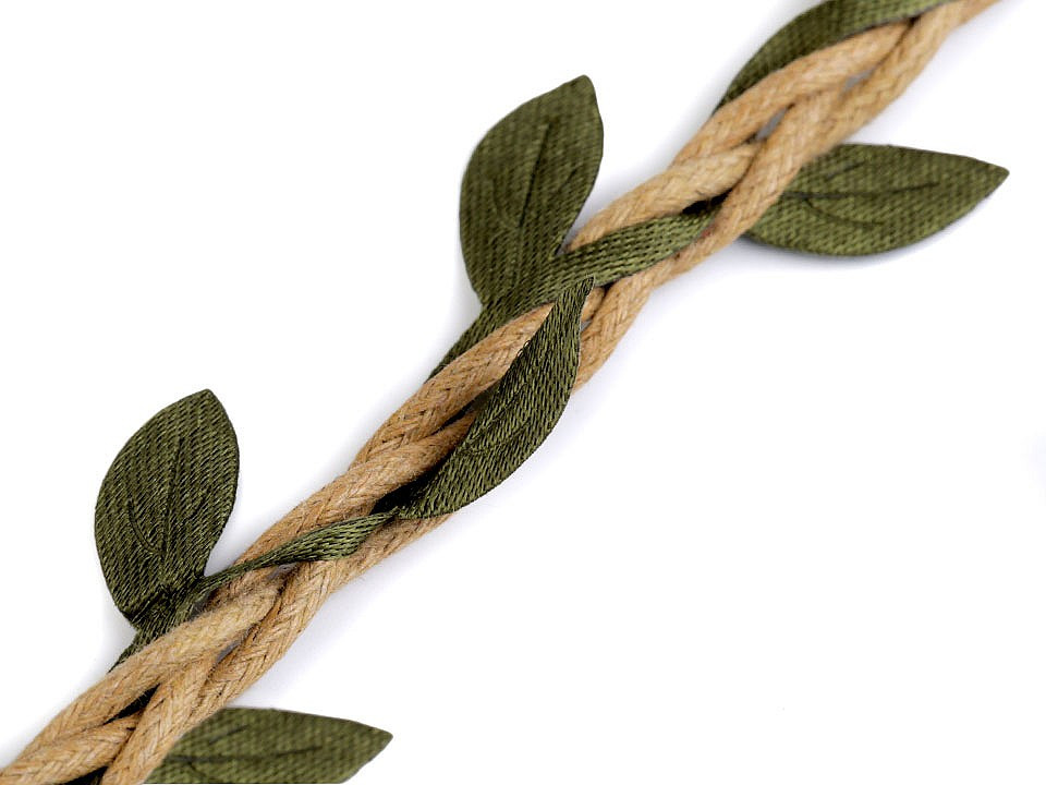 Prýmek s lístečky je vhodný k dekorování. Listy jsou pravidelně vpleteny do bavlněných šňůr.