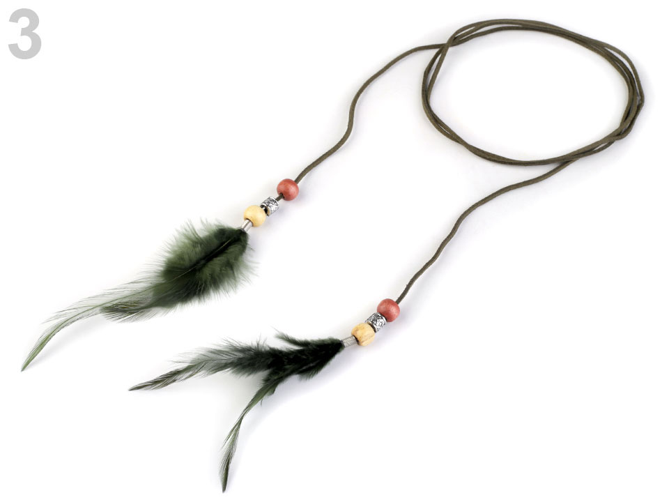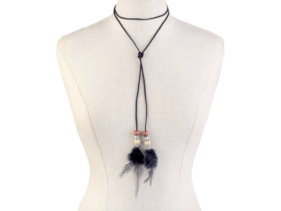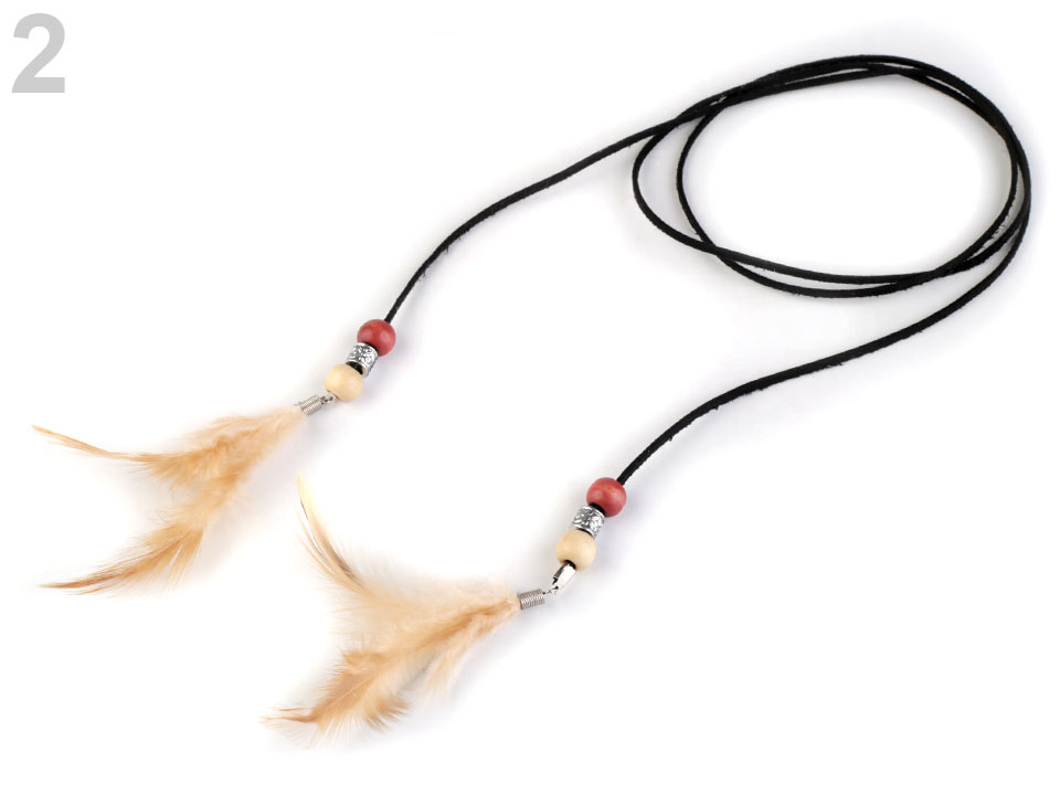Dlouhý náhrdelník choker s pírky a dřevěnými korálky zajímavě doladí váš outfit.