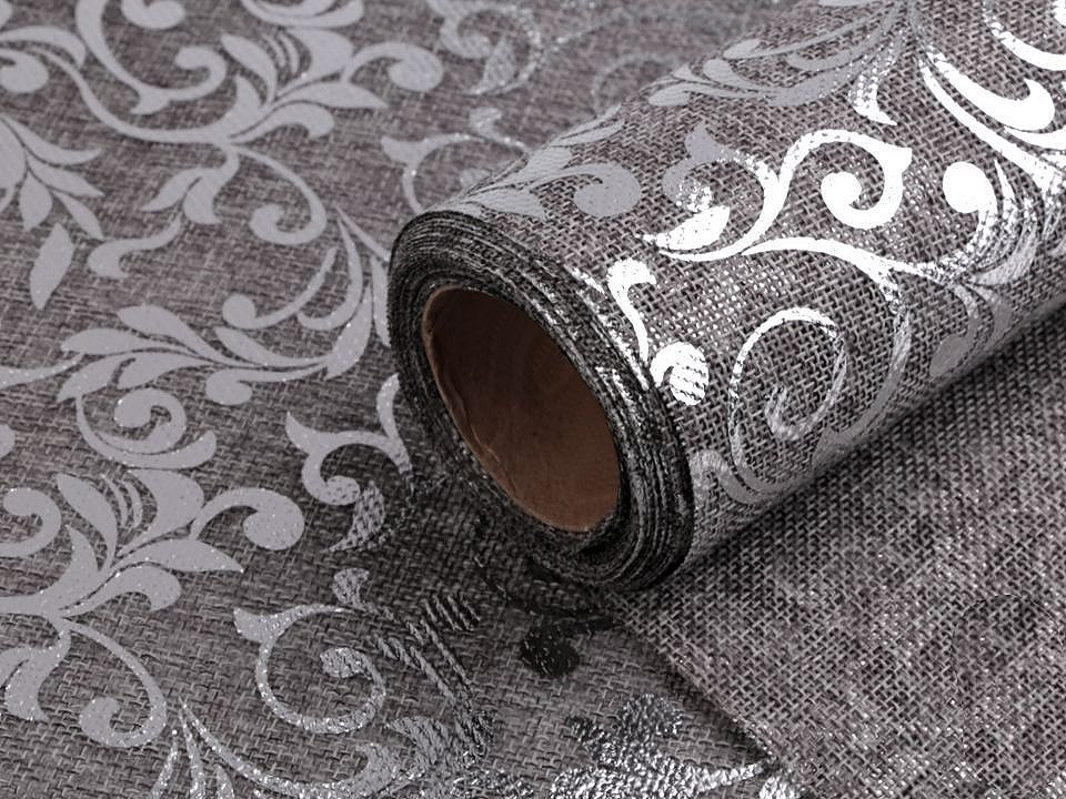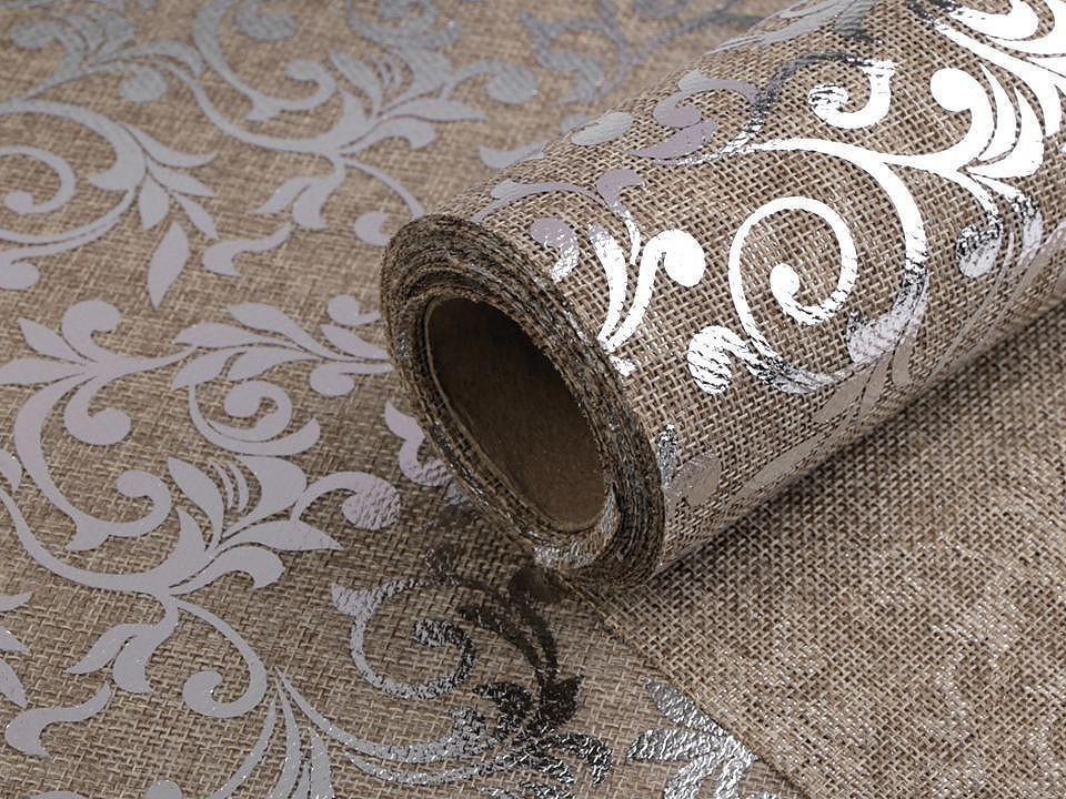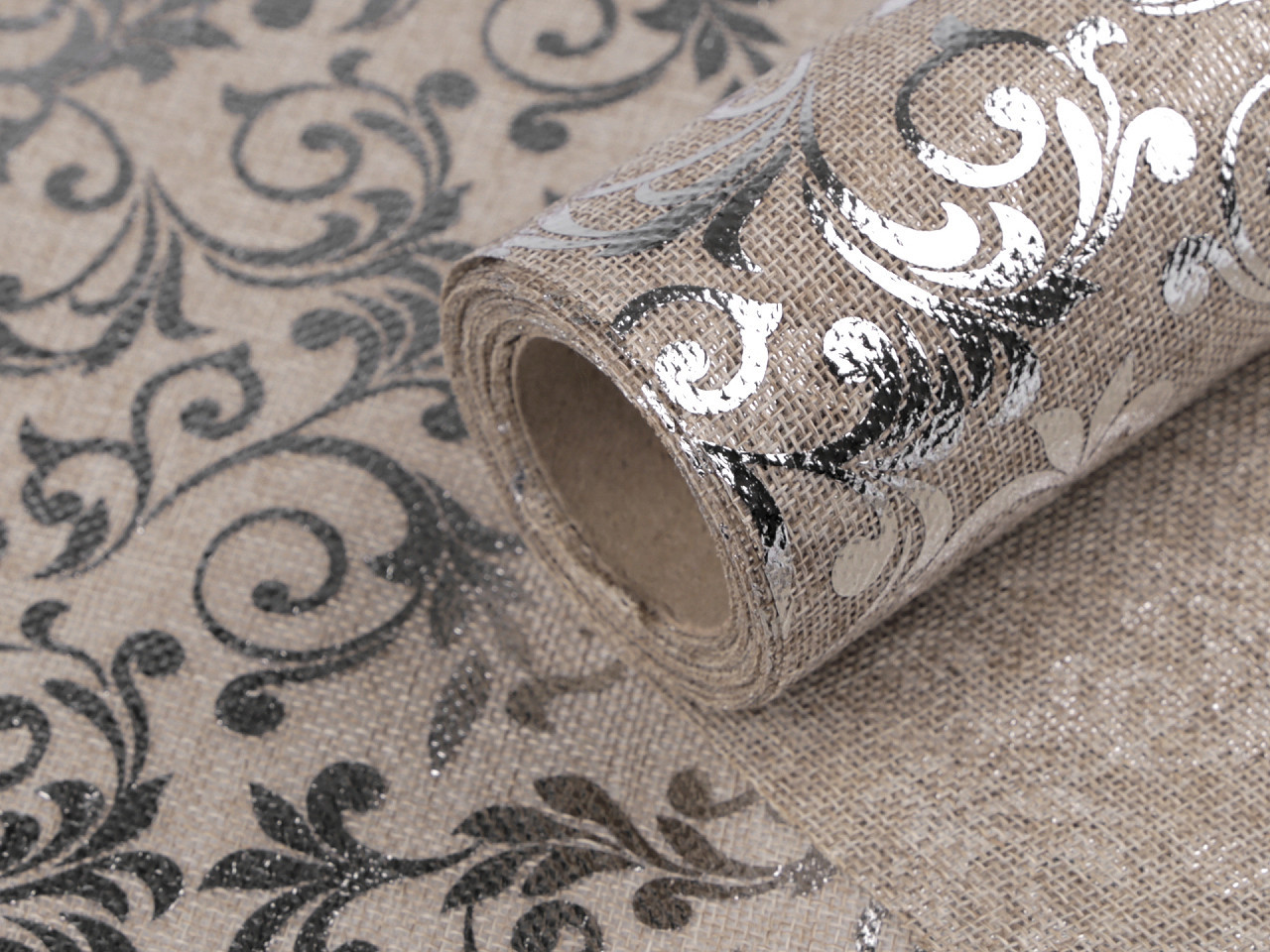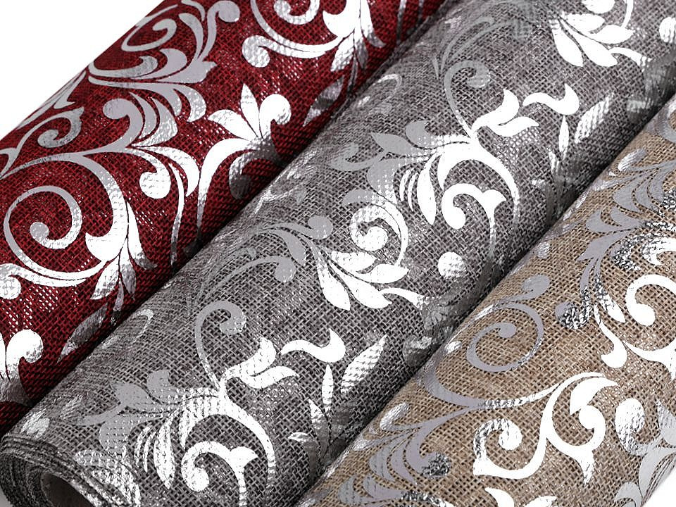 Imitaci juty zdobí lesklé ornamenty. Textilie není obšitá.