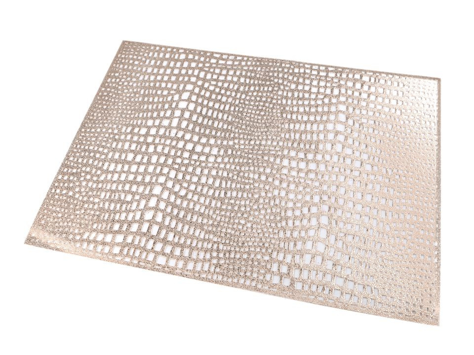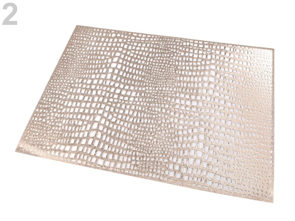 Dekorační prostírání s výseky a metalickým efektem oživí váš interiér. Díky materiálu je snadné na údržbu, lehce se omývá. Prostírání je jednostranné, můžete jej použít také jako dekorační podložku doprostřed stolu.