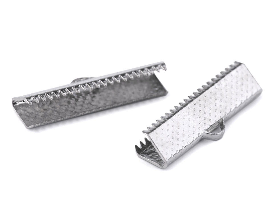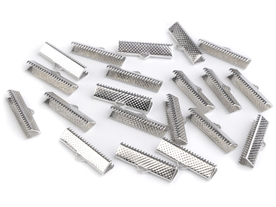 Kovová koncovka na stužku má konce zakončené drobnými zoubky, kterými materiál bezpečně uchytí. Součástí koncovky je i očko 3,5 x 1,5 mm (šíře x výška), na které můžete připevnit řetízek nebo provázek.