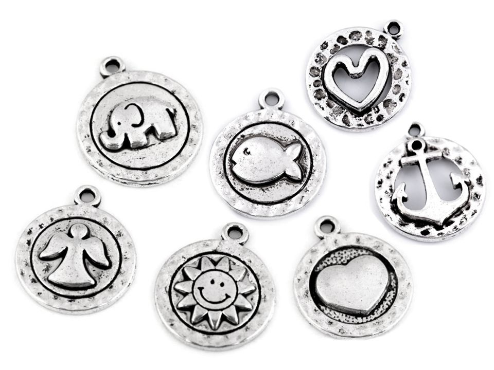 Přívěsky jsou s různými designy, ze kterých si určitě vyberete. Mají kulatý tvar a jsou jednostranné.