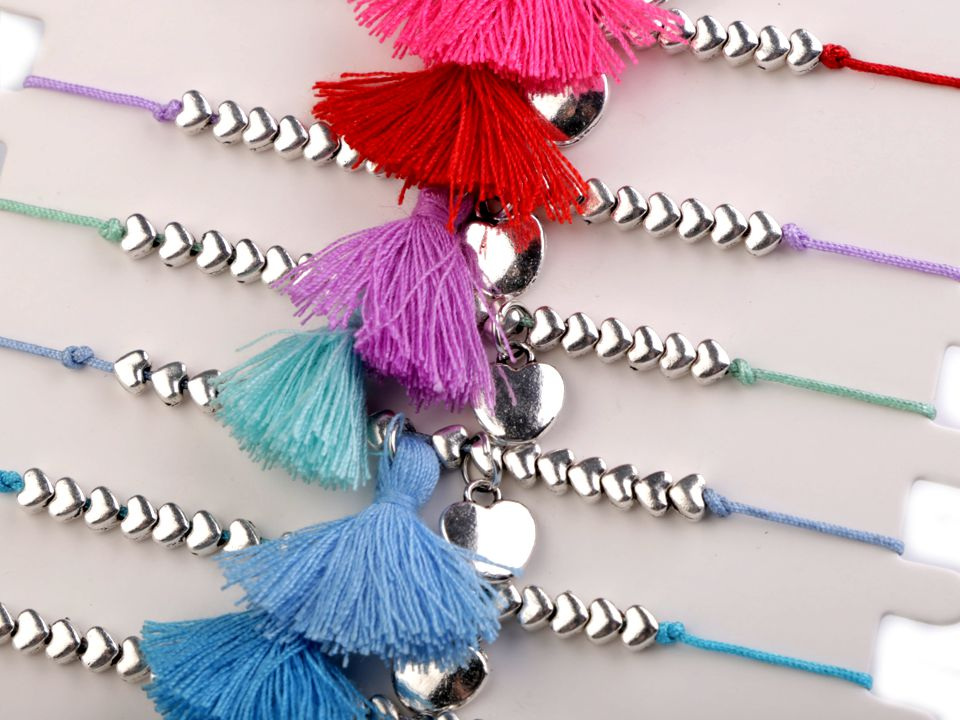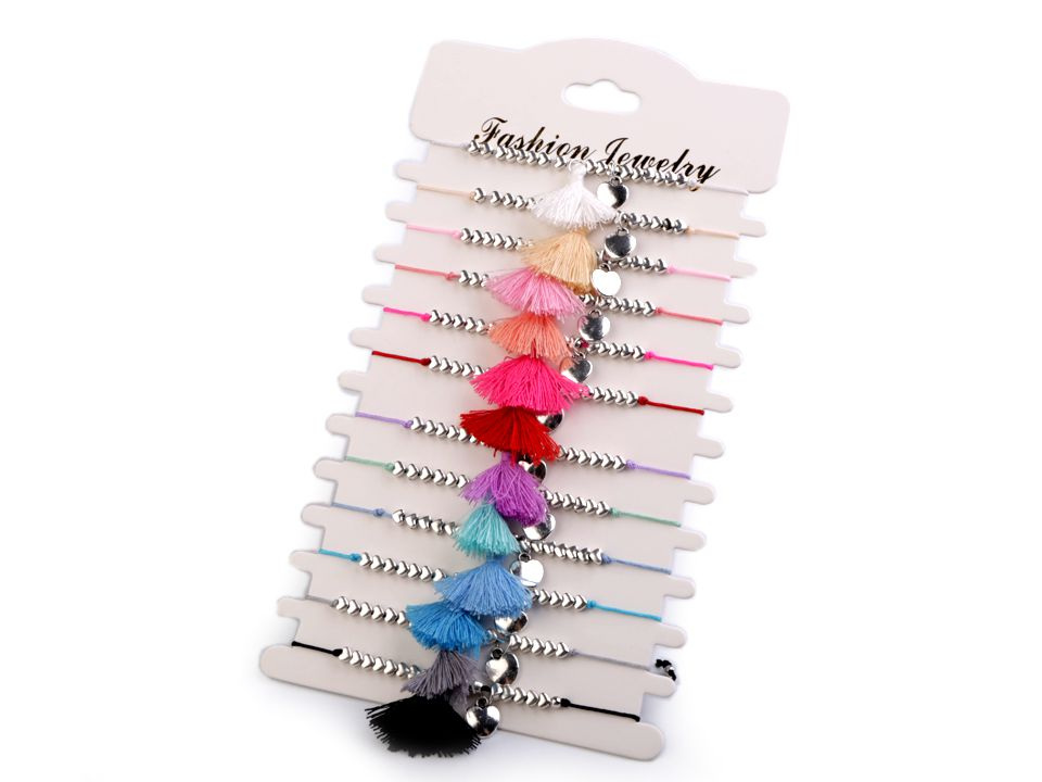Náramky se střapečkem a srdíčkem jsou stylovým doplňkem letního outfitu. Hodí se jak k šatům, tak k halenkám, tričkům i plavkám. Prodávají se jako sada 12 ks na papírové kartě k zavěšení, každý náramek má jinou barvu.
