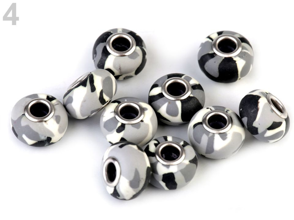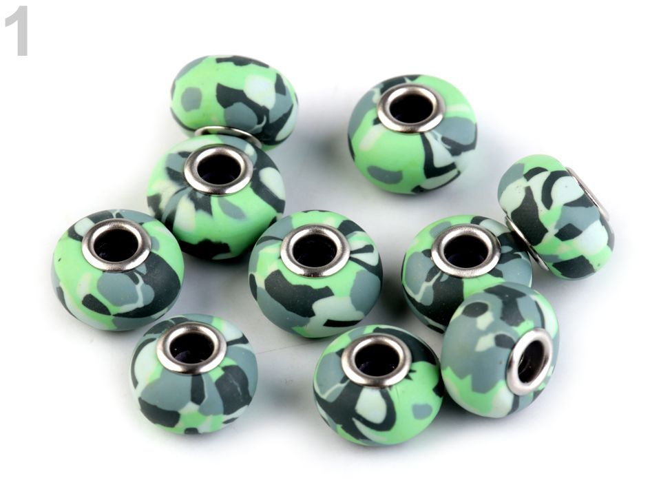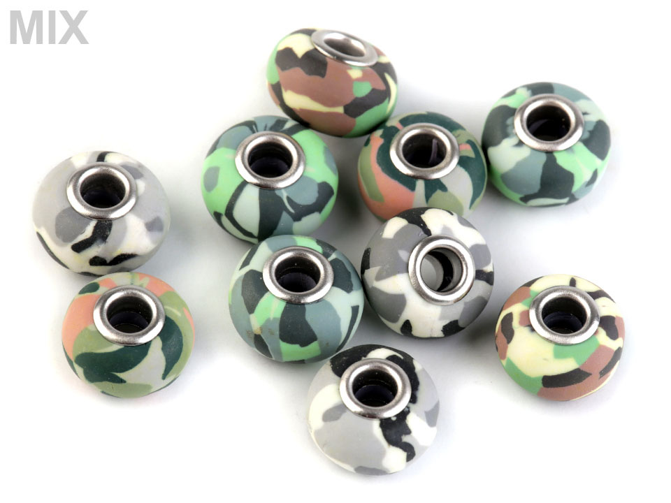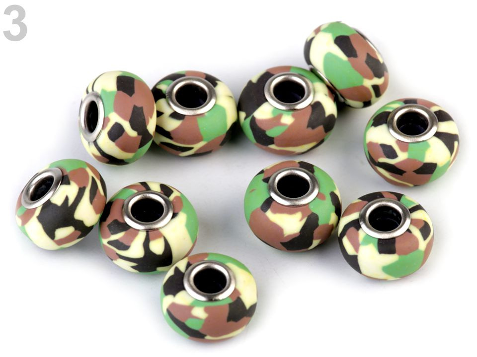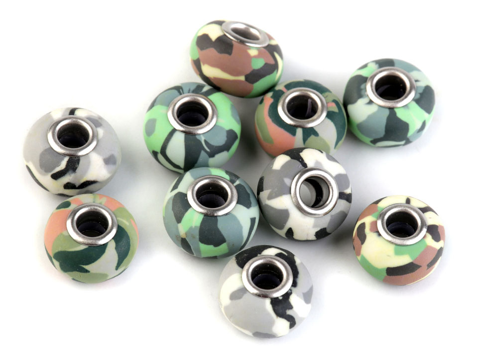 Maskáčové fimo korálky s velkým průvlekem. Průvlek je začištěný kovovou průchodkou.