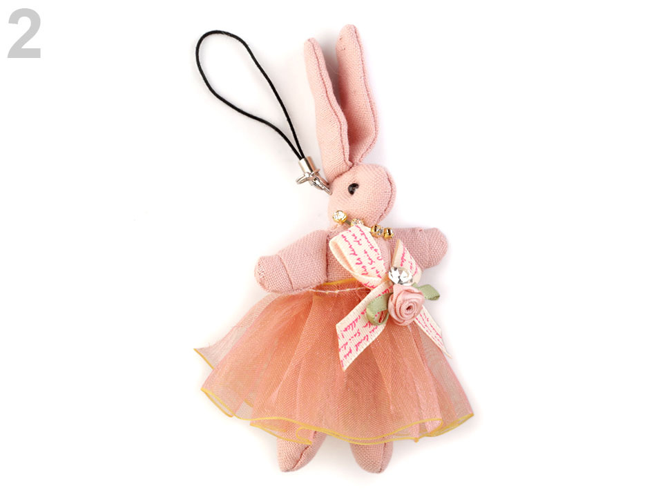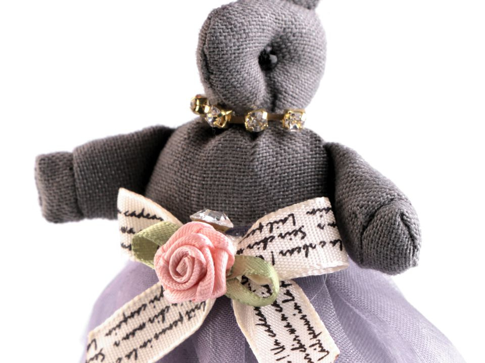 Zaječí slečna je ozdobená sukničkou s mašlí a růžičkou s broušeným kamínkem. Štrasové kamínky má i okolo krku. Je zavěšená na odepínacím poutku.