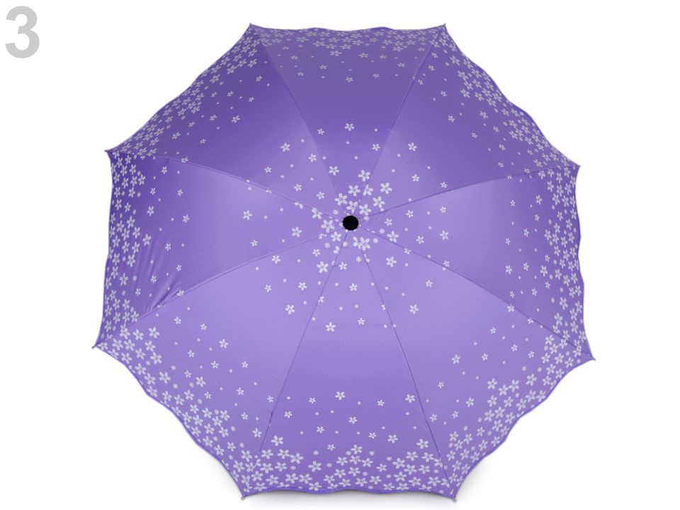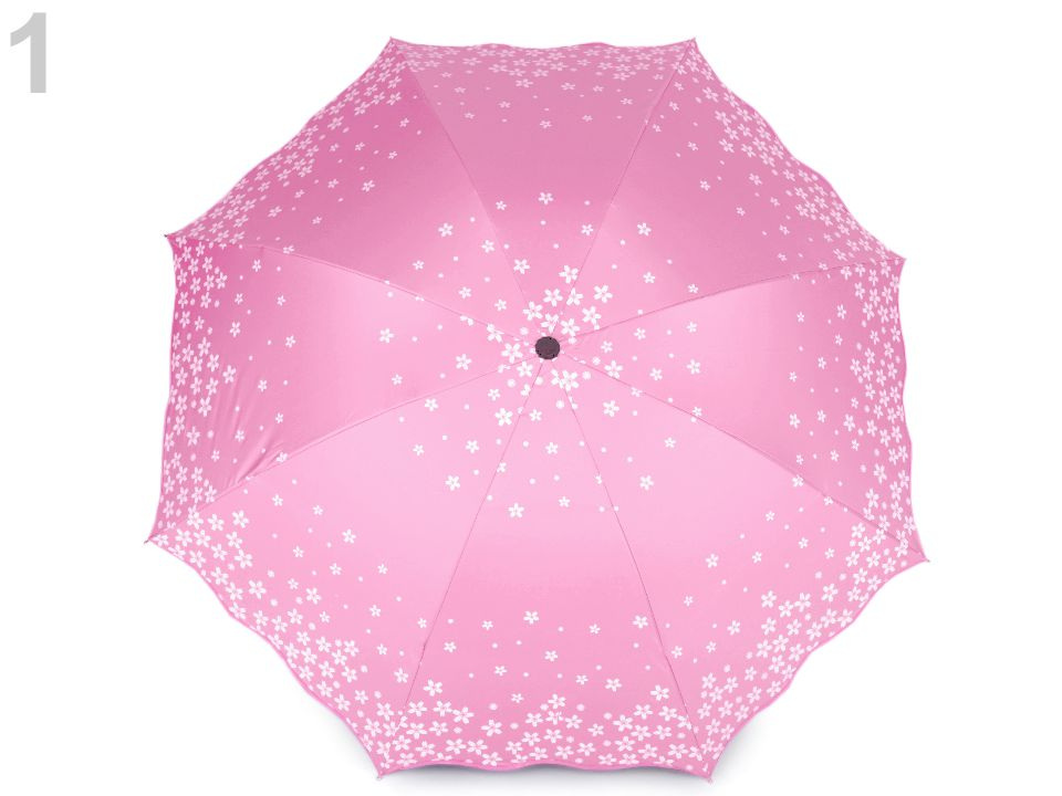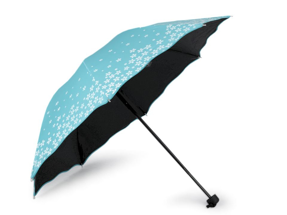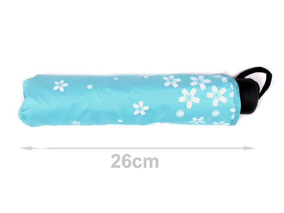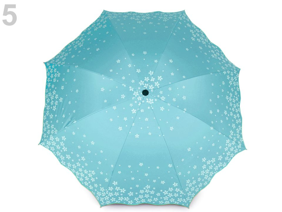 Dámský skládací deštník s potiskem drobných bílých květů má elegantně vykrojené okraje.